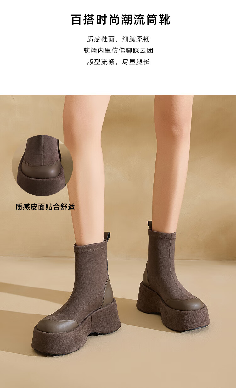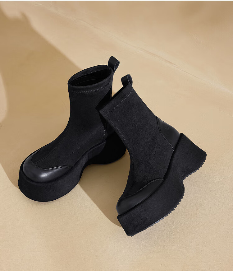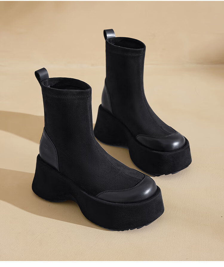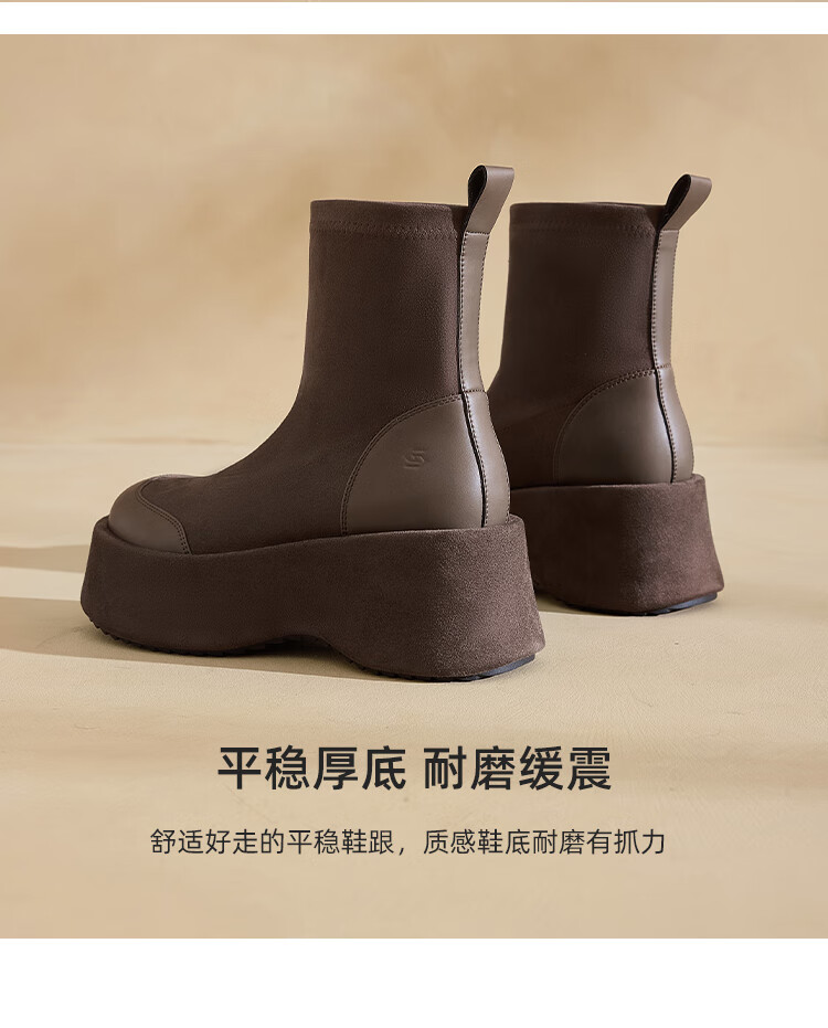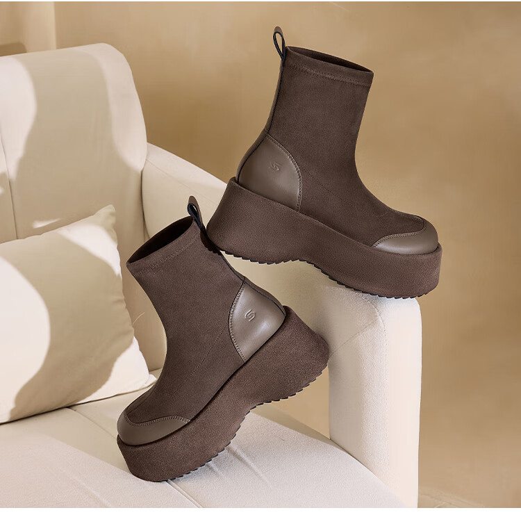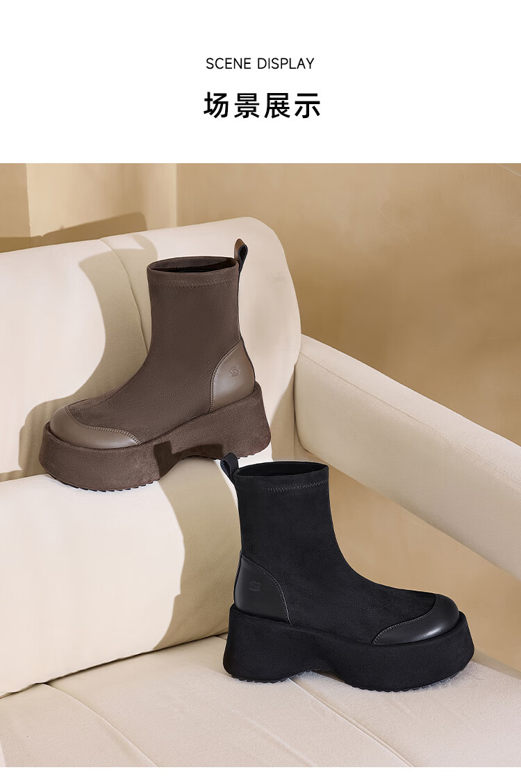 星期六(St&Sat)显瘦弹力靴女2025秋冬新款百搭气质袜靴厚底瘦瘦靴增高女靴 黑色【加绒款】 38