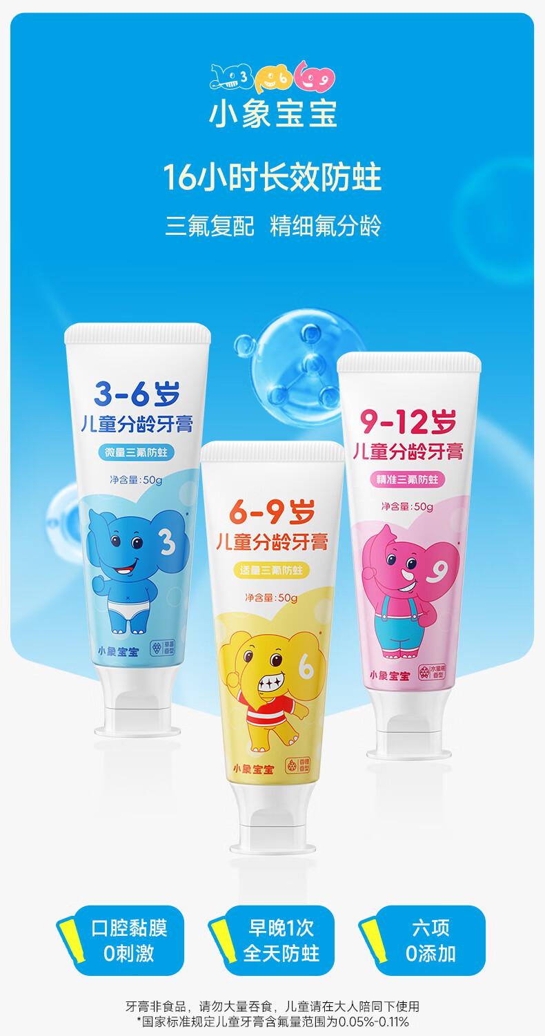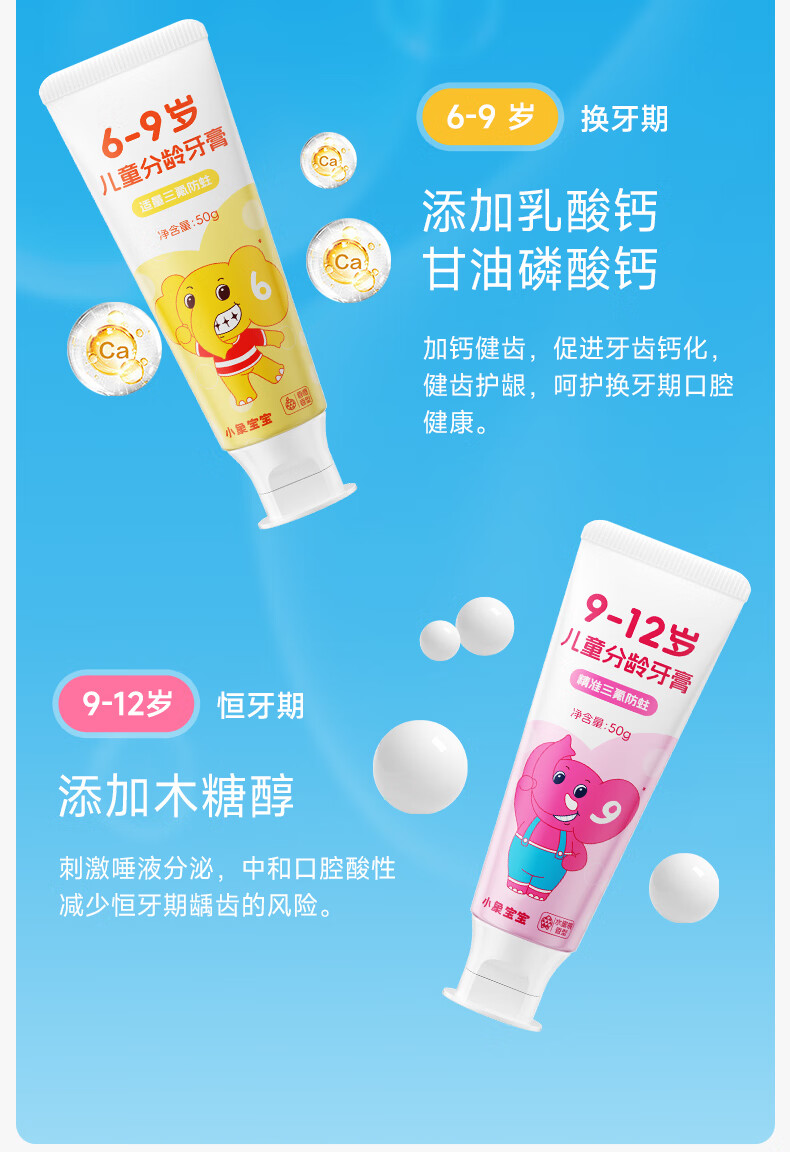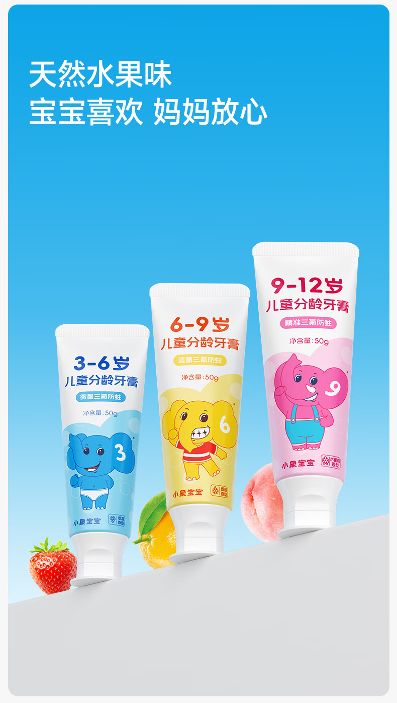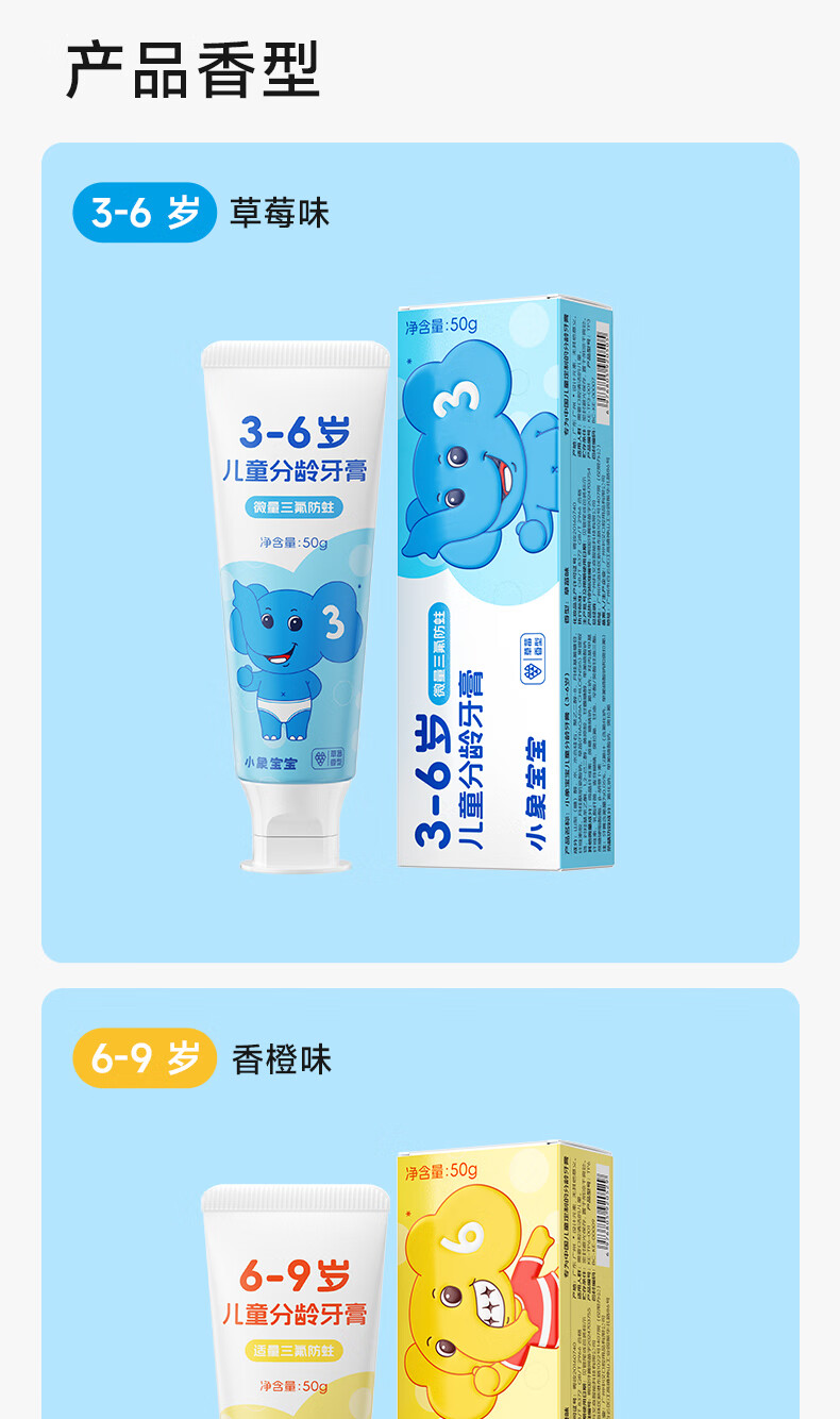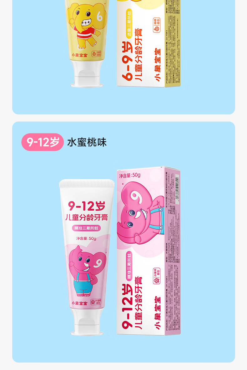小象宝宝儿童分龄牙膏3-6岁6-9岁9-12岁含氟防蛀三氟复配儿童牙膏50g 【6-9岁】香橙味50g 2支装