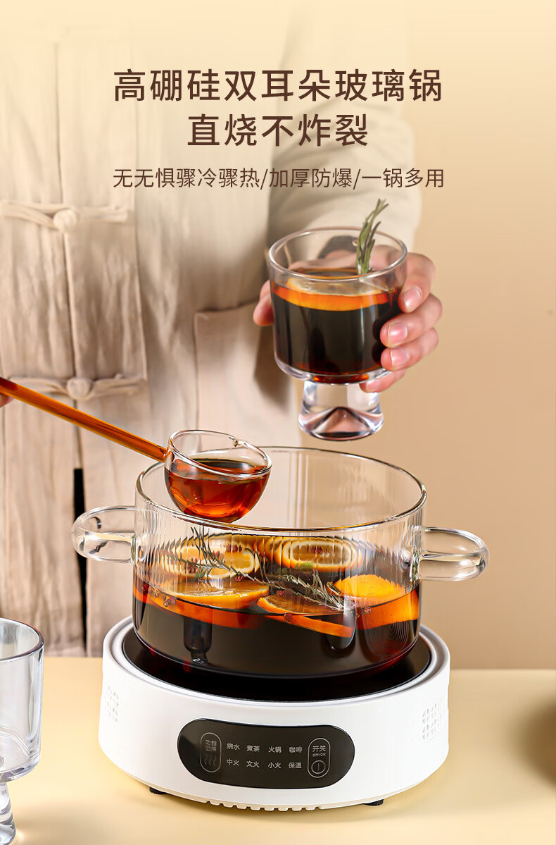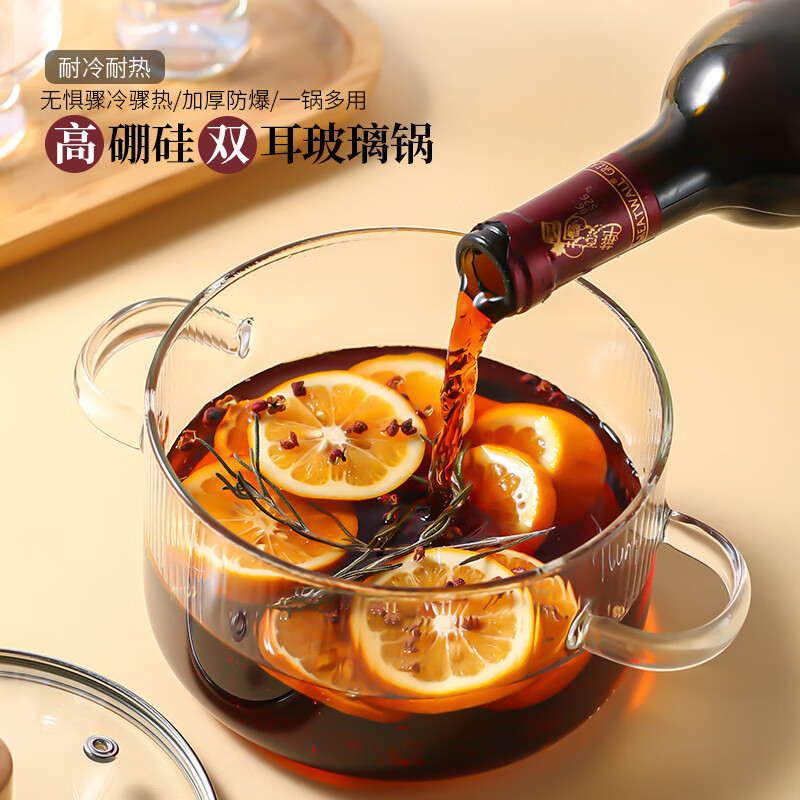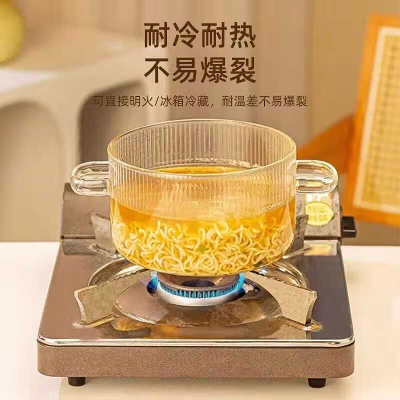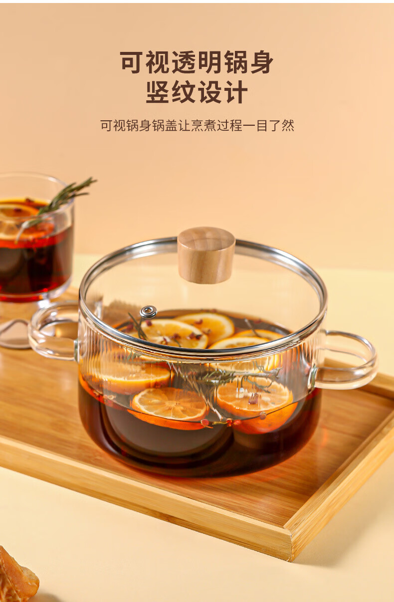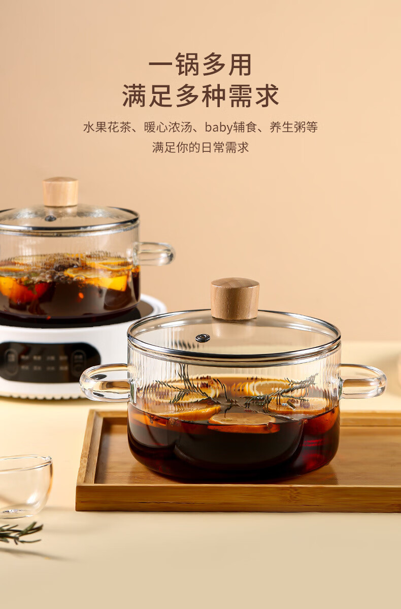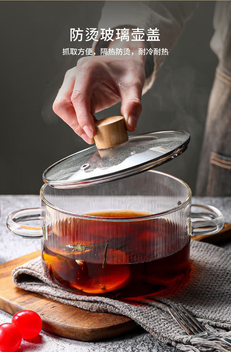 【精选】奶锅家用双耳高硼硅玻璃汤锅透明可明火电陶炉加热耐高温 木纹顶盖小汤锅(1个装) 14cm