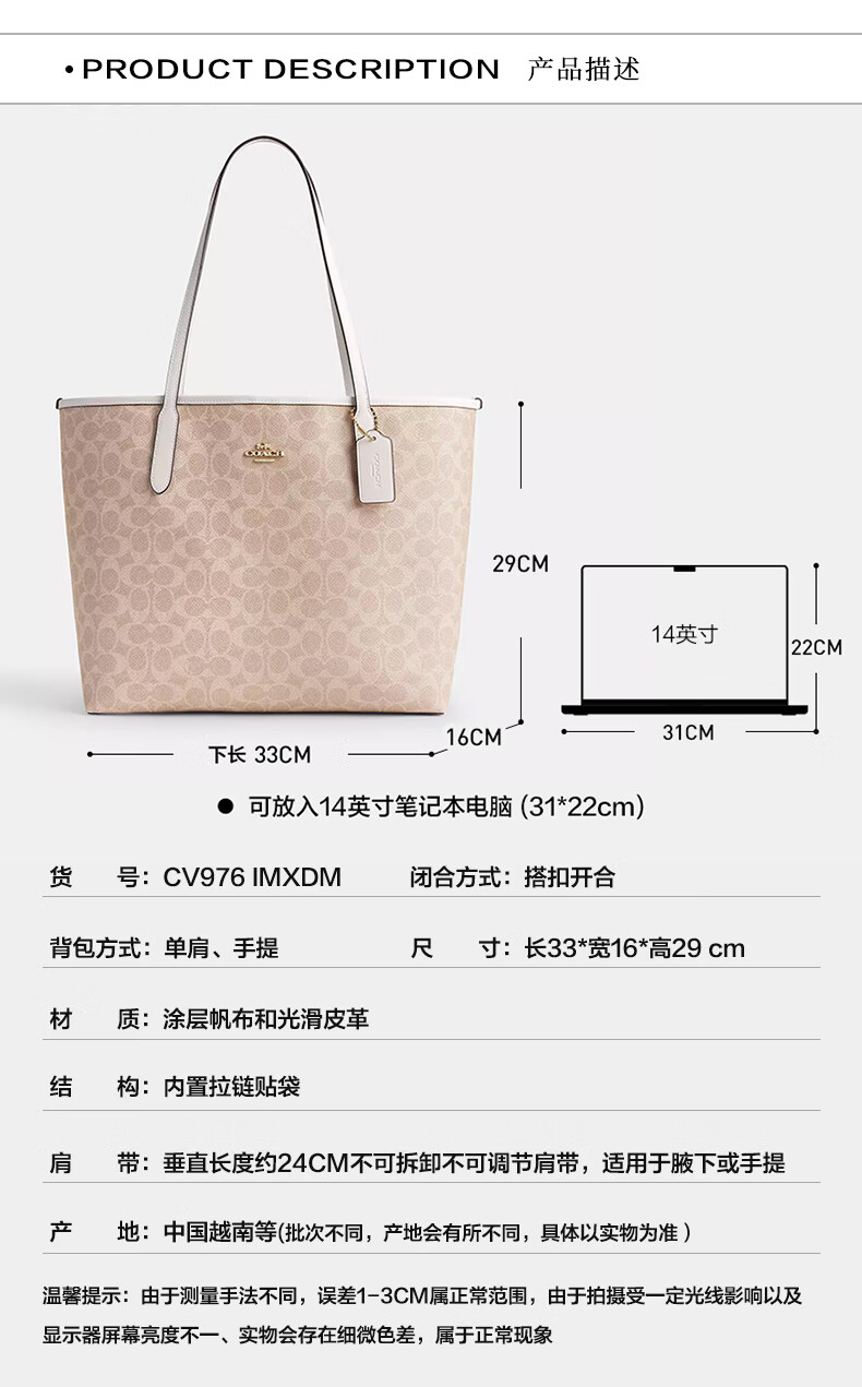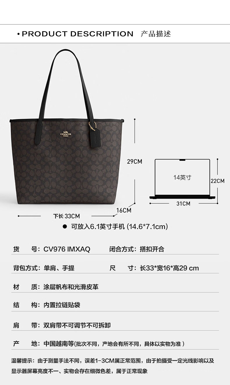 蔻驰(COACH)【品牌直供】女包CITY33通勤电脑包单肩托特包 黑色CV976圣诞礼物