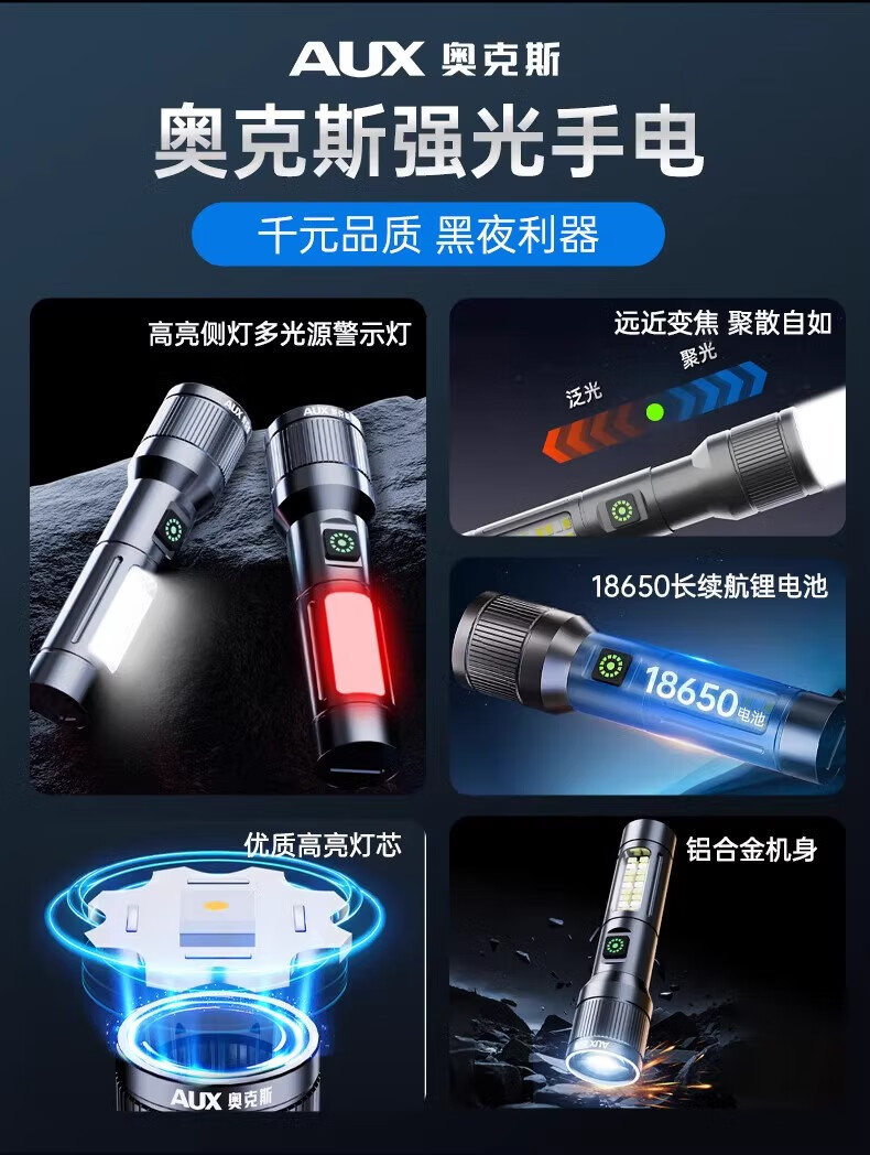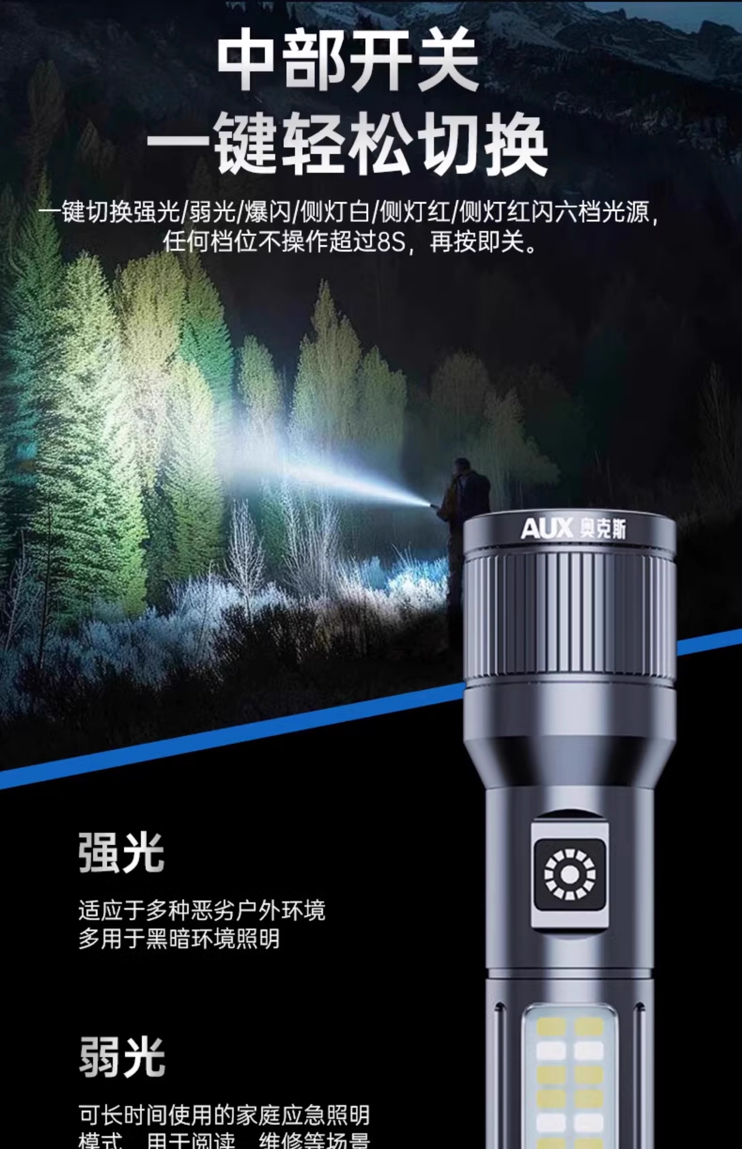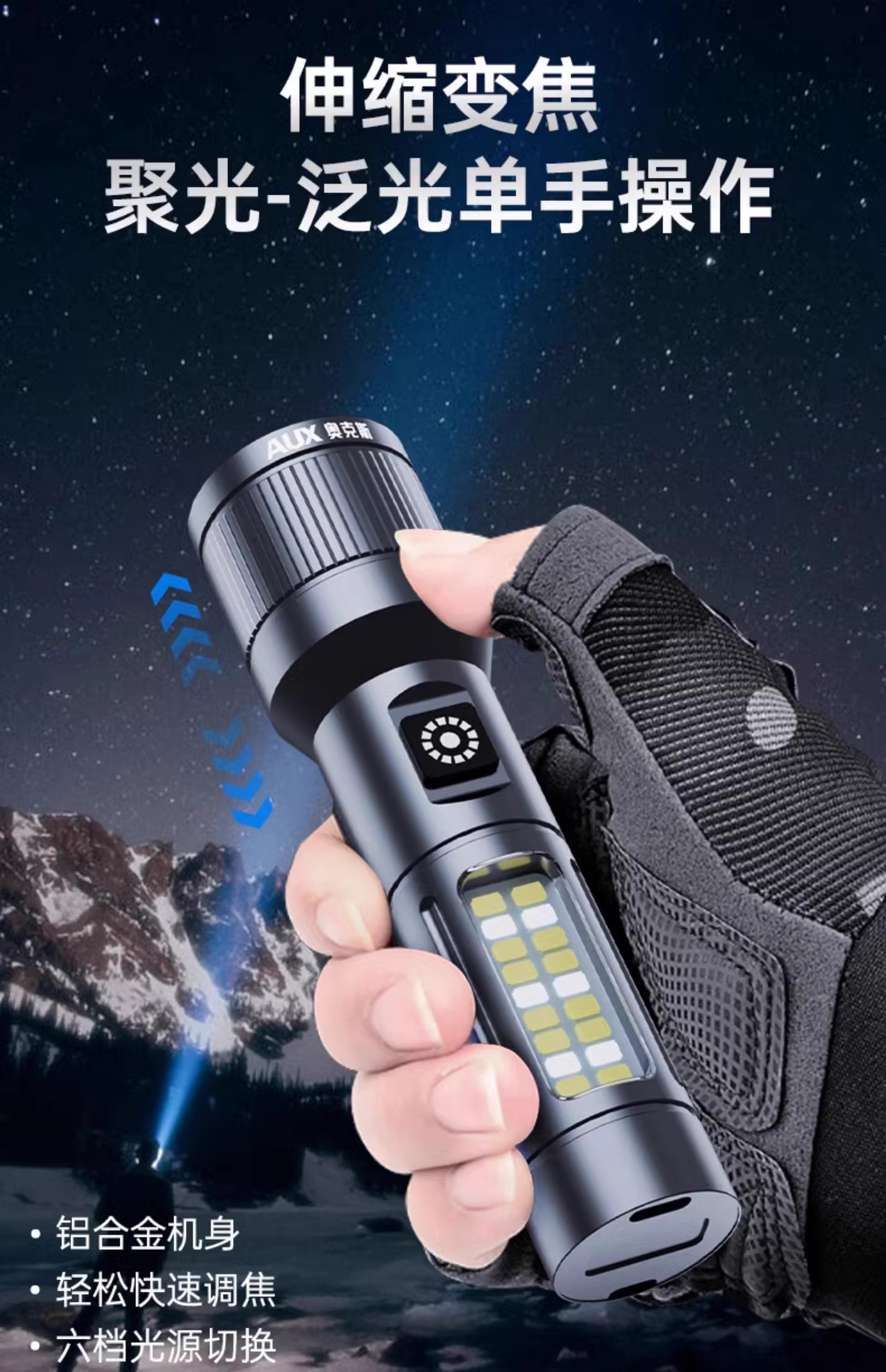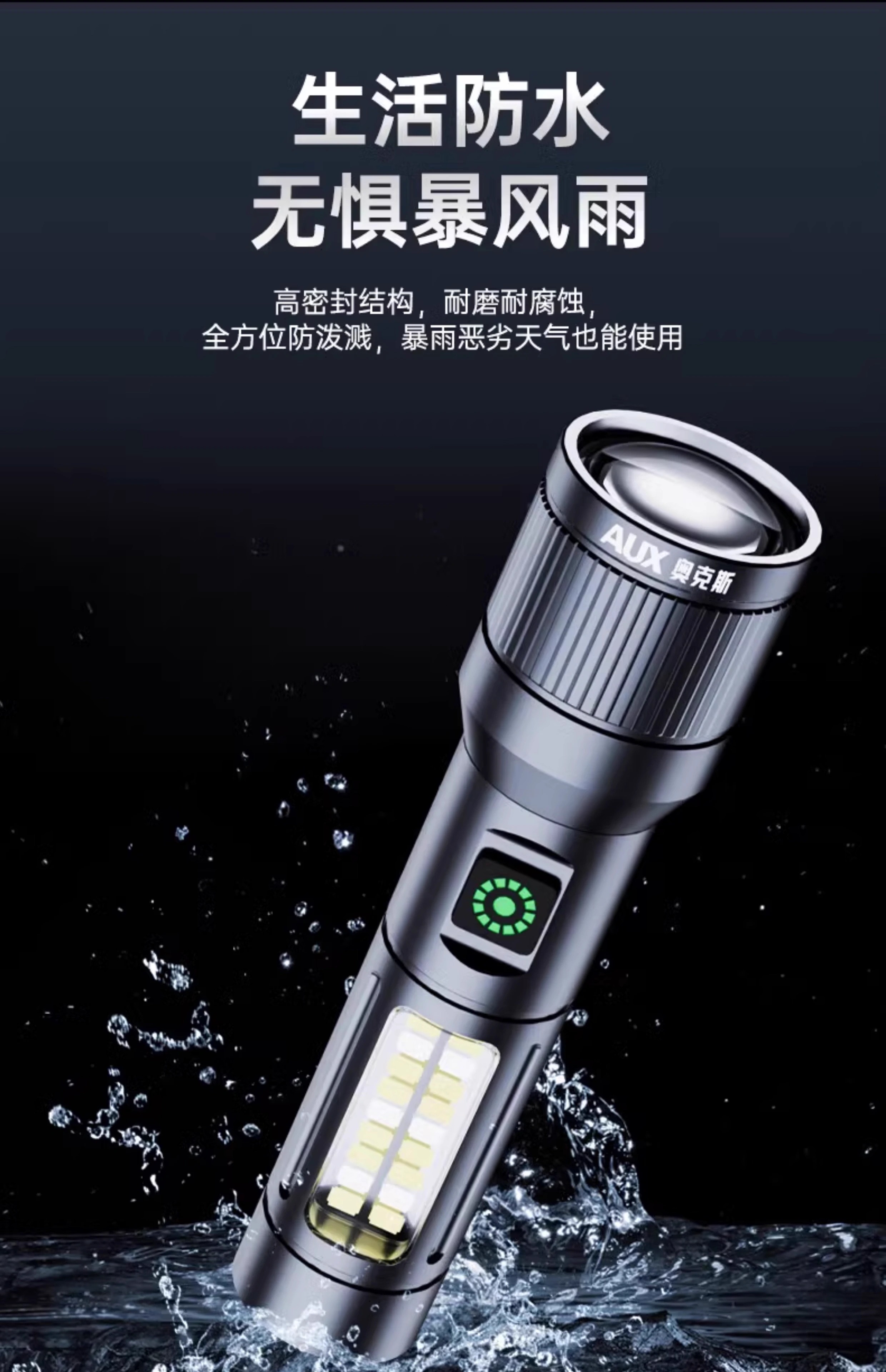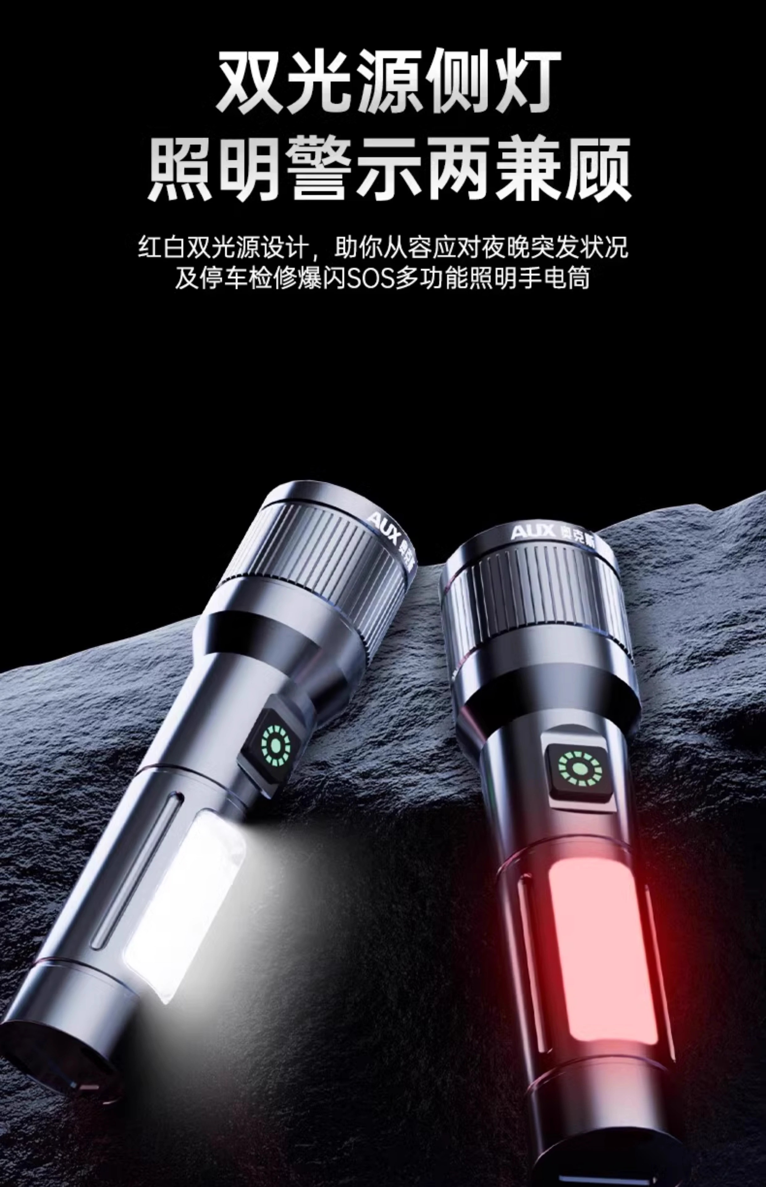 奥克斯伸缩变焦强光手电筒电筒户外超亮爆闪远射家用续航高亮警示侧灯 【M9白激光灯珠-爆亮】续航12H