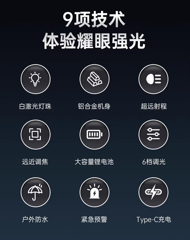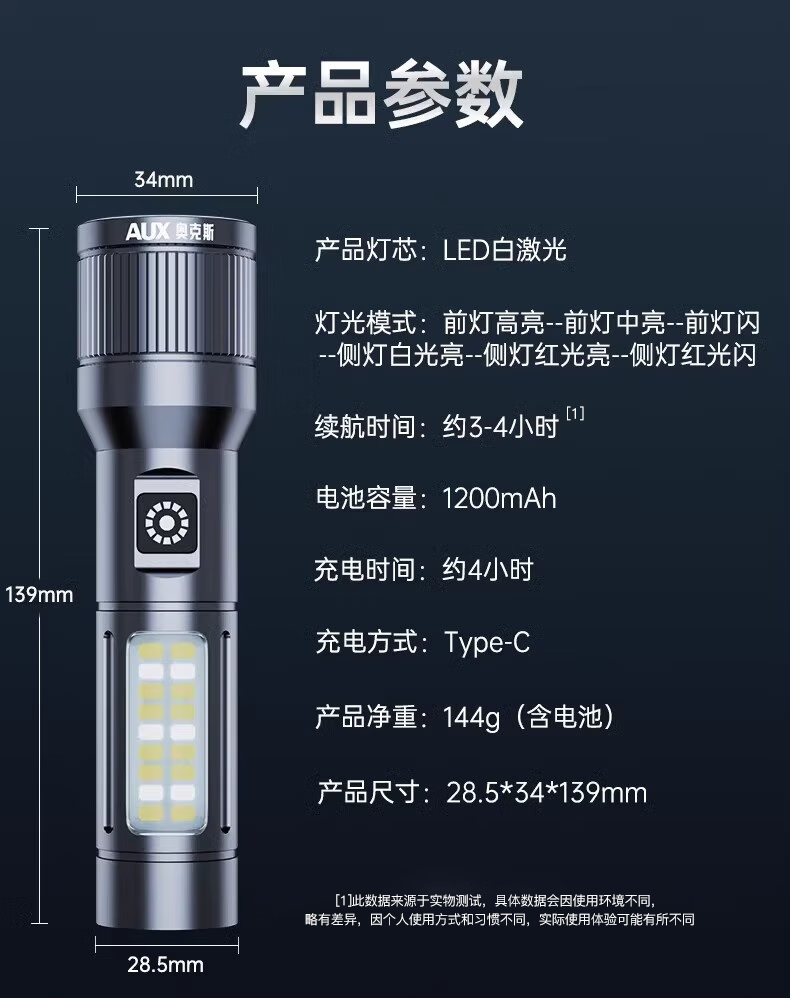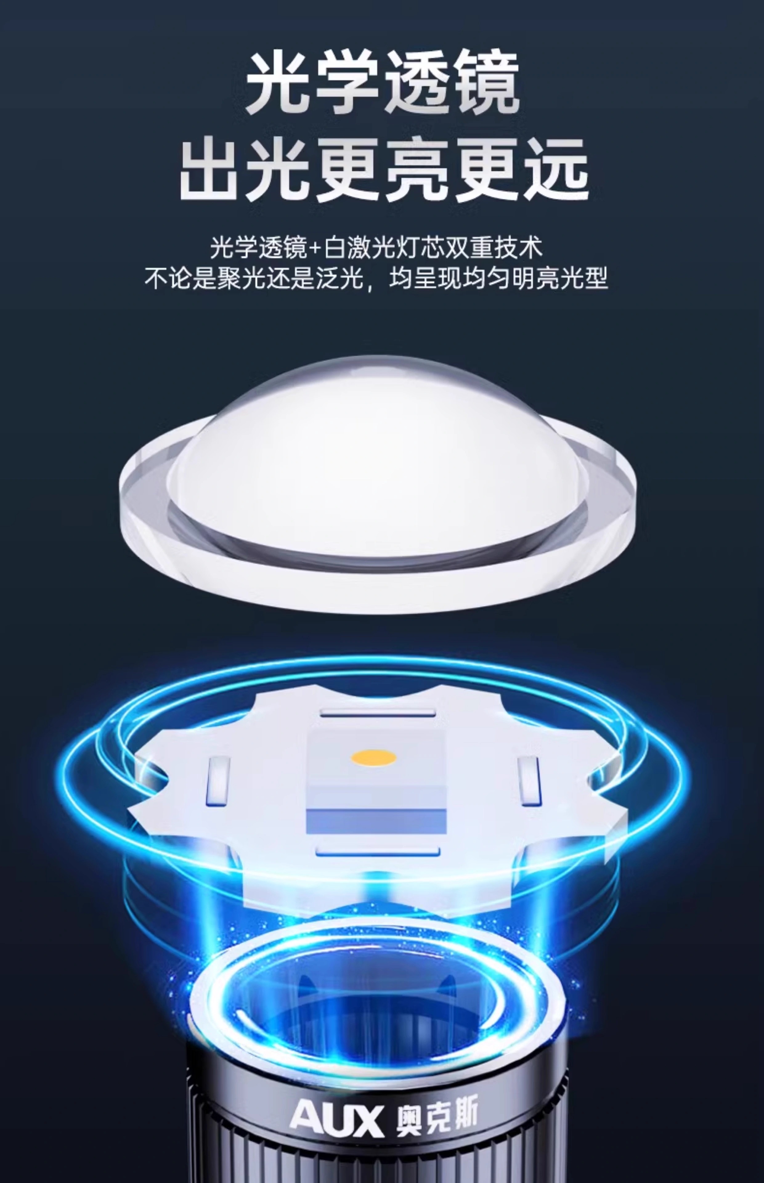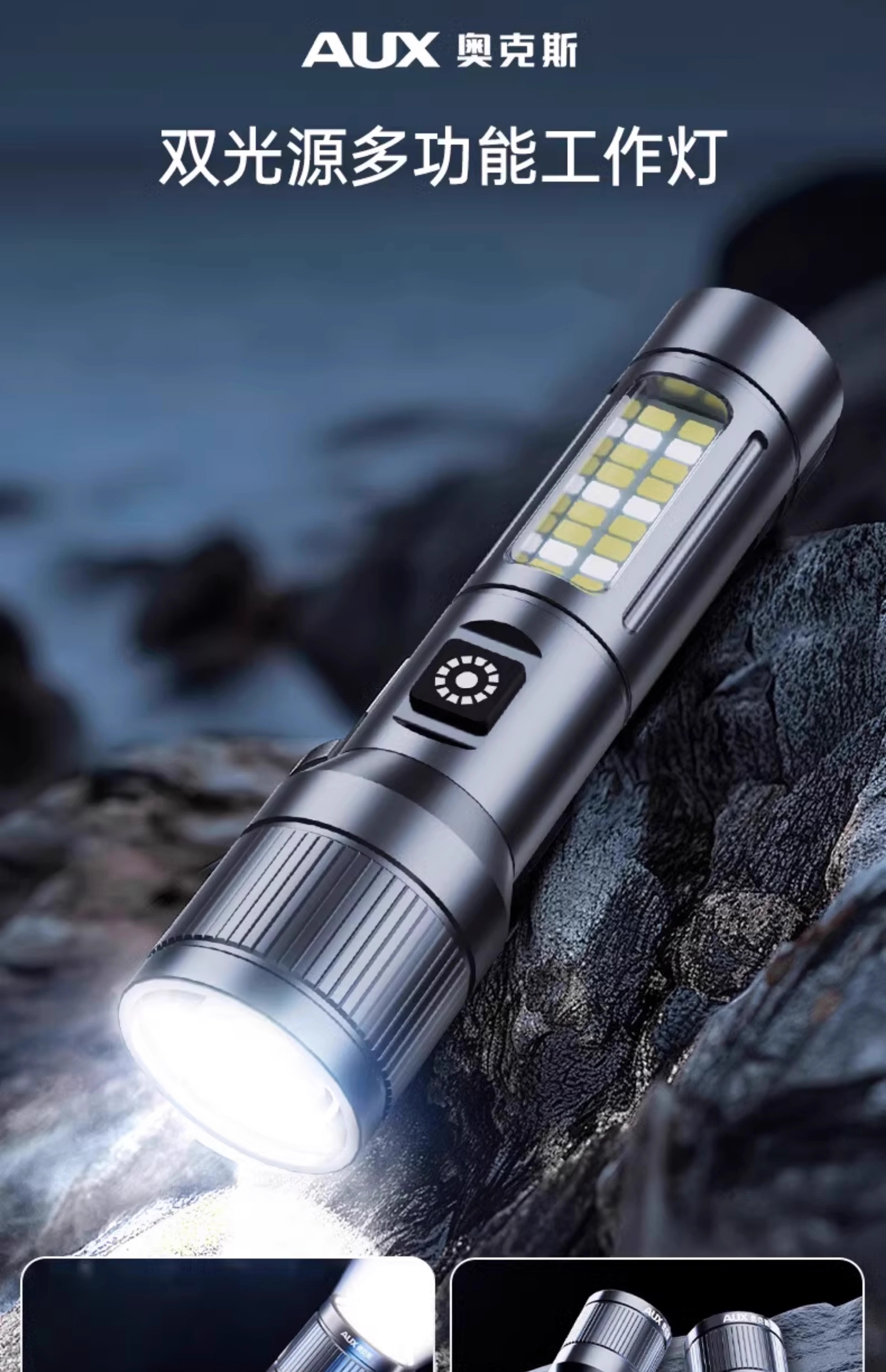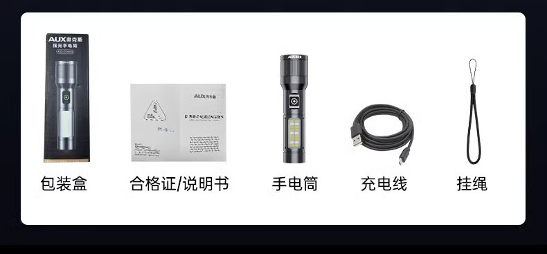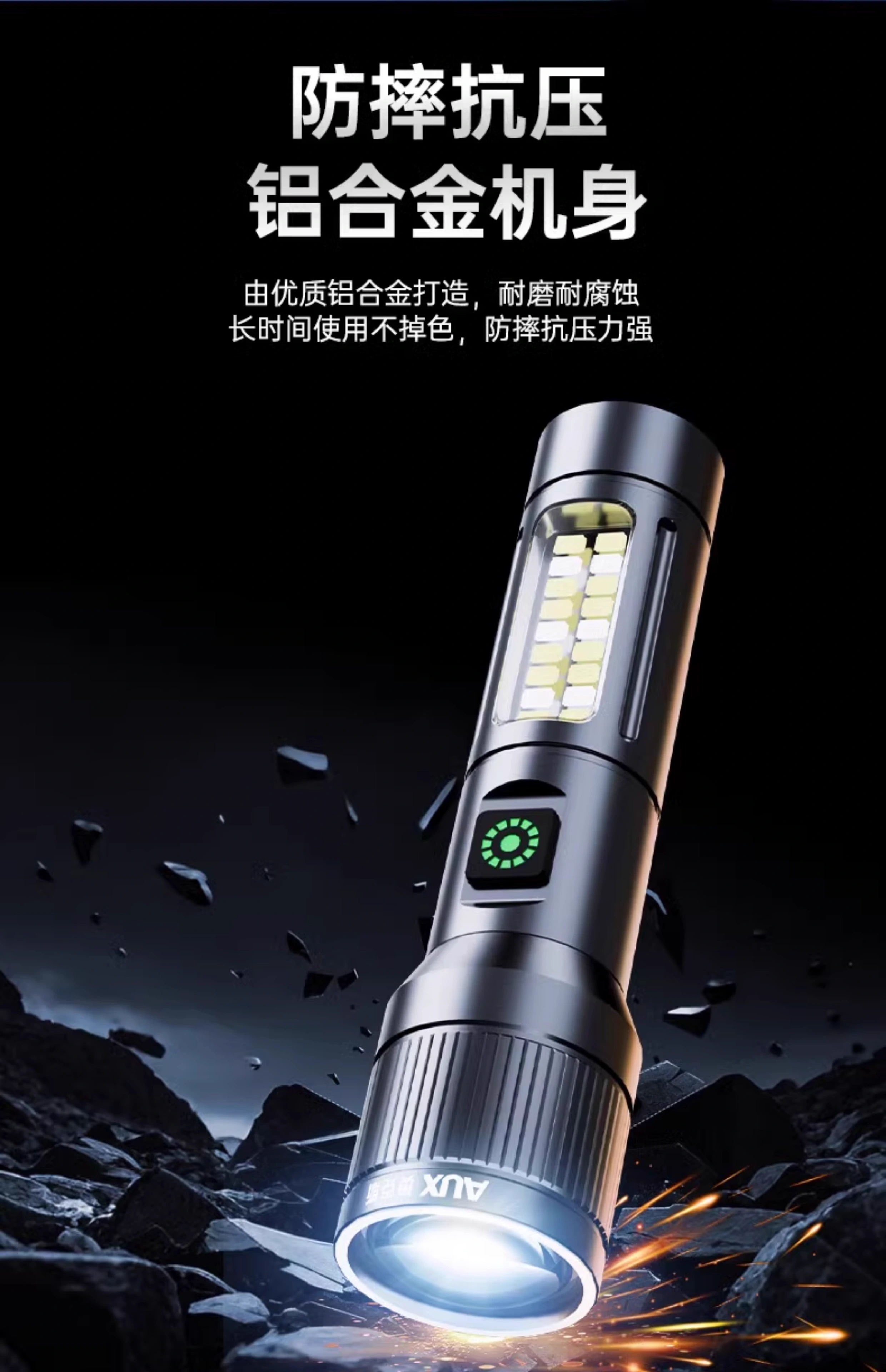 奥克斯伸缩变焦强光手电筒电筒户外超亮爆闪远射家用续航高亮警示侧灯 【M9白激光灯珠-爆亮】续航12H
