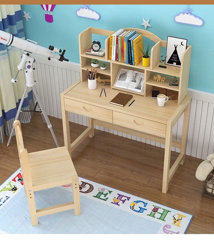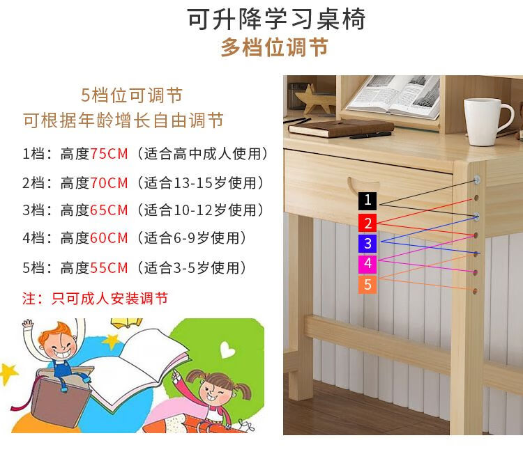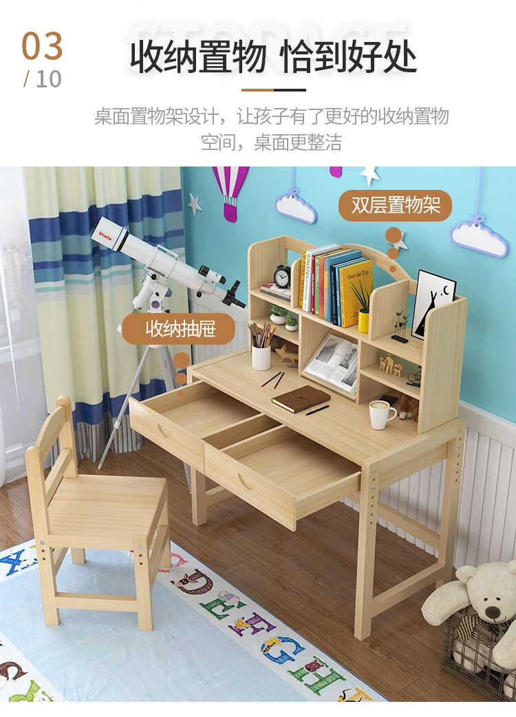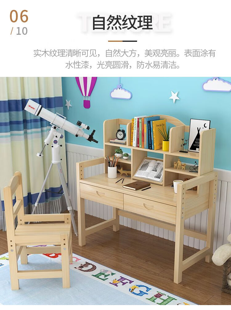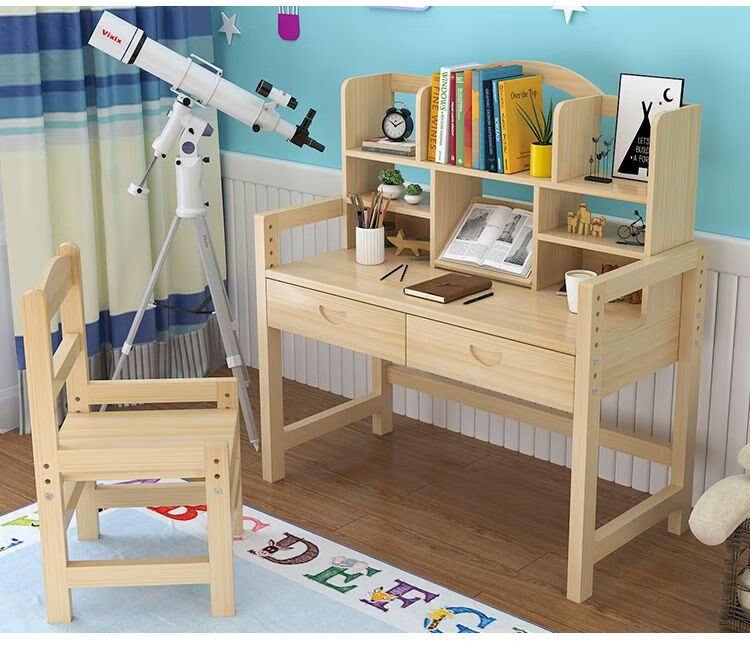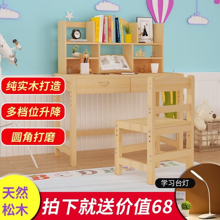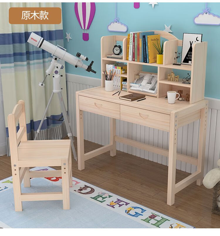 欣慕雅简约现代松木可升降学习桌小学生家用写字桌椅套装 05款原木无漆 80*50*75桌椅一套可升降