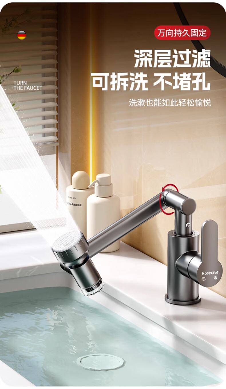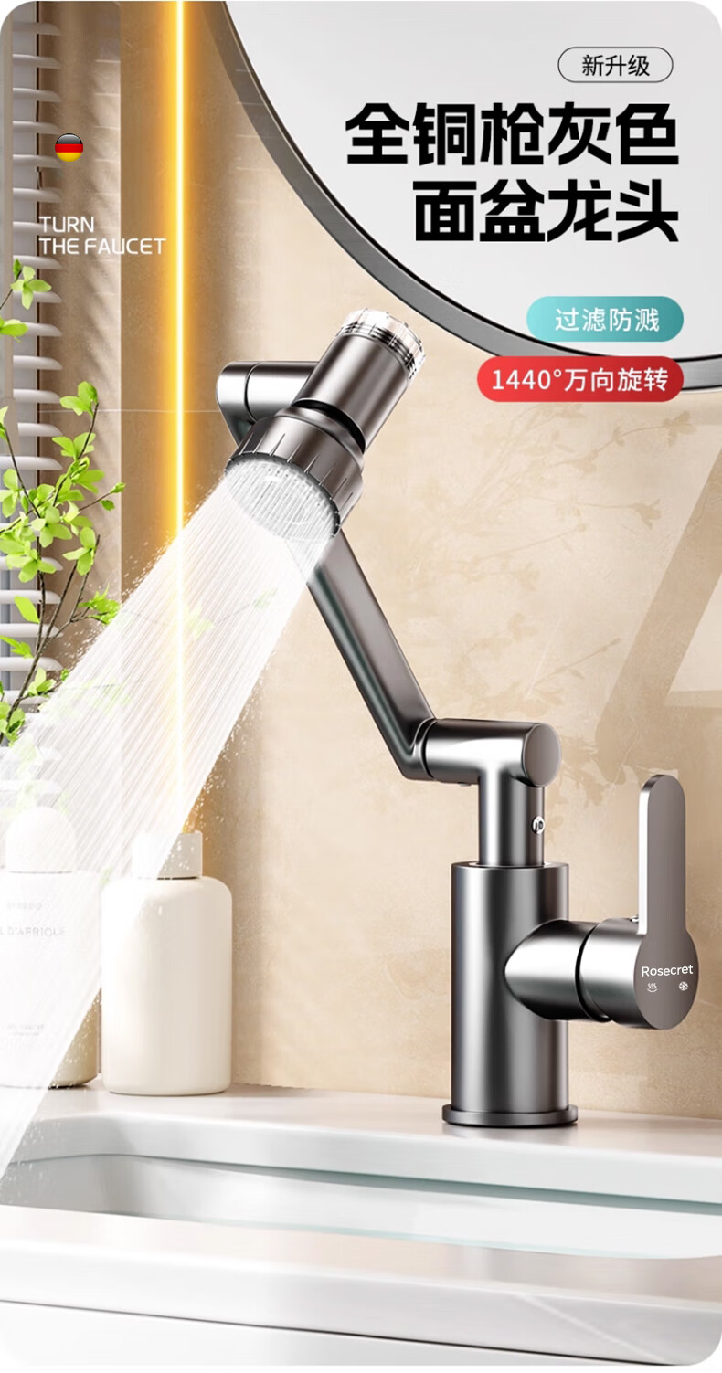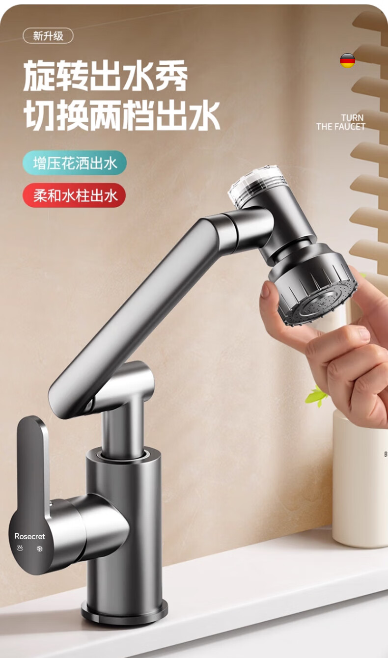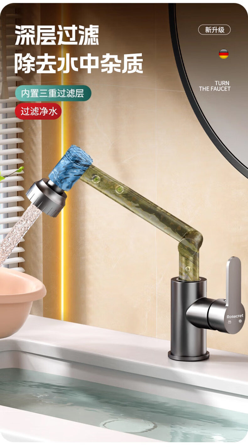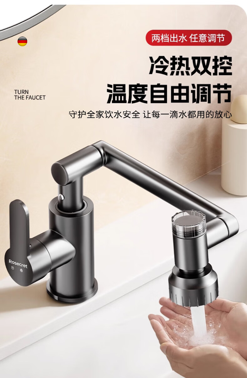 Rosecret【德国】全铜主体洗脸盆水龙头冷热水二合一过滤面盆万向旋转龙头 两档过滤面盆龙头-亮银色 加厚加重丨配80cm冷热进水管*2