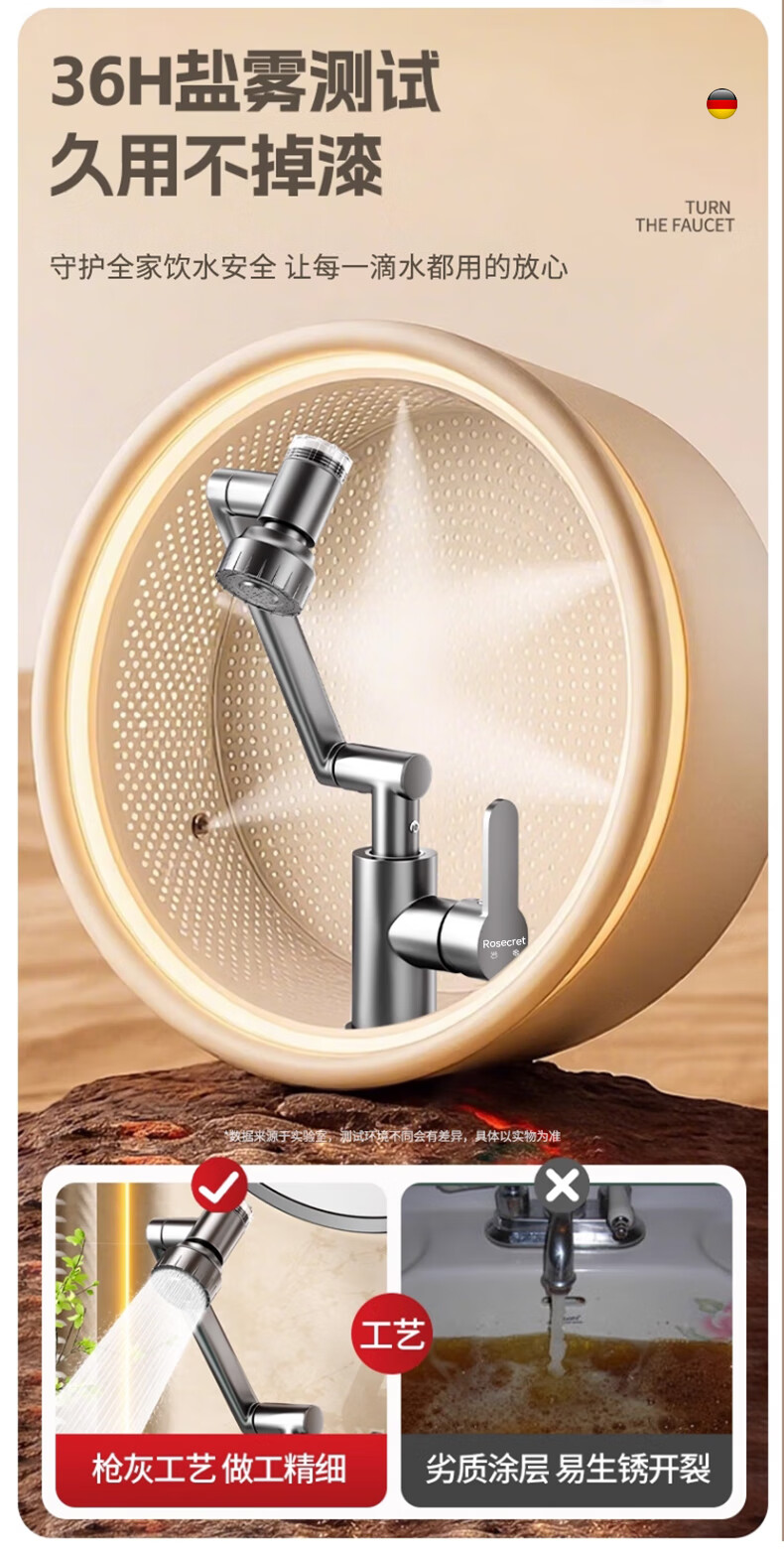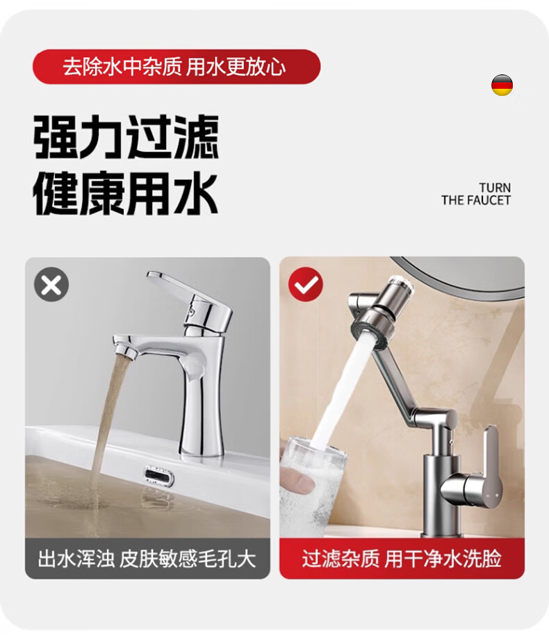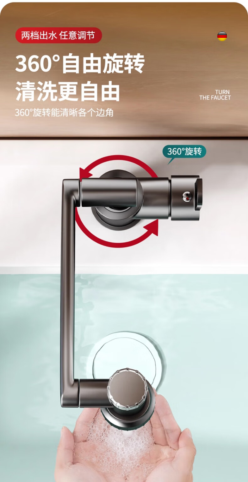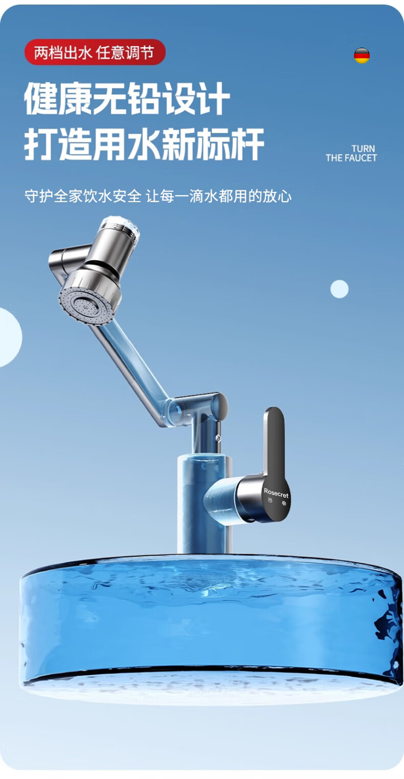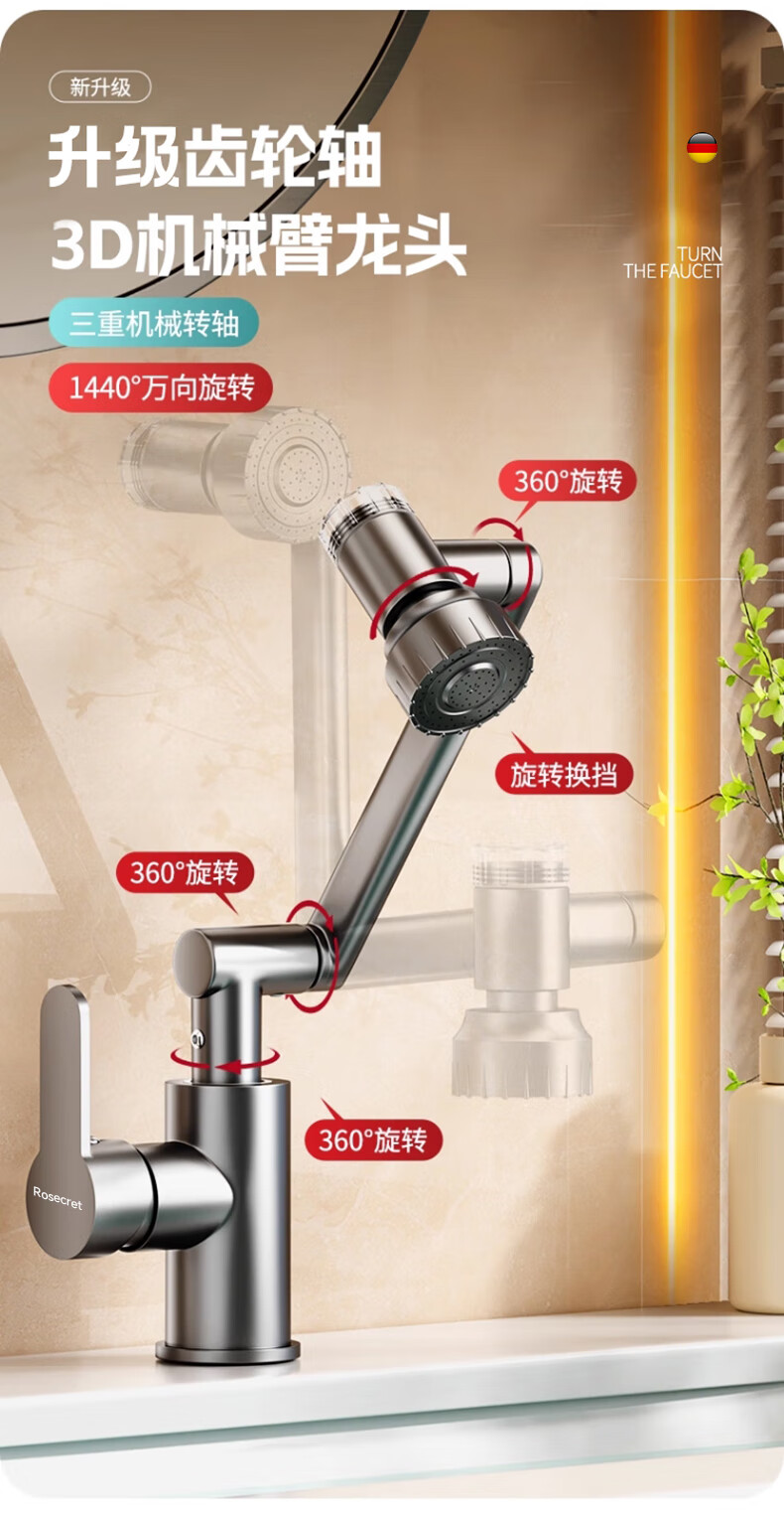 Rosecret【德国】全铜主体洗脸盆水龙头冷热水二合一过滤面盆万向旋转龙头 两档过滤面盆龙头-亮银色 加厚加重丨配80cm冷热进水管*2