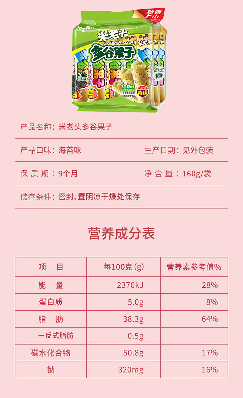 米老头多谷果子海苔味 糙米卷粗粮谷物夹心能量棒膨化休闲零食 160g/袋