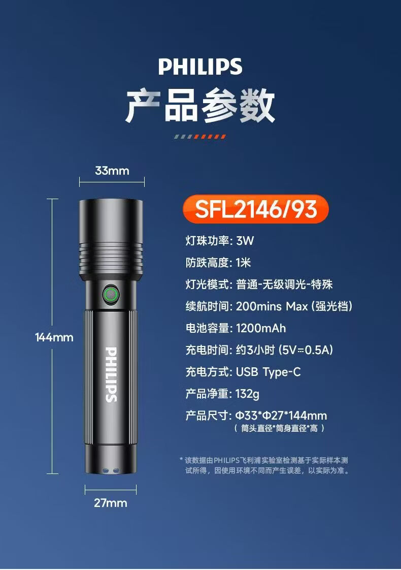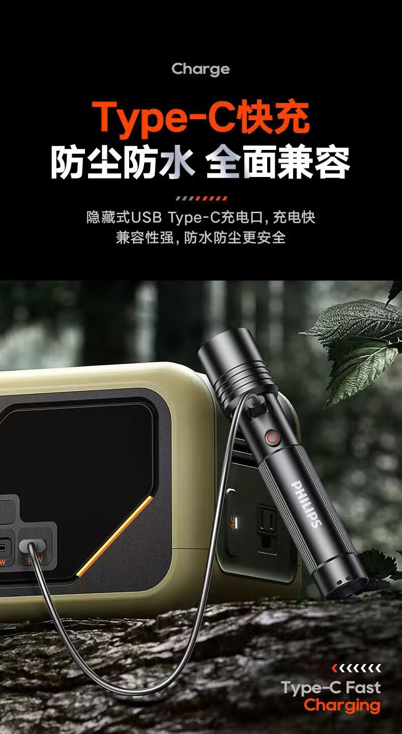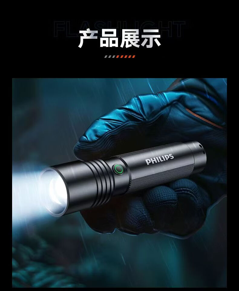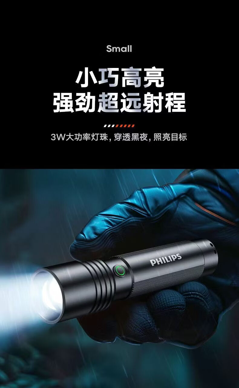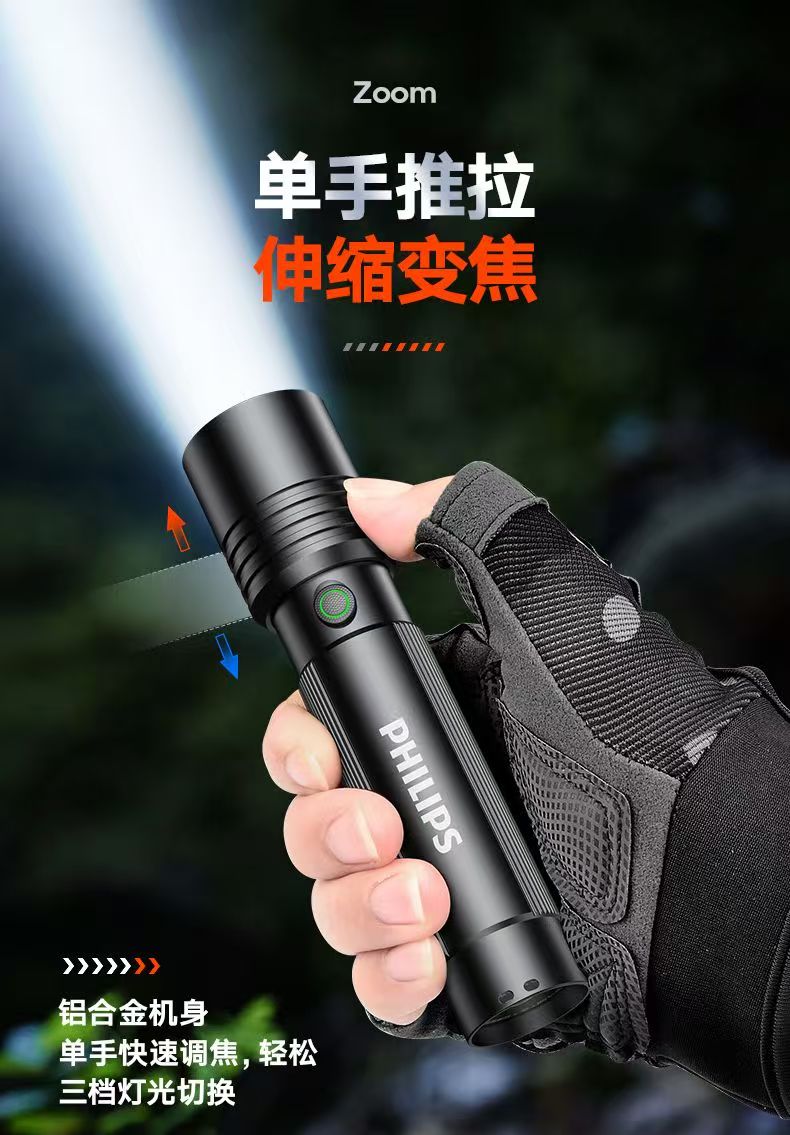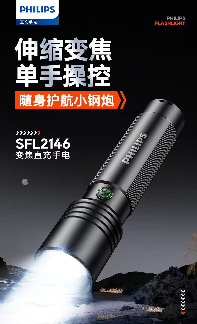 飞利浦(PHILIPS)强光手电筒长续航可充电户外远射变焦充电家用便携SFL2146 3W/变焦/1200毫安/SFL2146