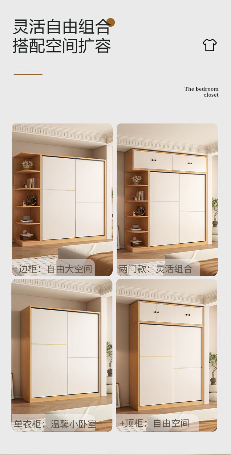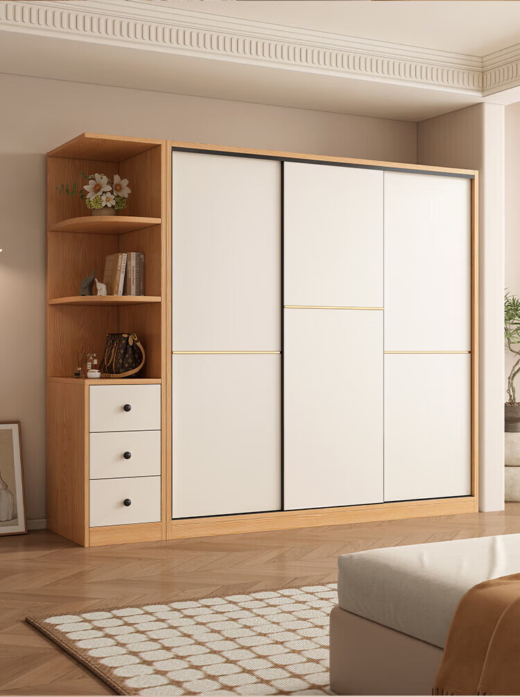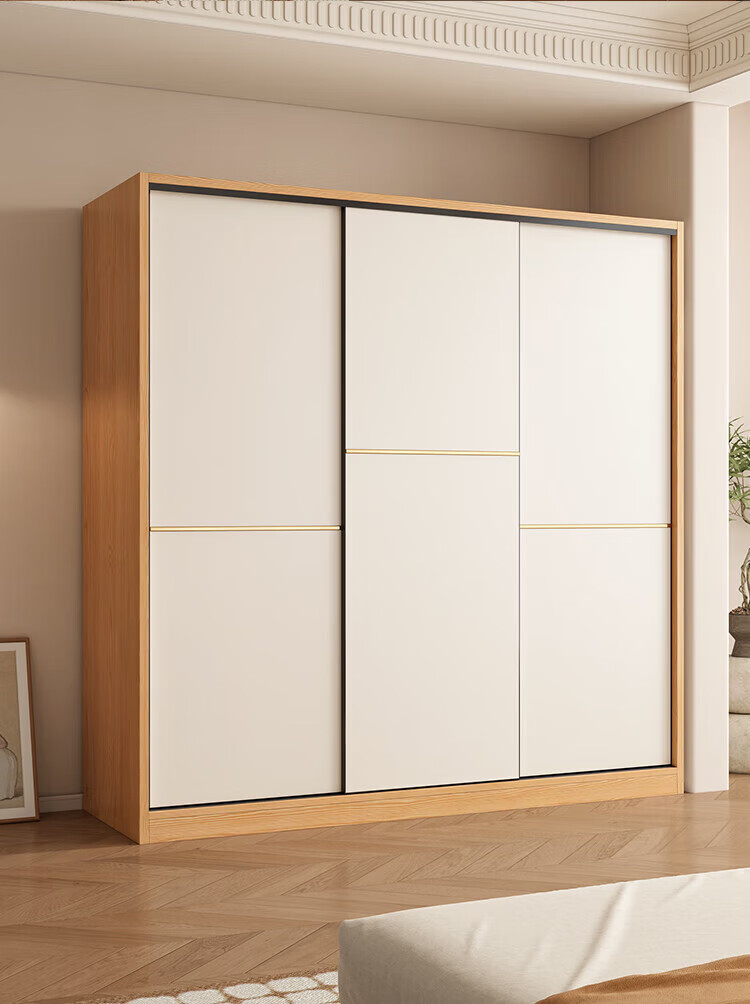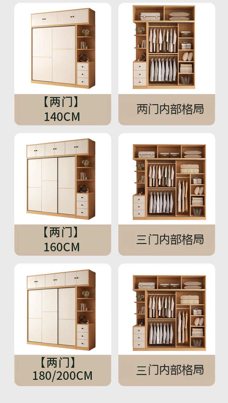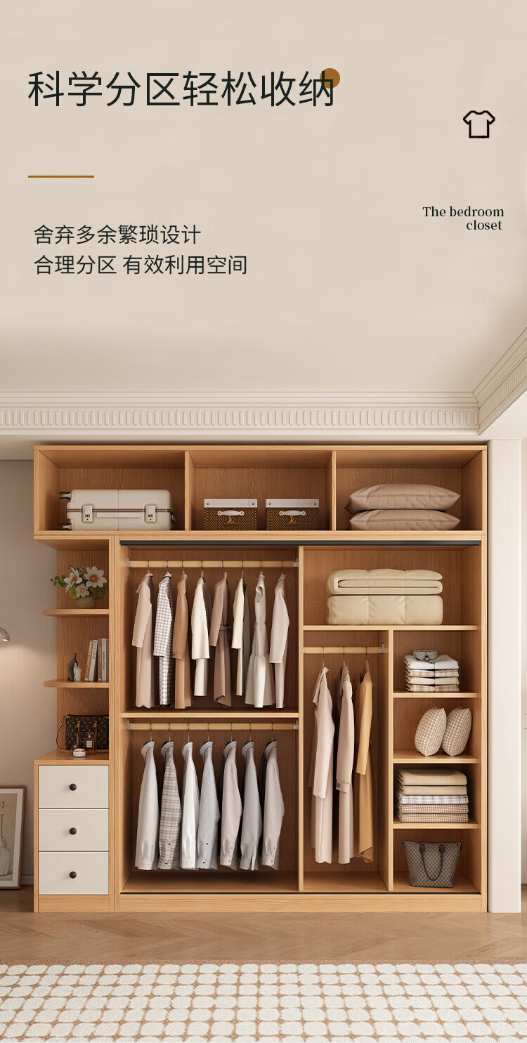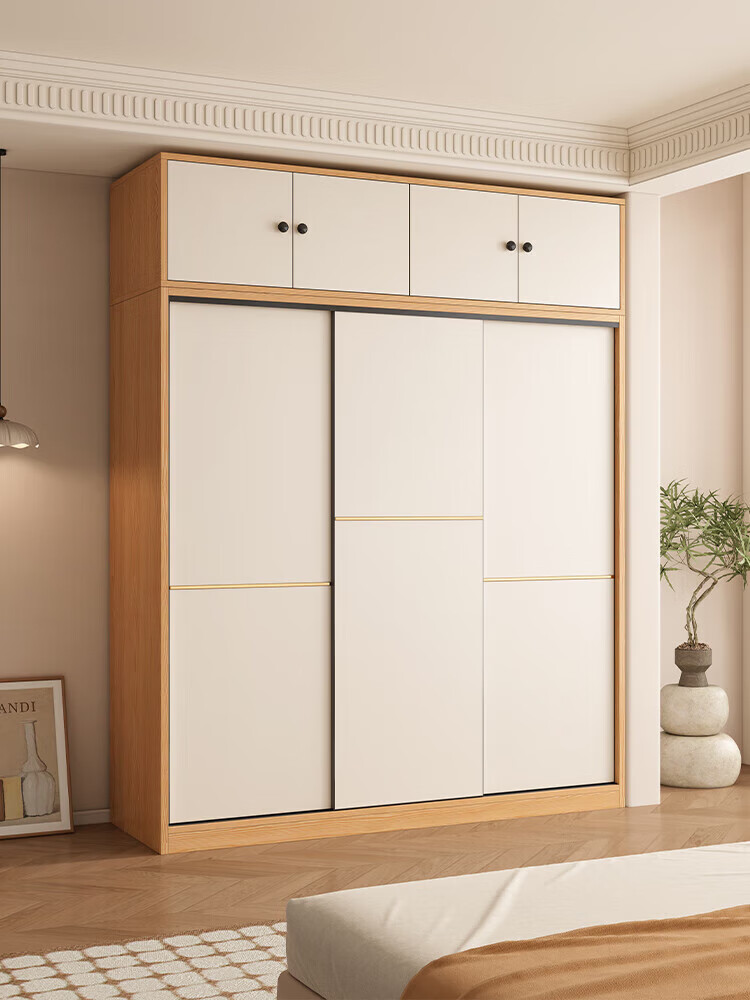 清逸【免费安装】衣柜卧室推拉门实木质多门储物衣橱原木简易大衣柜 【三门】200厘米主柜+顶柜+边柜