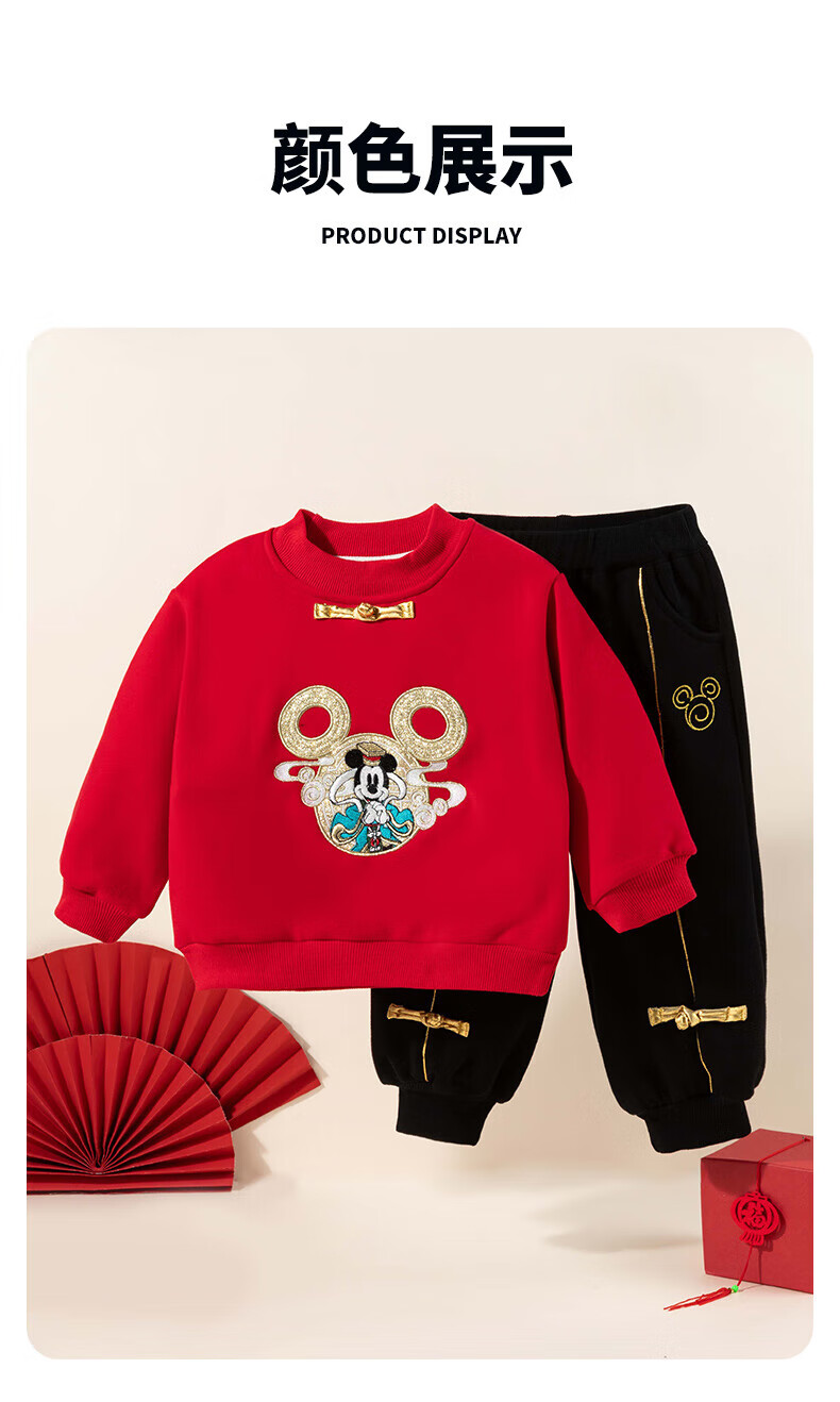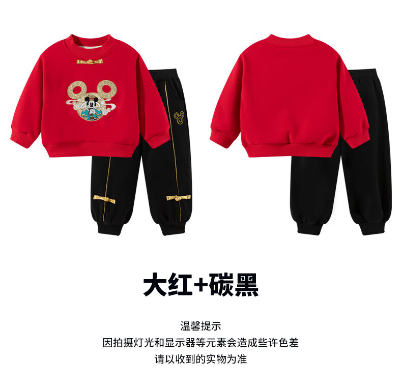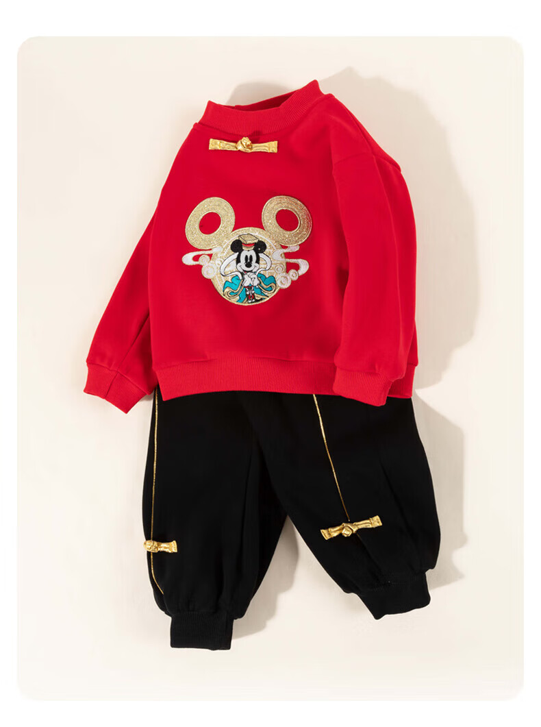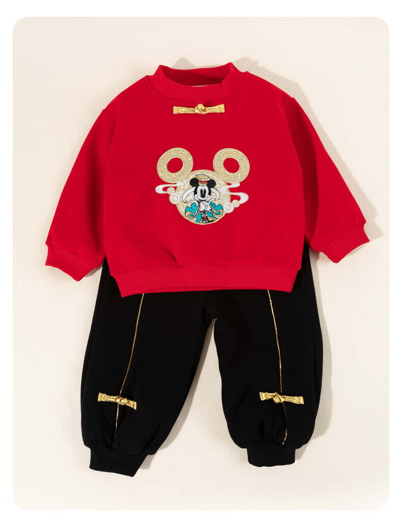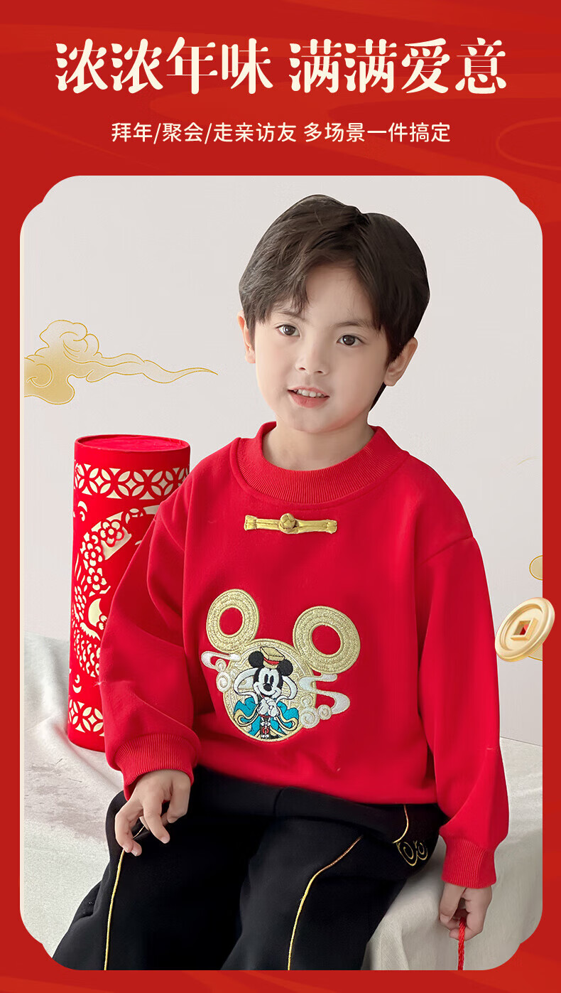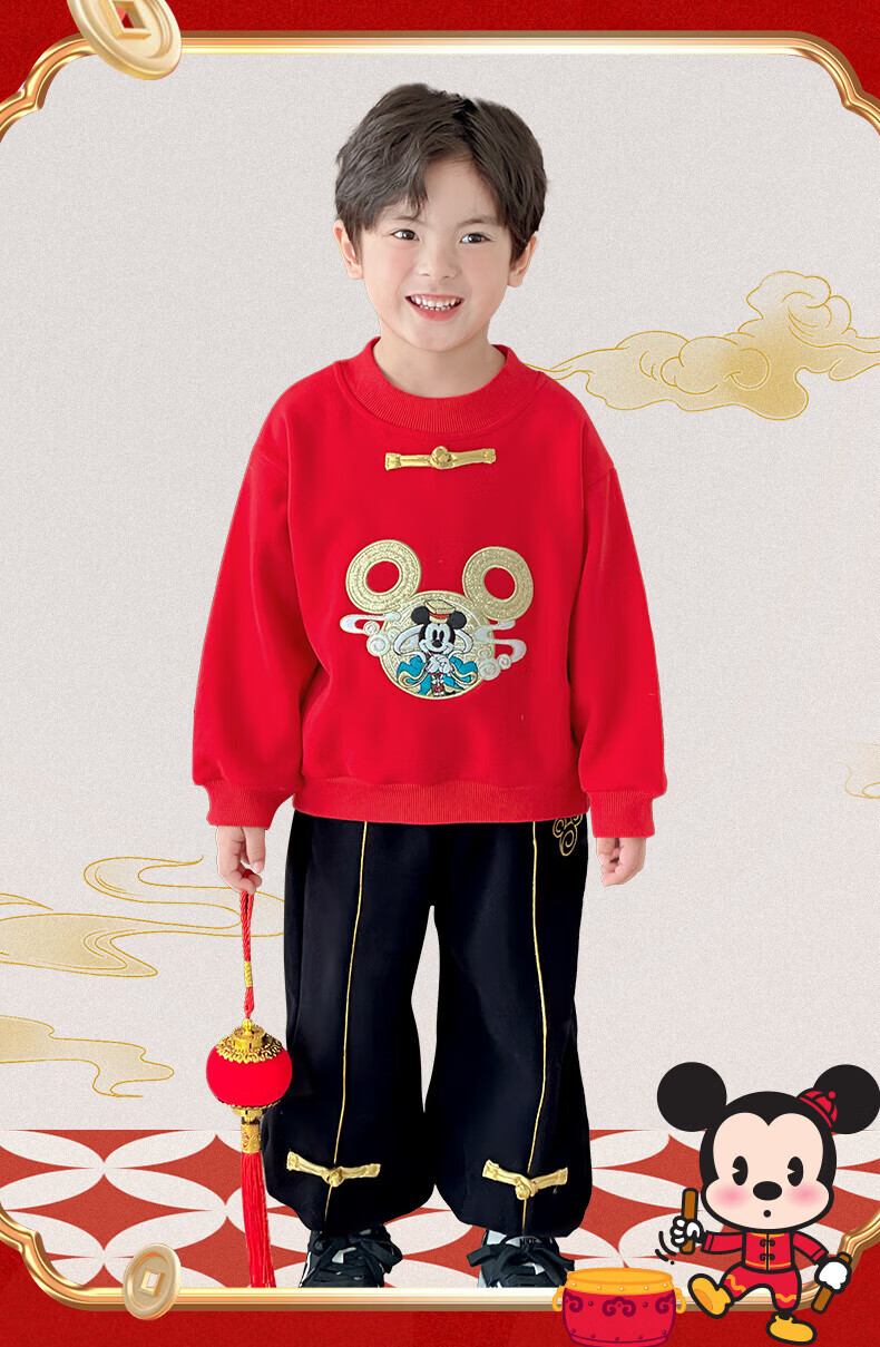 迪士尼(Disney)男童新年款红色拜年服刺绣时尚加绒保暖舒适休闲百搭儿童 国风印花米奇 120