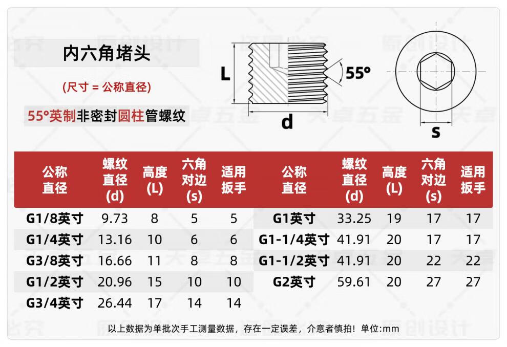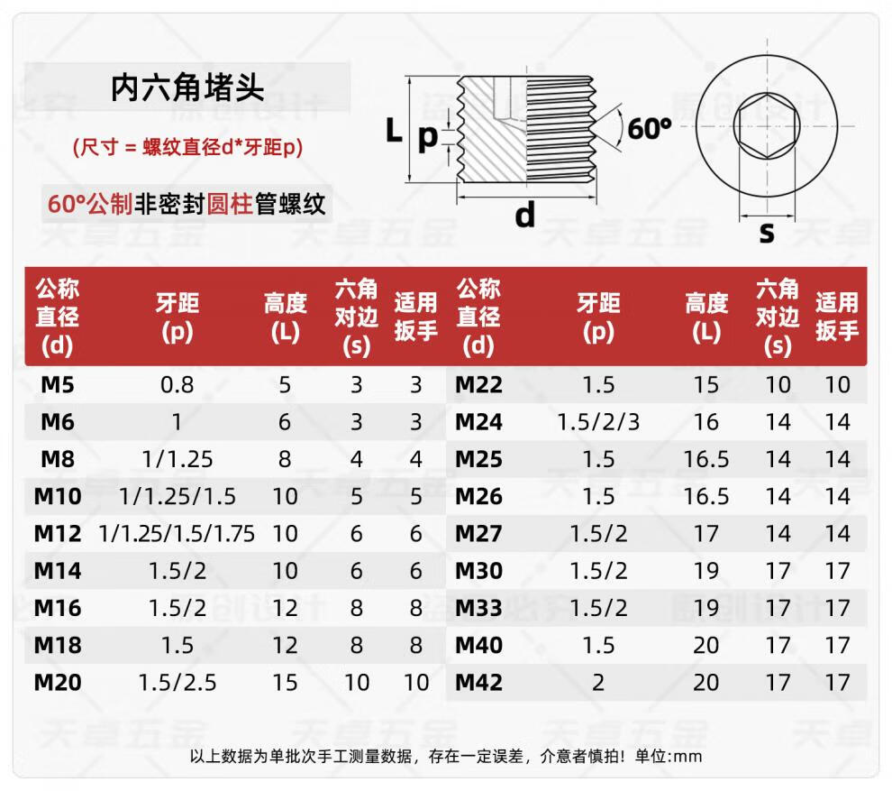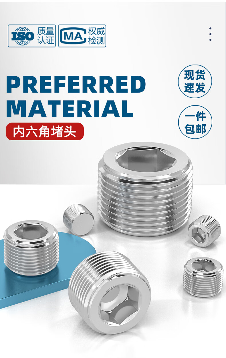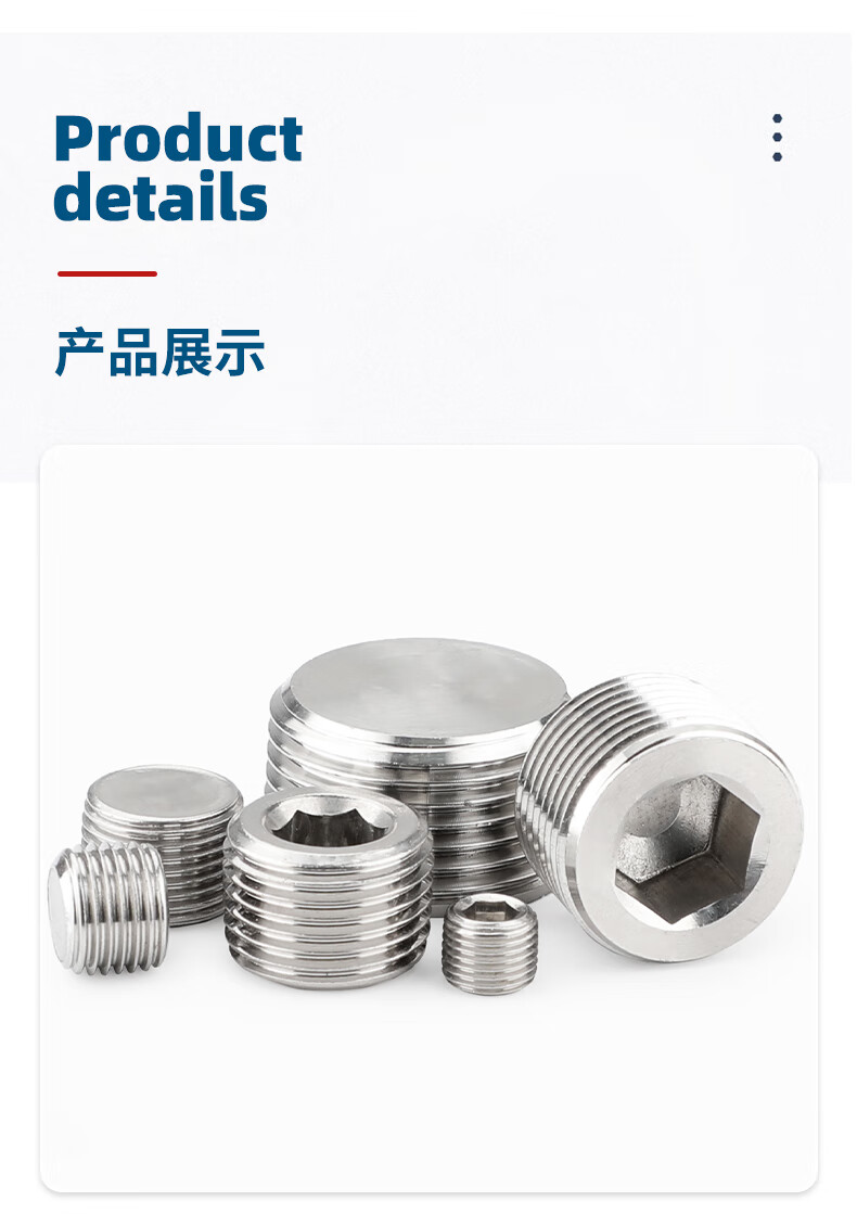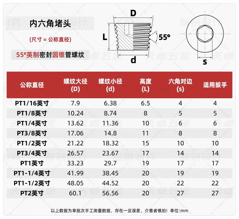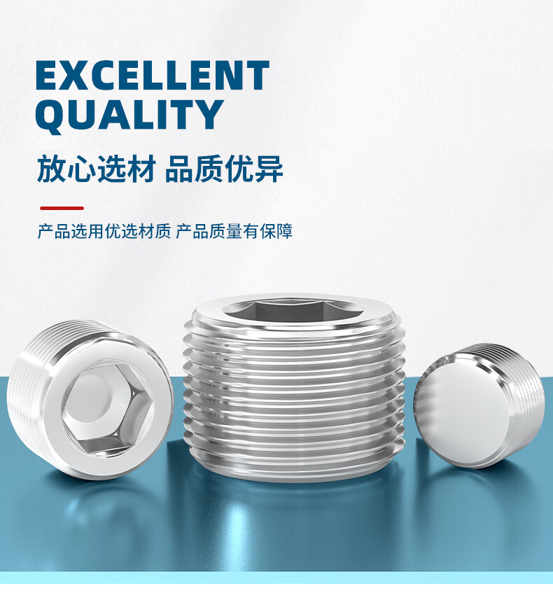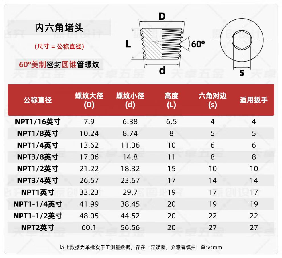 天卓五金304不锈钢内六角堵头喉塞油塞螺堵油堵闷头PT NPT 1分2分3分4分 ---公制/英制锥管螺纹M牙型角为55°---
