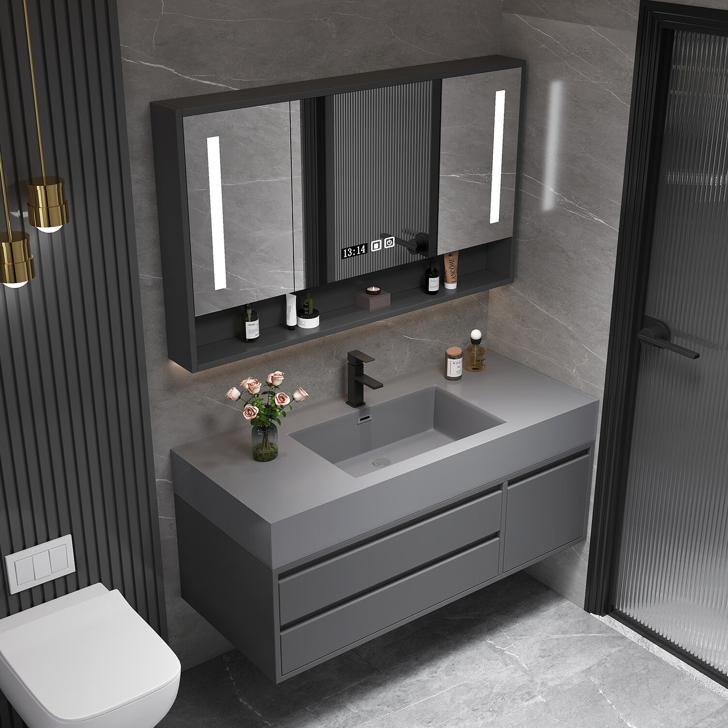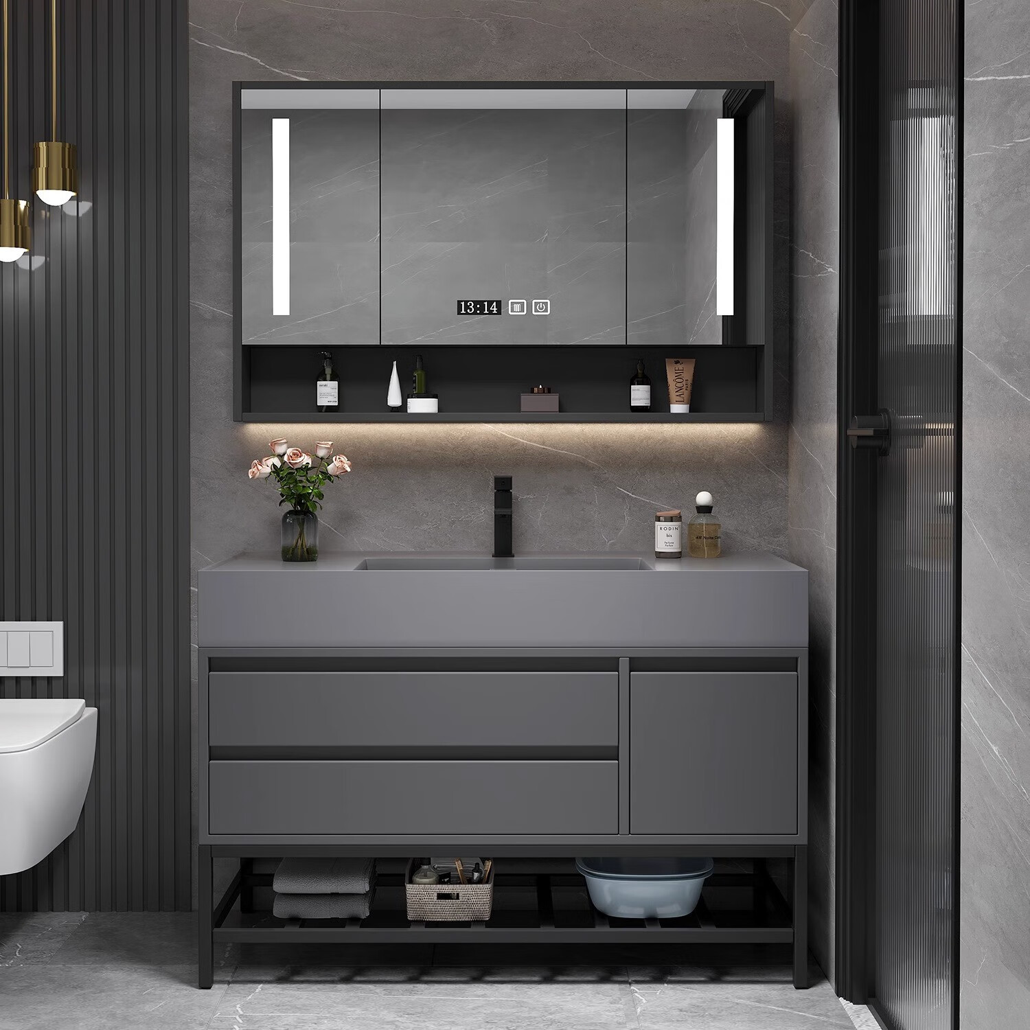 九牧(JOMOO)官方旗舰浴室柜陶瓷一体盆洗手洗脸台盆柜组合卫生间卫浴柜洗漱台 120cm铁灰+陶瓷盆+智能镜柜