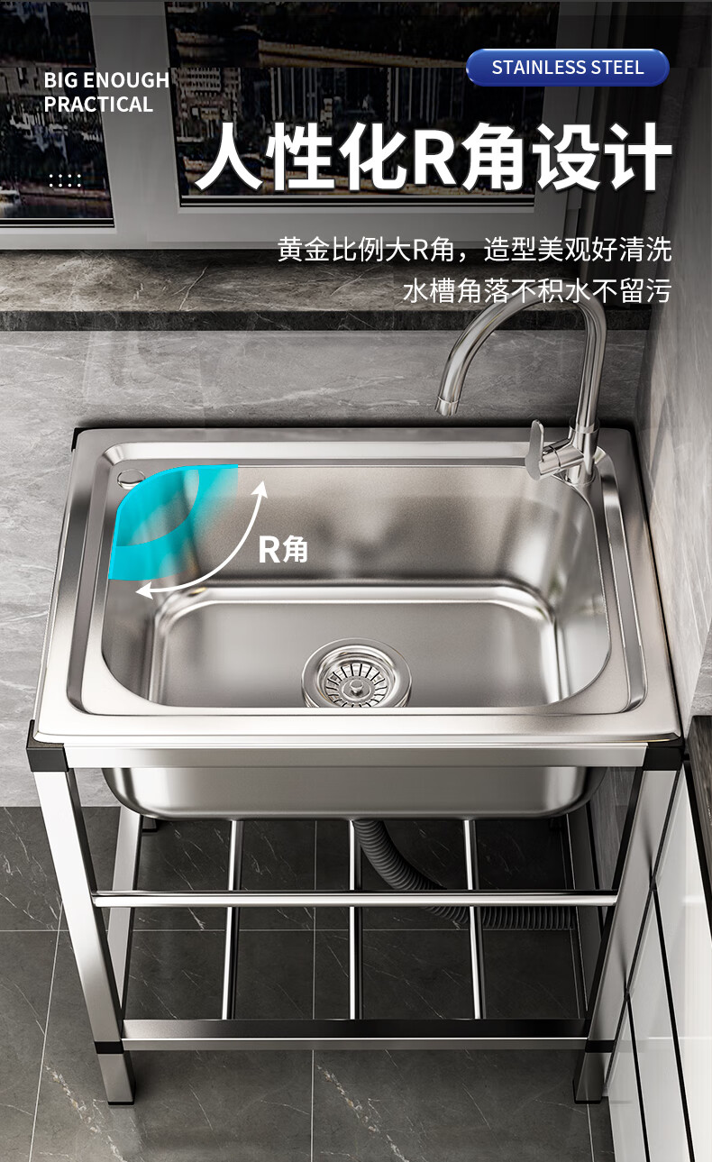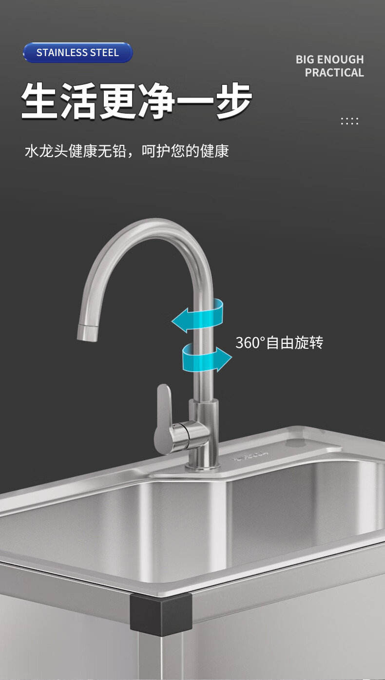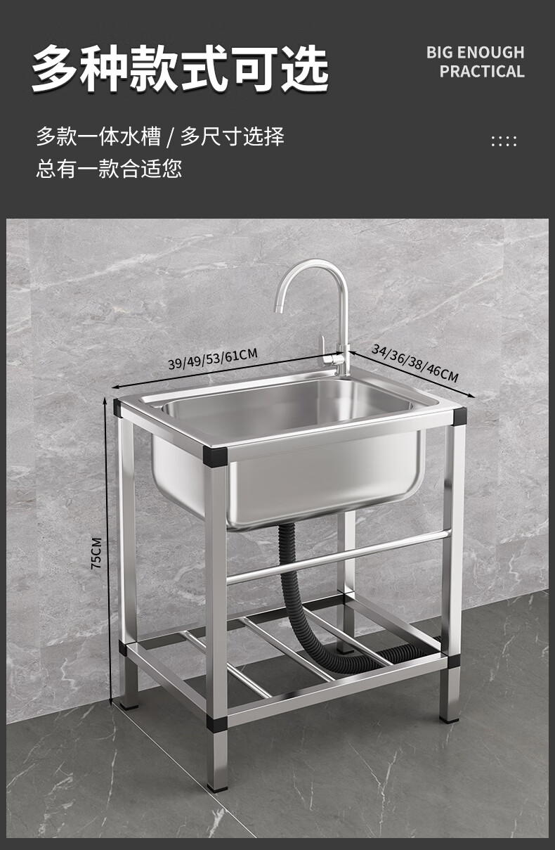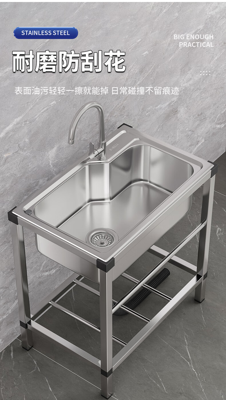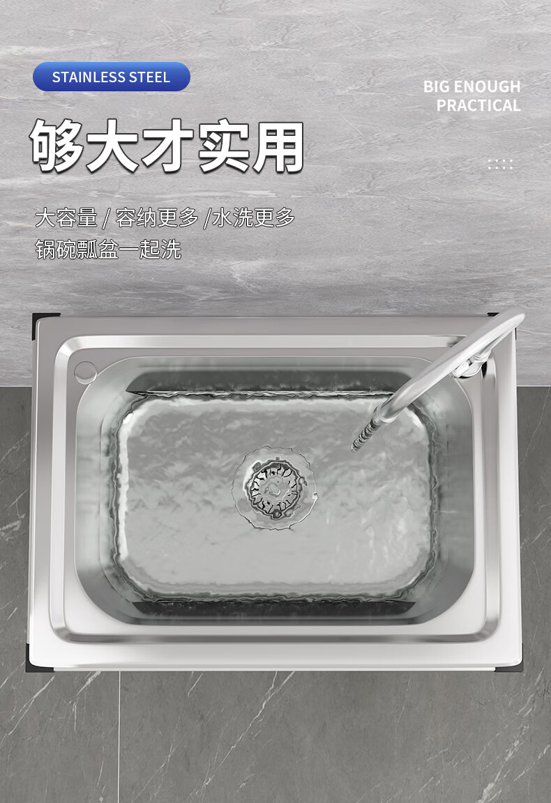 胖东来同款品质代购洗菜盆厨房J加厚简易304不锈钢水槽大单槽双槽 304钢53*38配冷热龙头