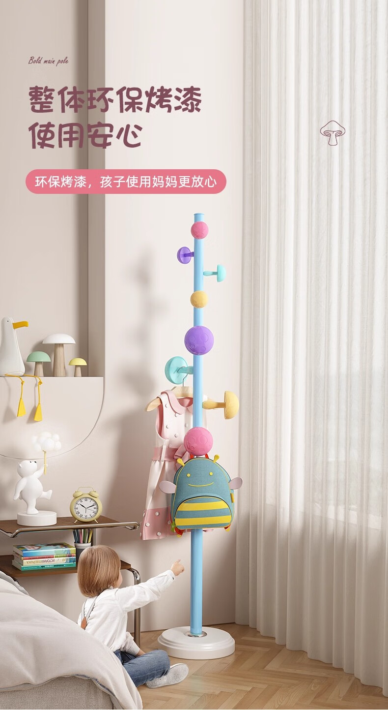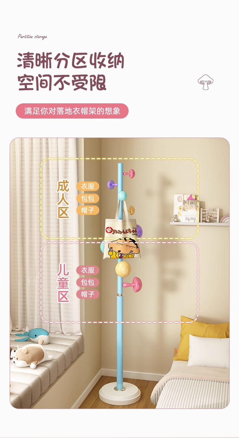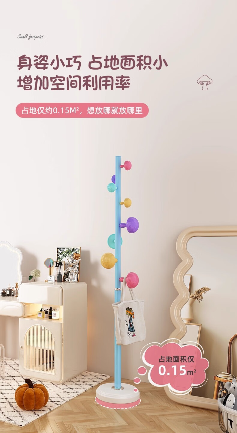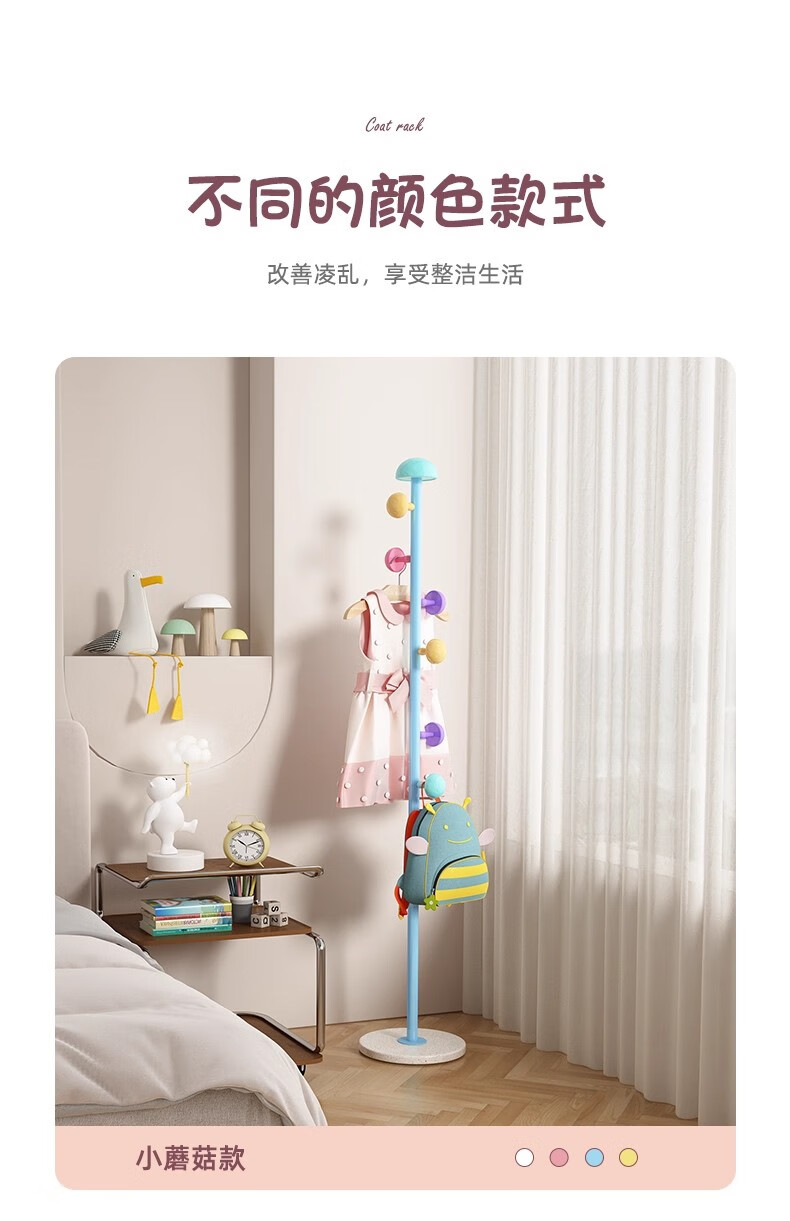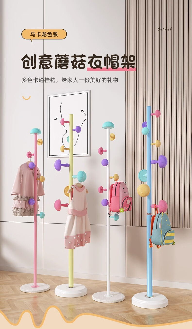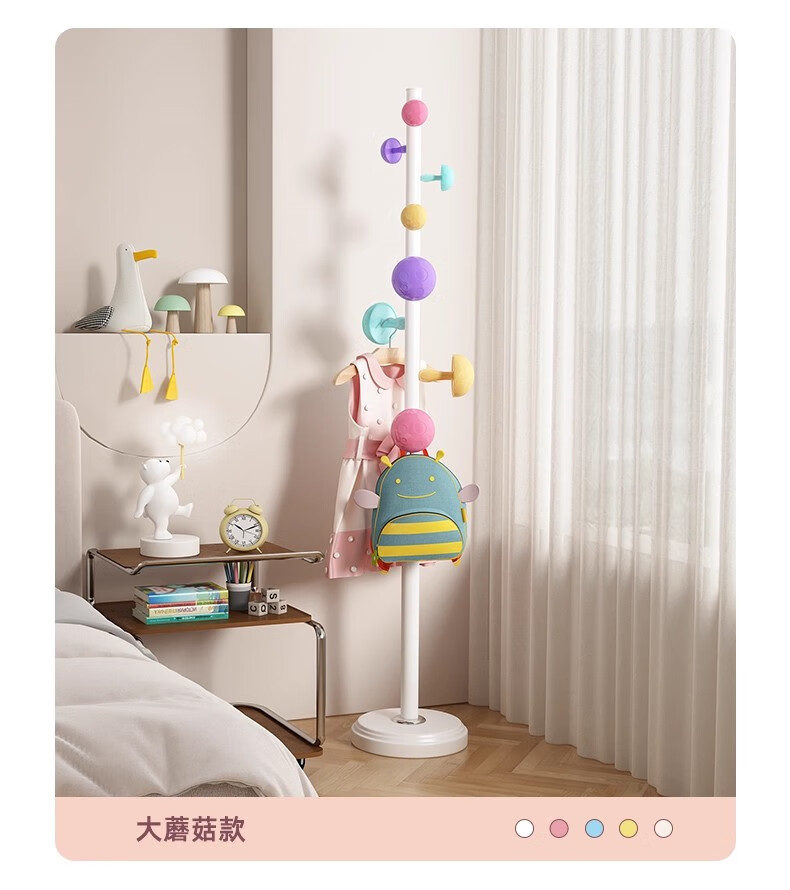 彩色儿童房衣帽架家用卧室衣架落地立式简约网红蘑菇挂衣服收纳架 白色蘑菇衣架 1层