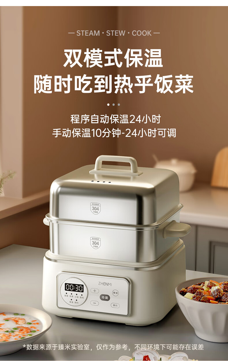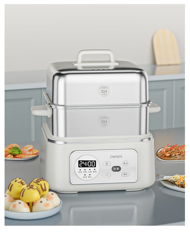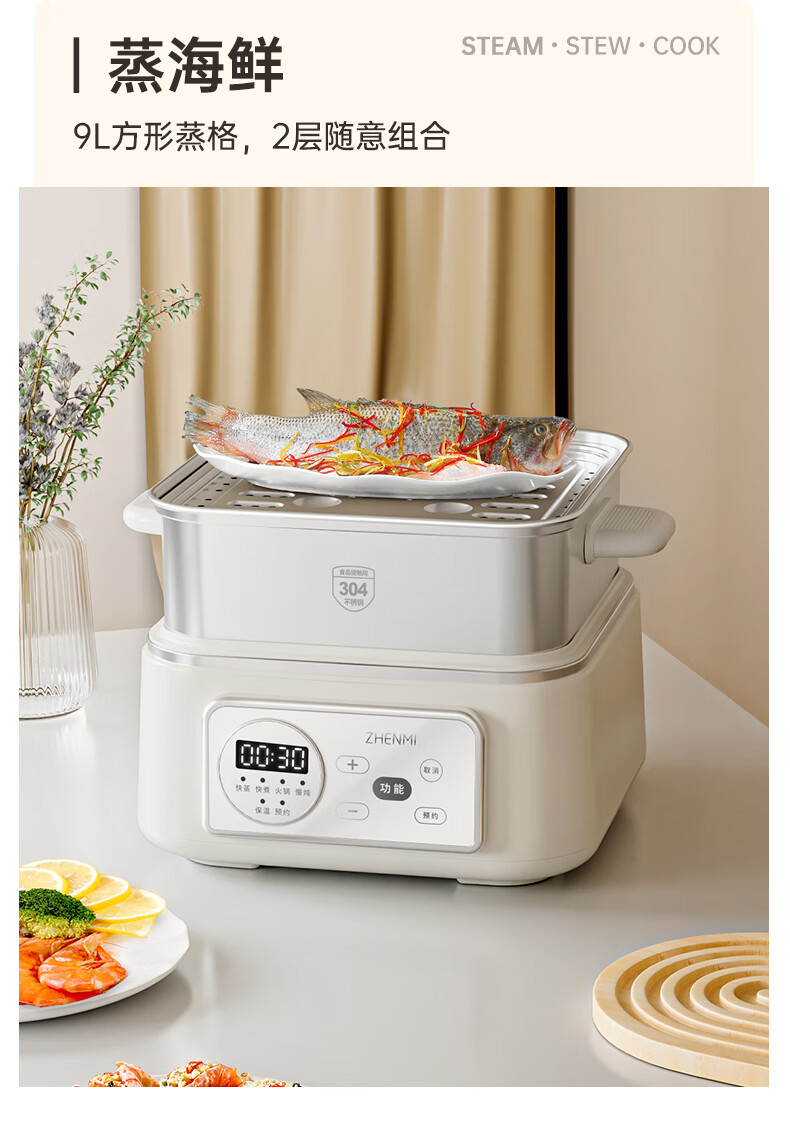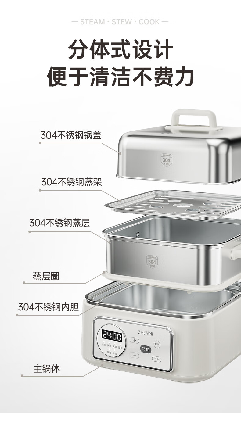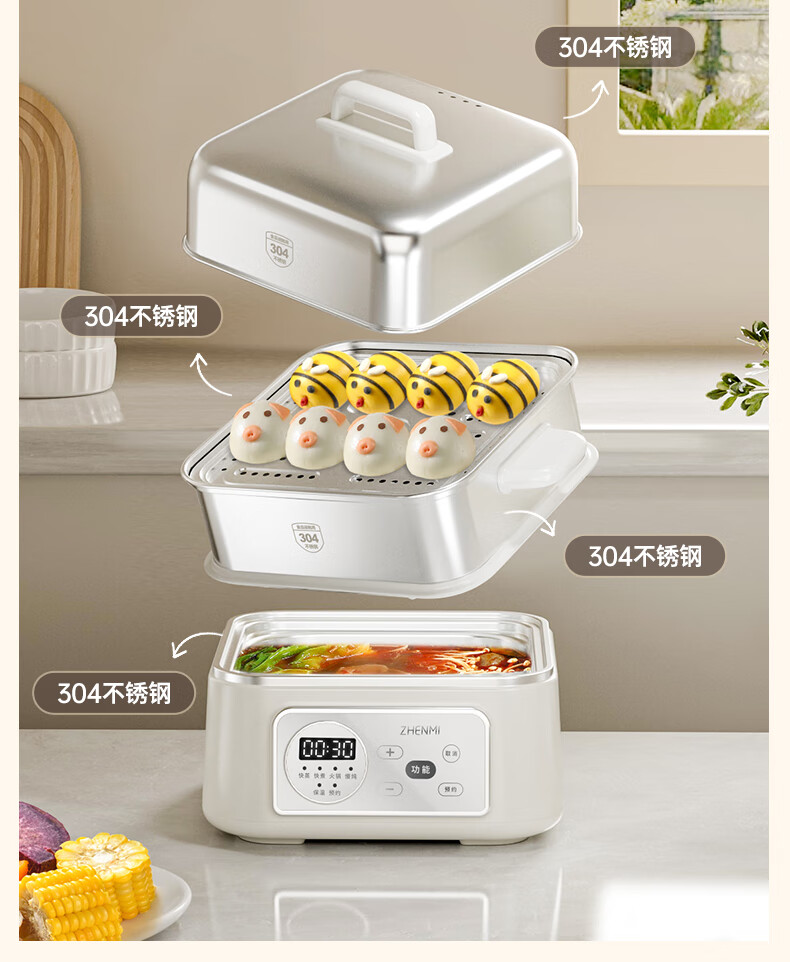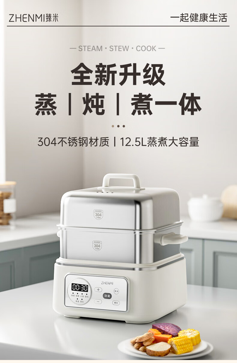 臻米电蒸锅炖蒸煮一体多功能锅双层大容量0涂层304不锈钢材质蒸笼电煮锅