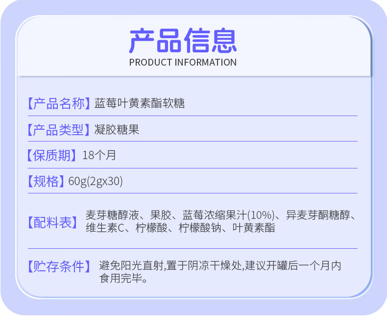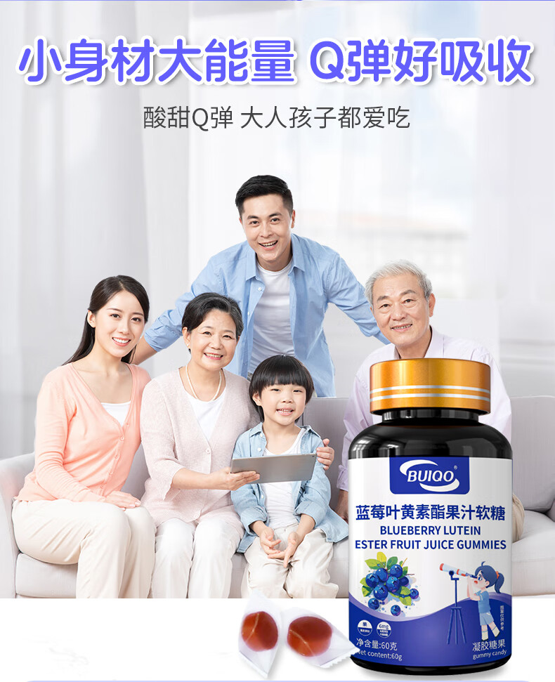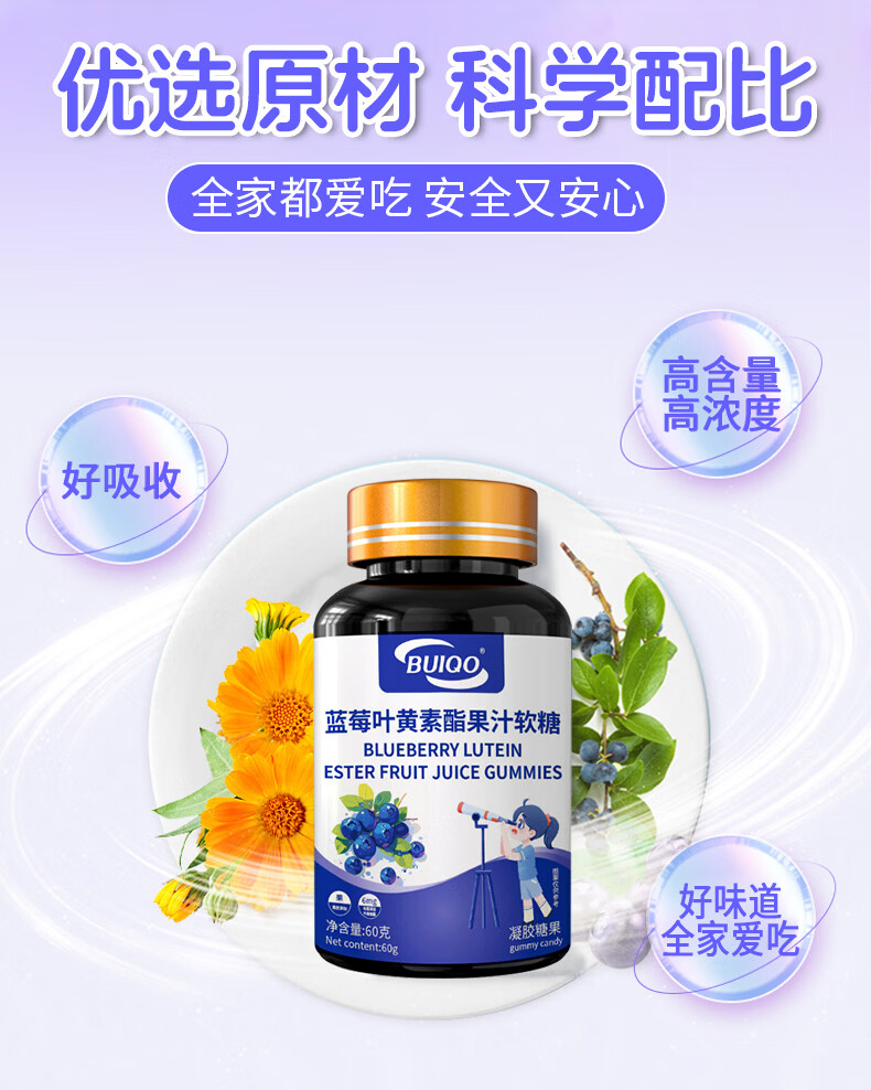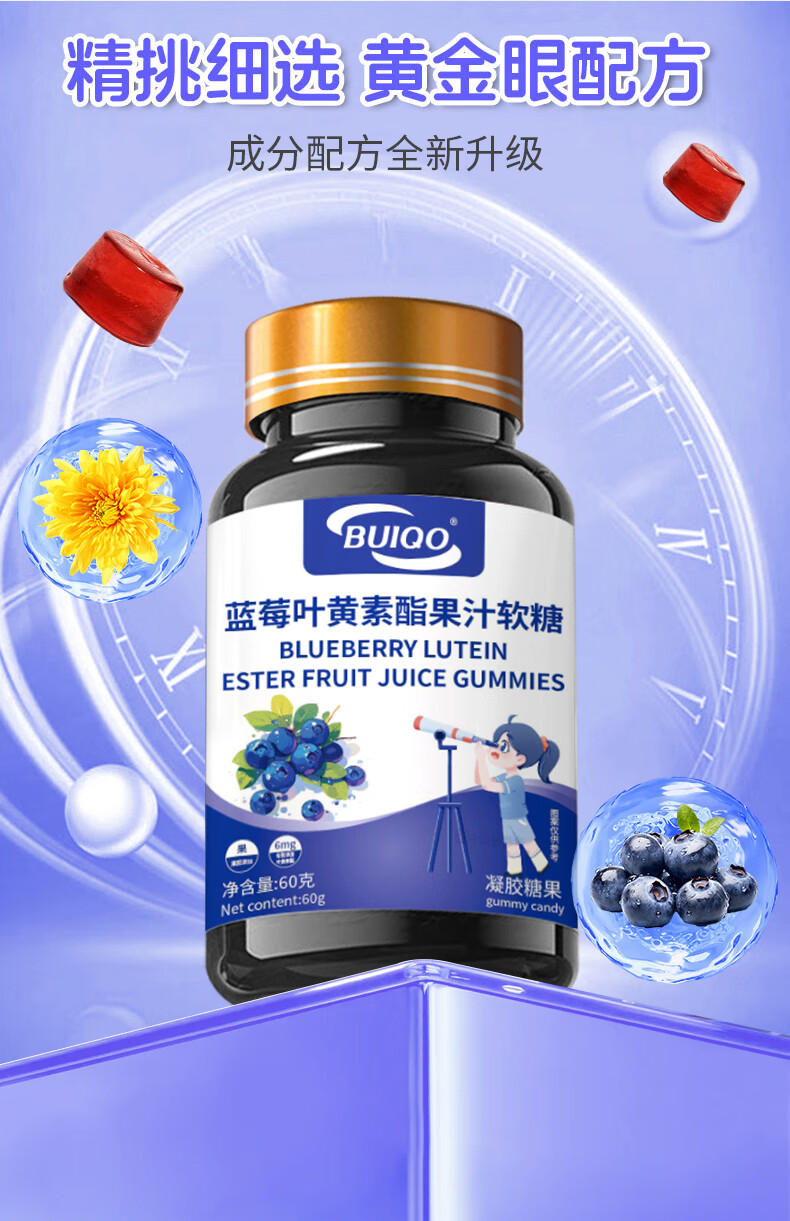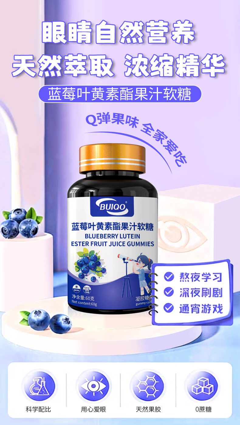 BUIQO蓝莓叶黄素软糖儿童青少年中老年双眼营养成人眼睛疲劳营养素 60g*5瓶 【约125粒左右】