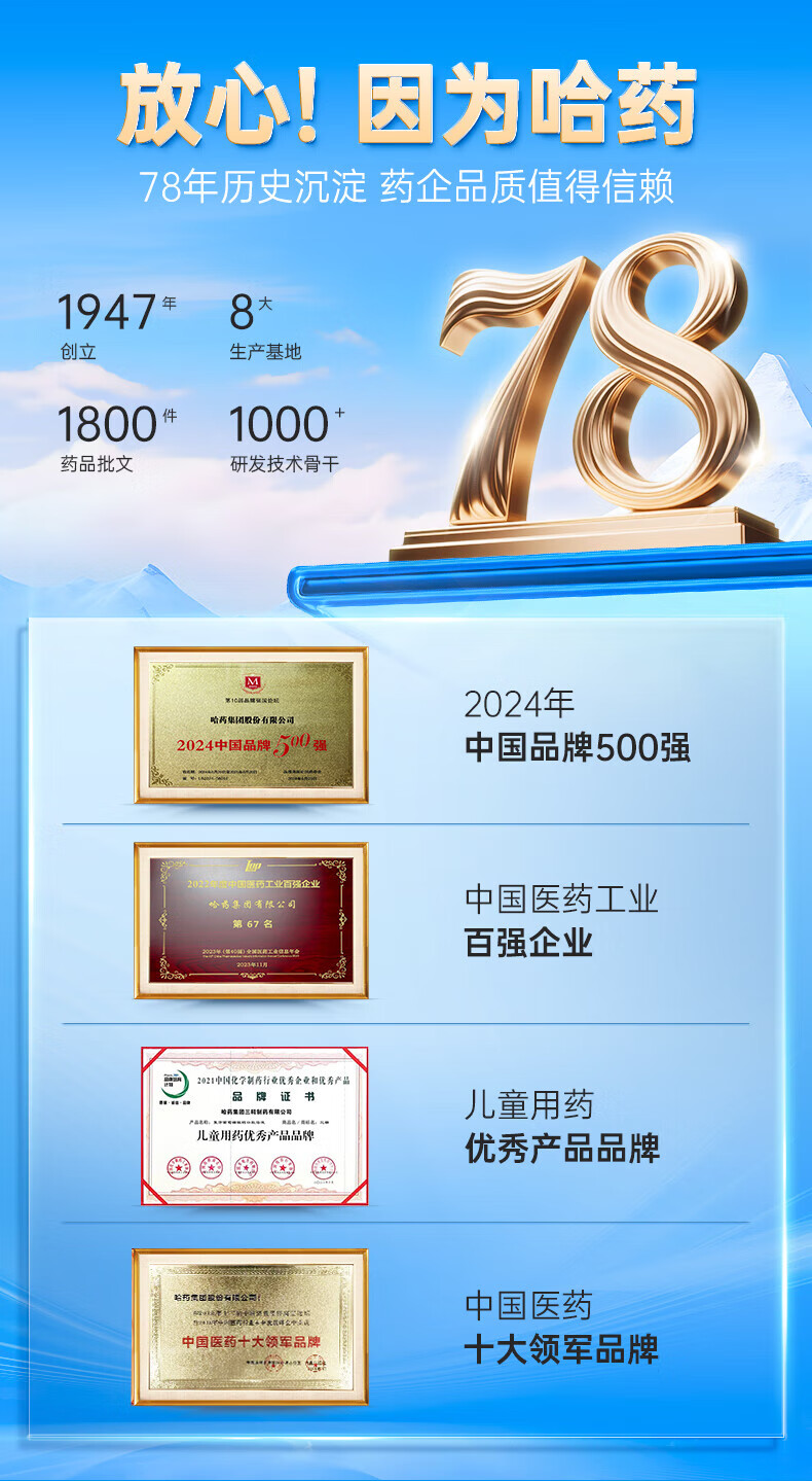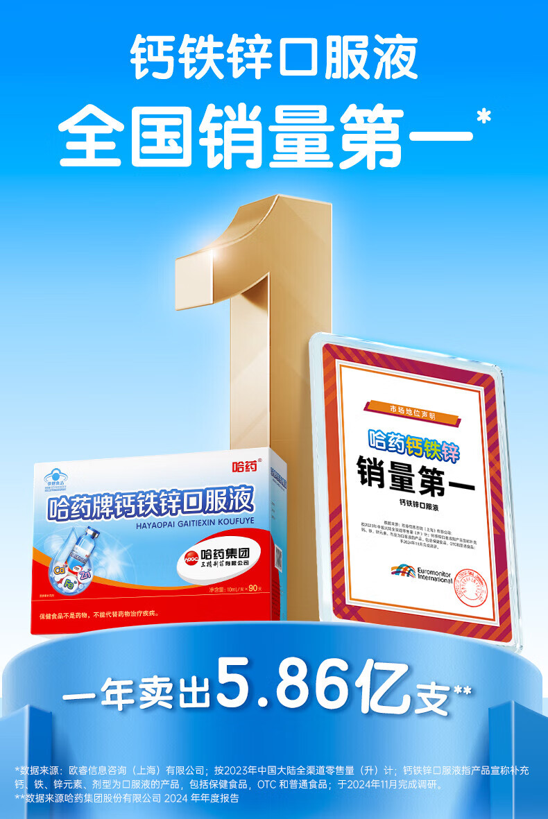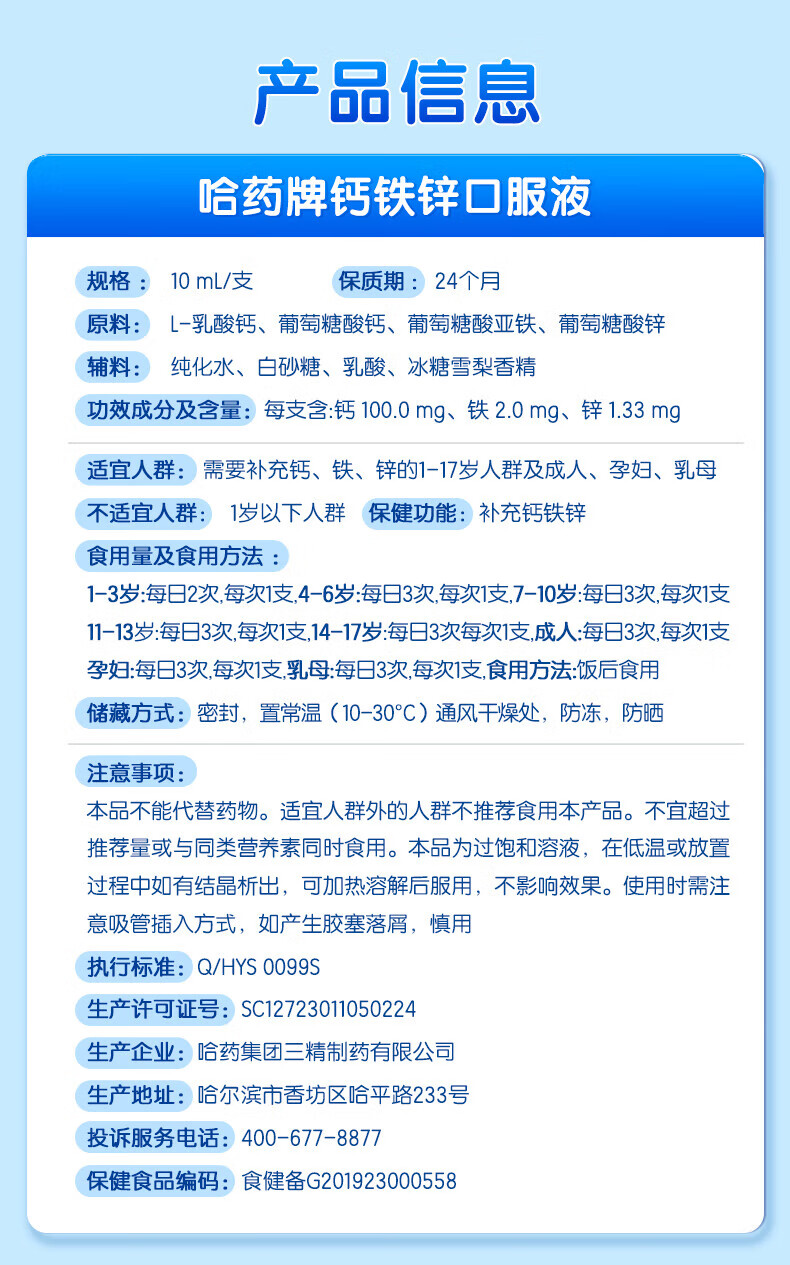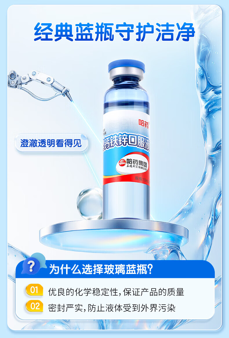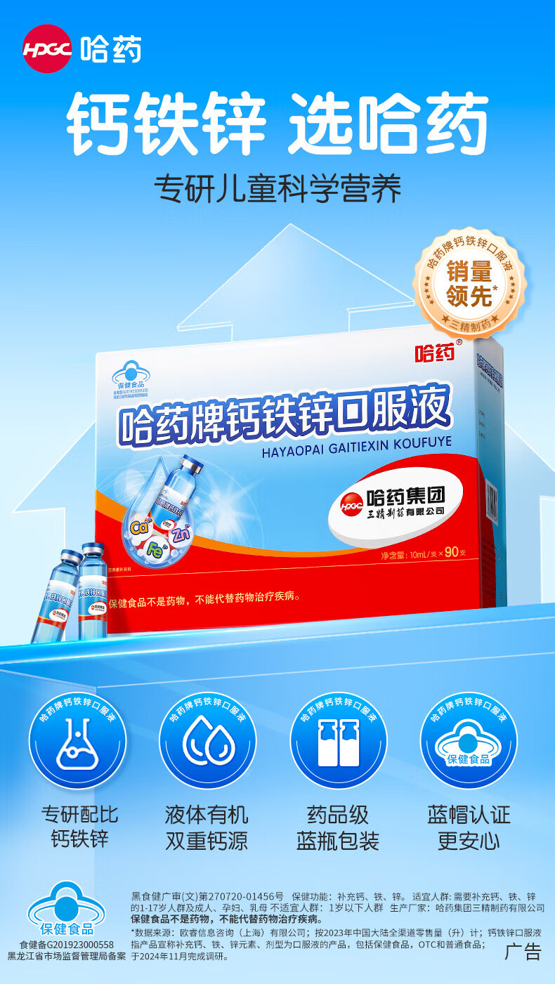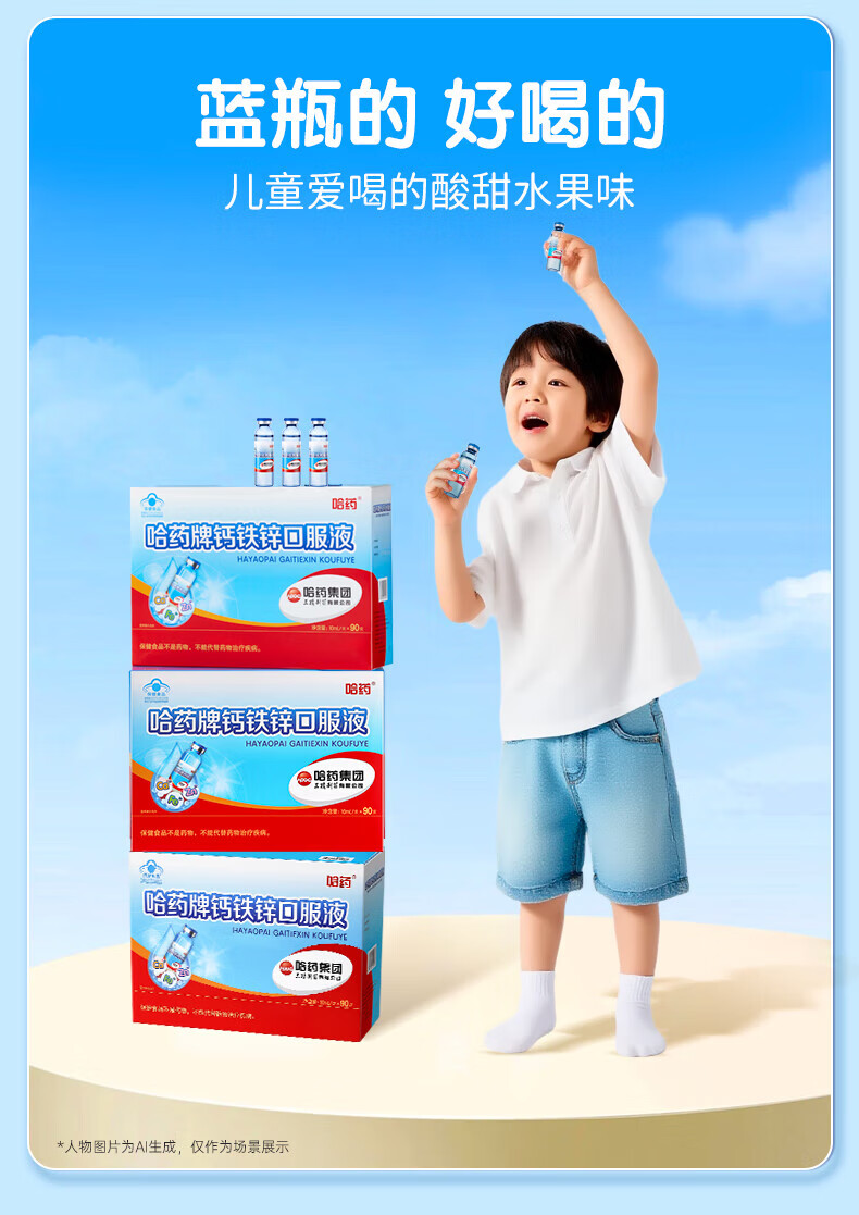 哈药蓝瓶钙铁锌口服液 儿童青少年补钙补锌补铁 小孩孕妇成人液体钙 90支*1盒