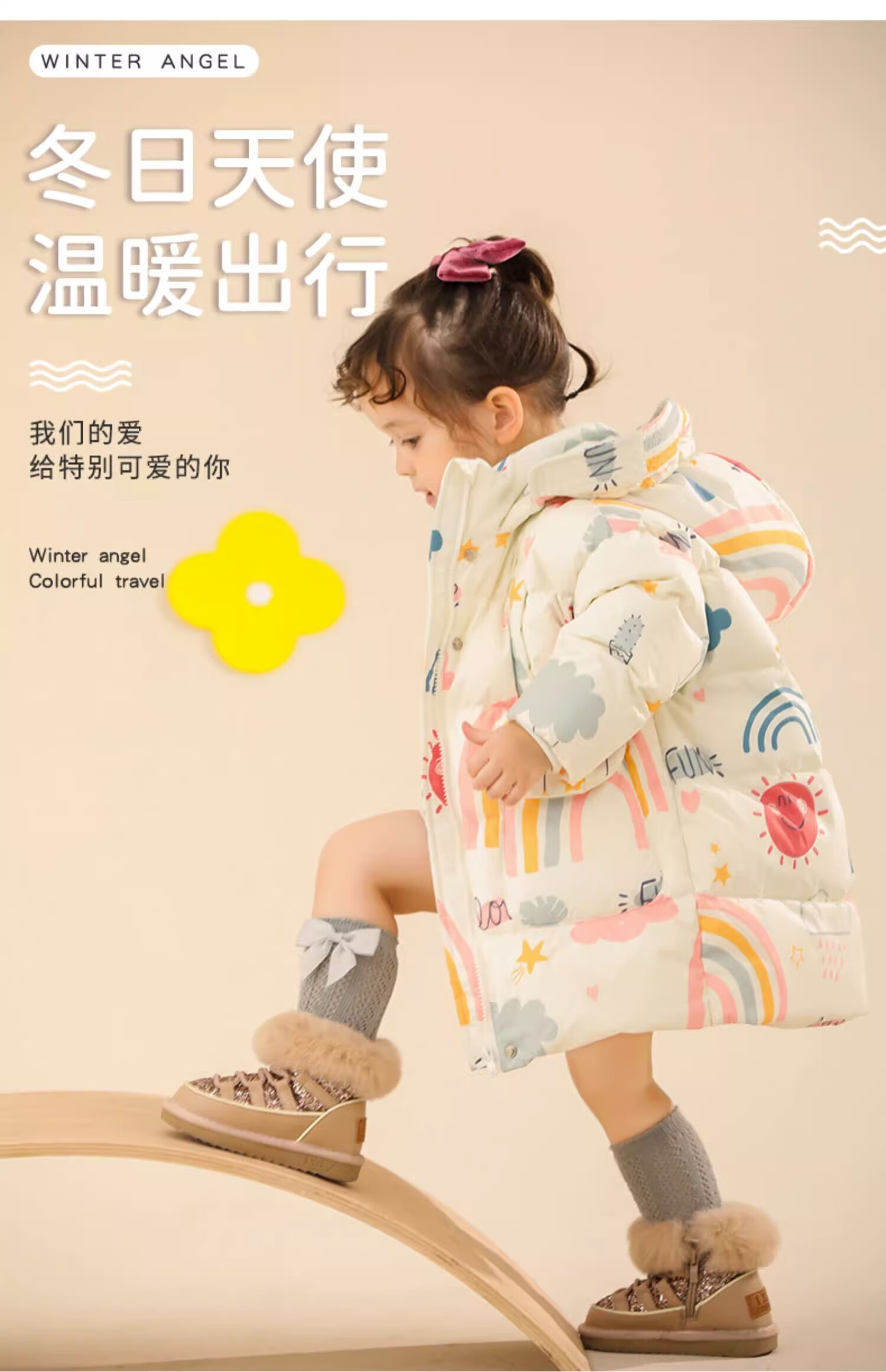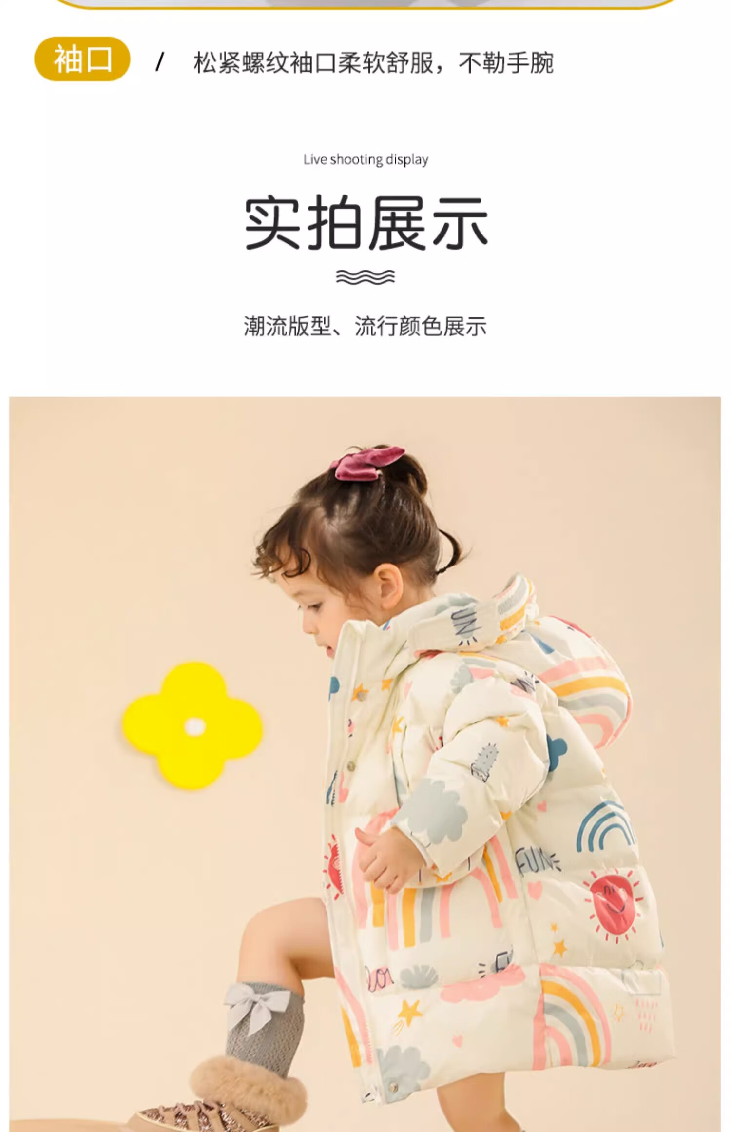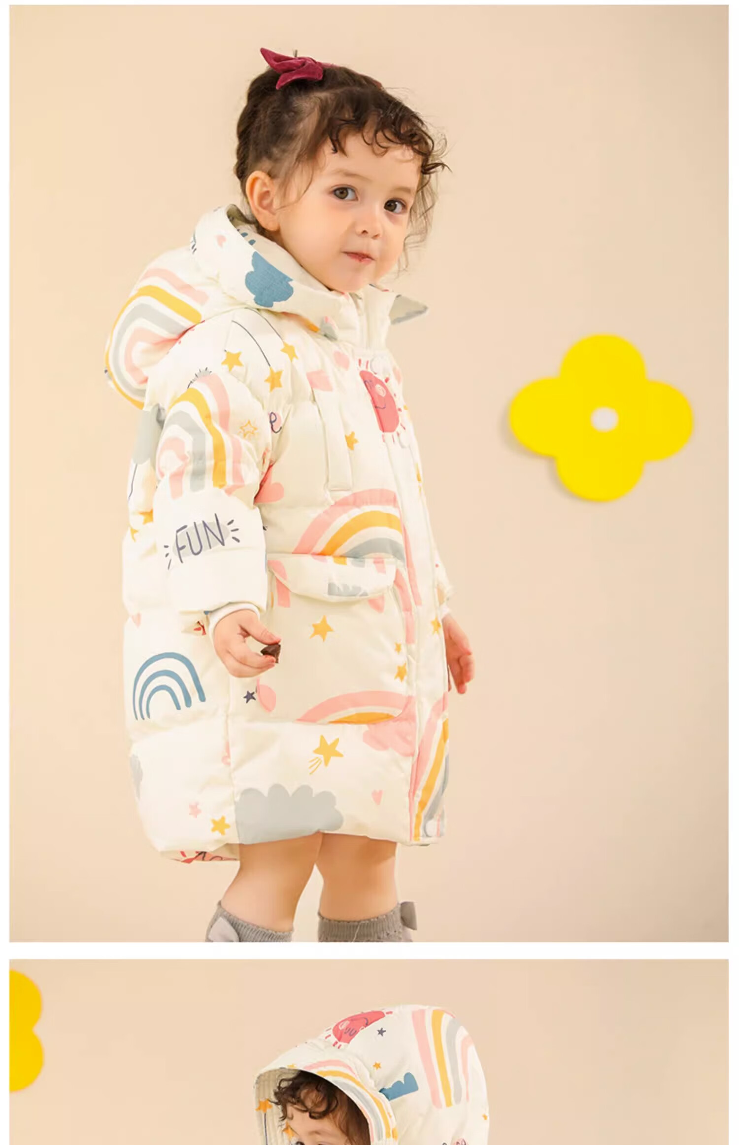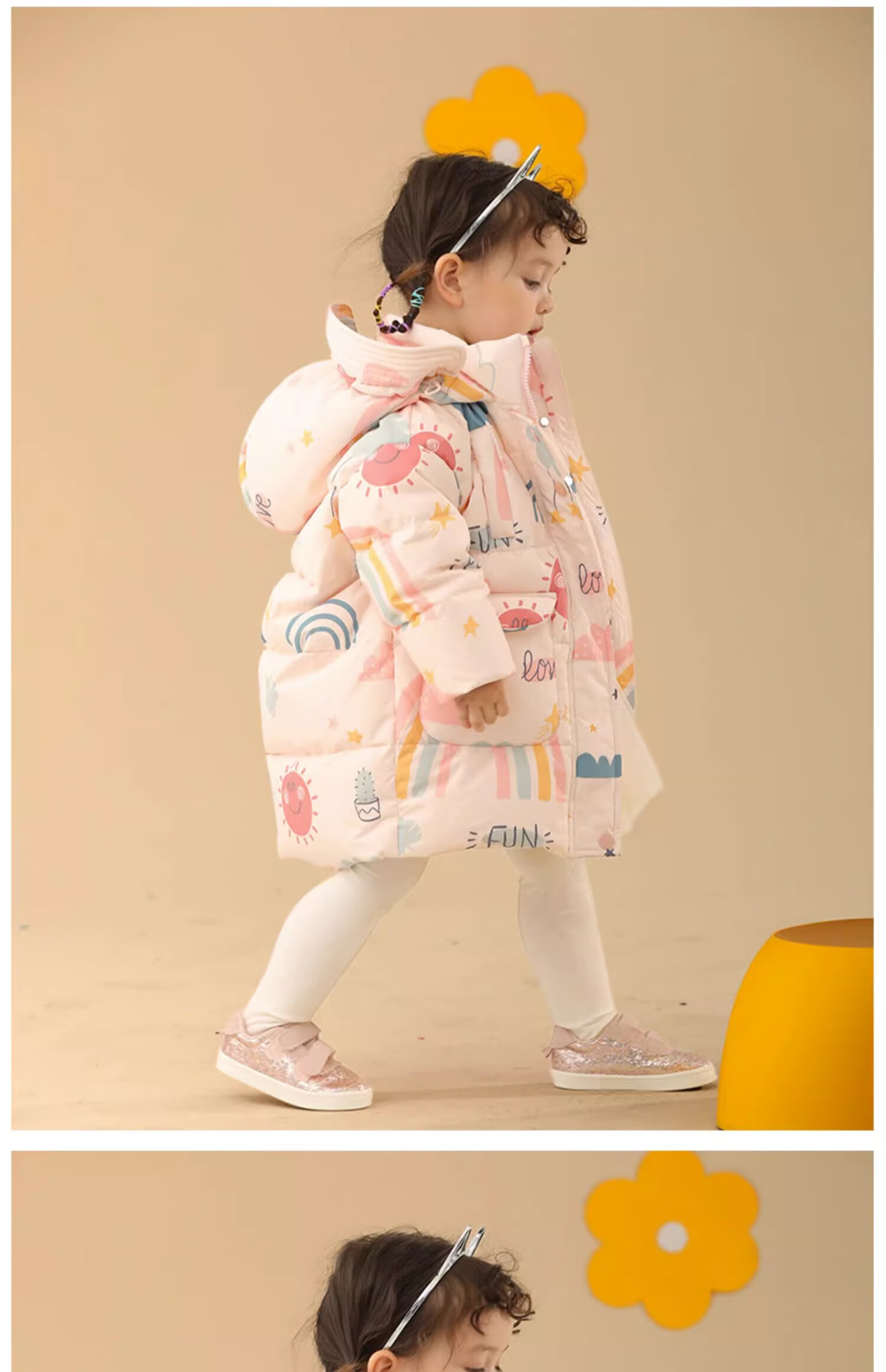 康博女童羽绒服中长款2024新款洋气韩版加厚冬季儿童女孩宝宝保暖外套 米白色 130