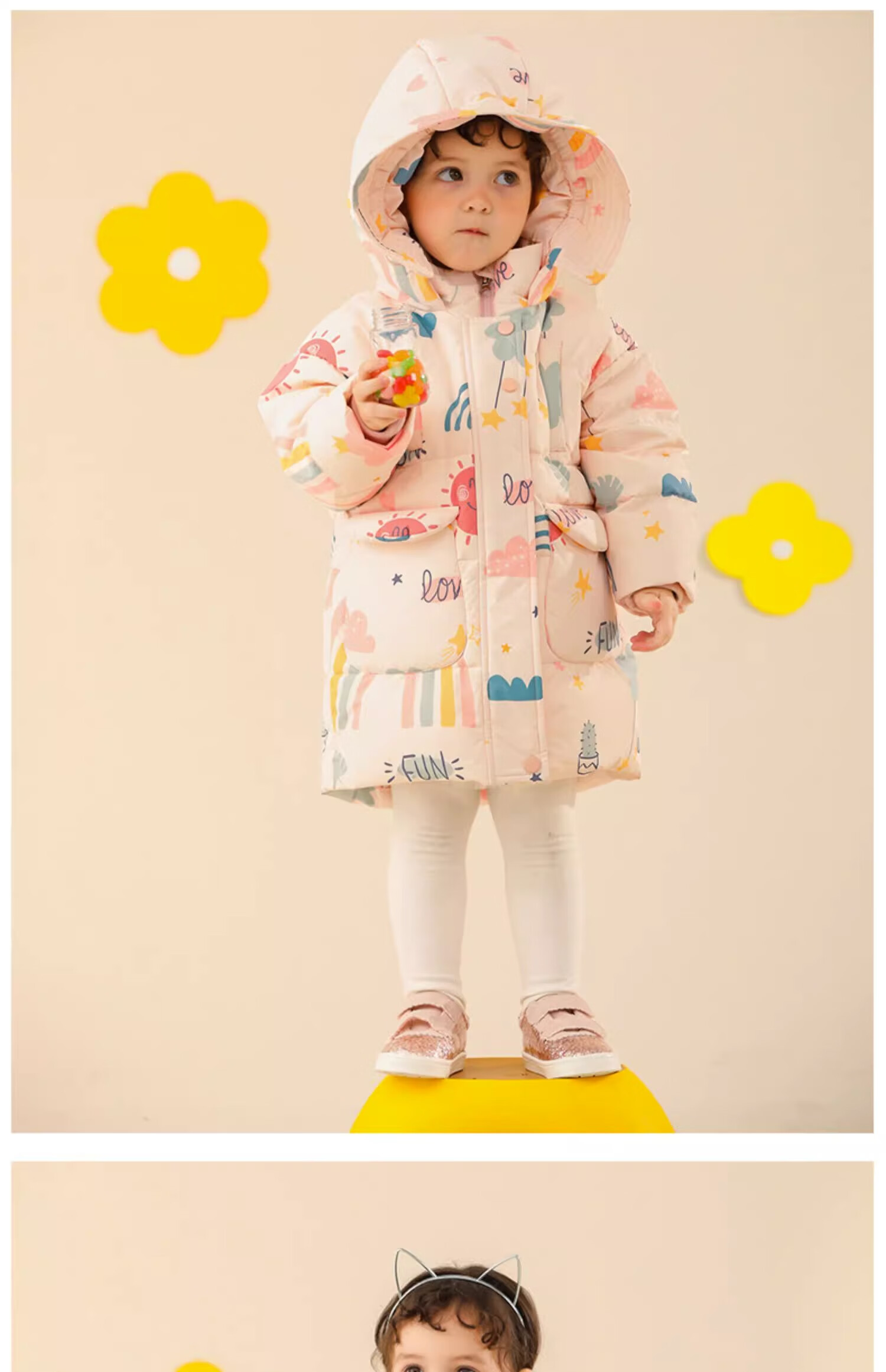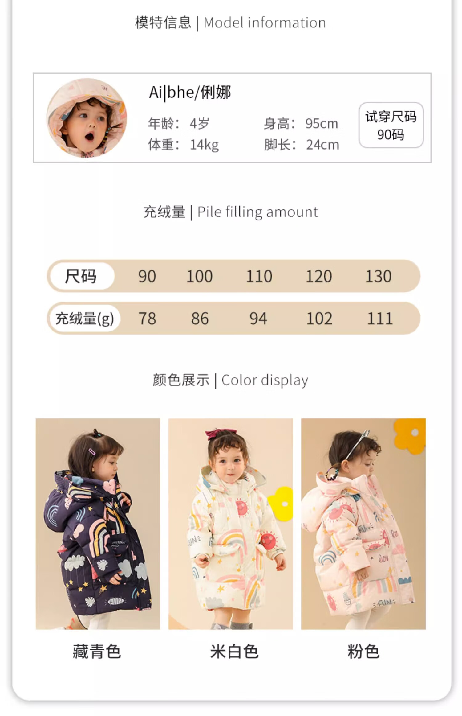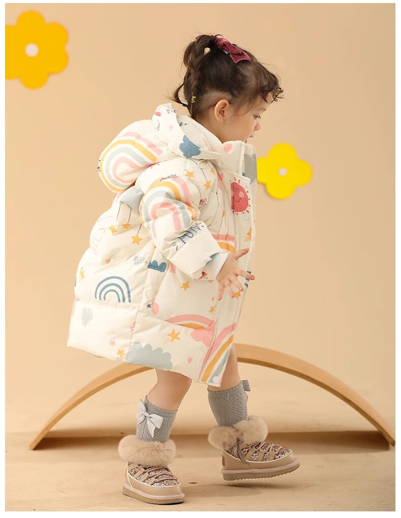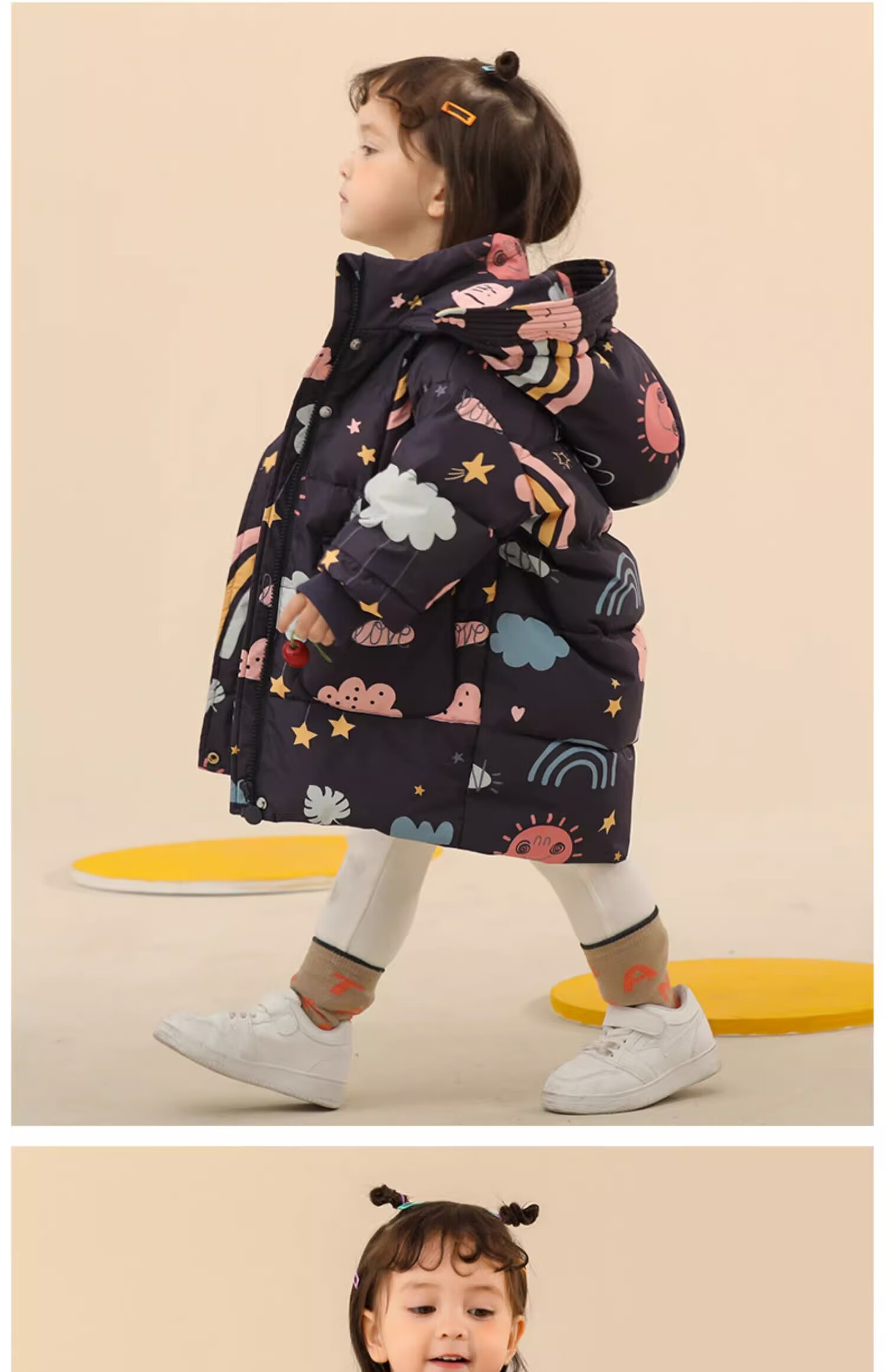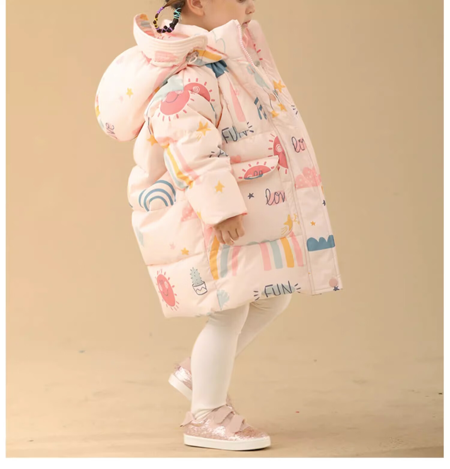 康博女童羽绒服中长款2024新款洋气韩版加厚冬季儿童女孩宝宝保暖外套 米白色 130