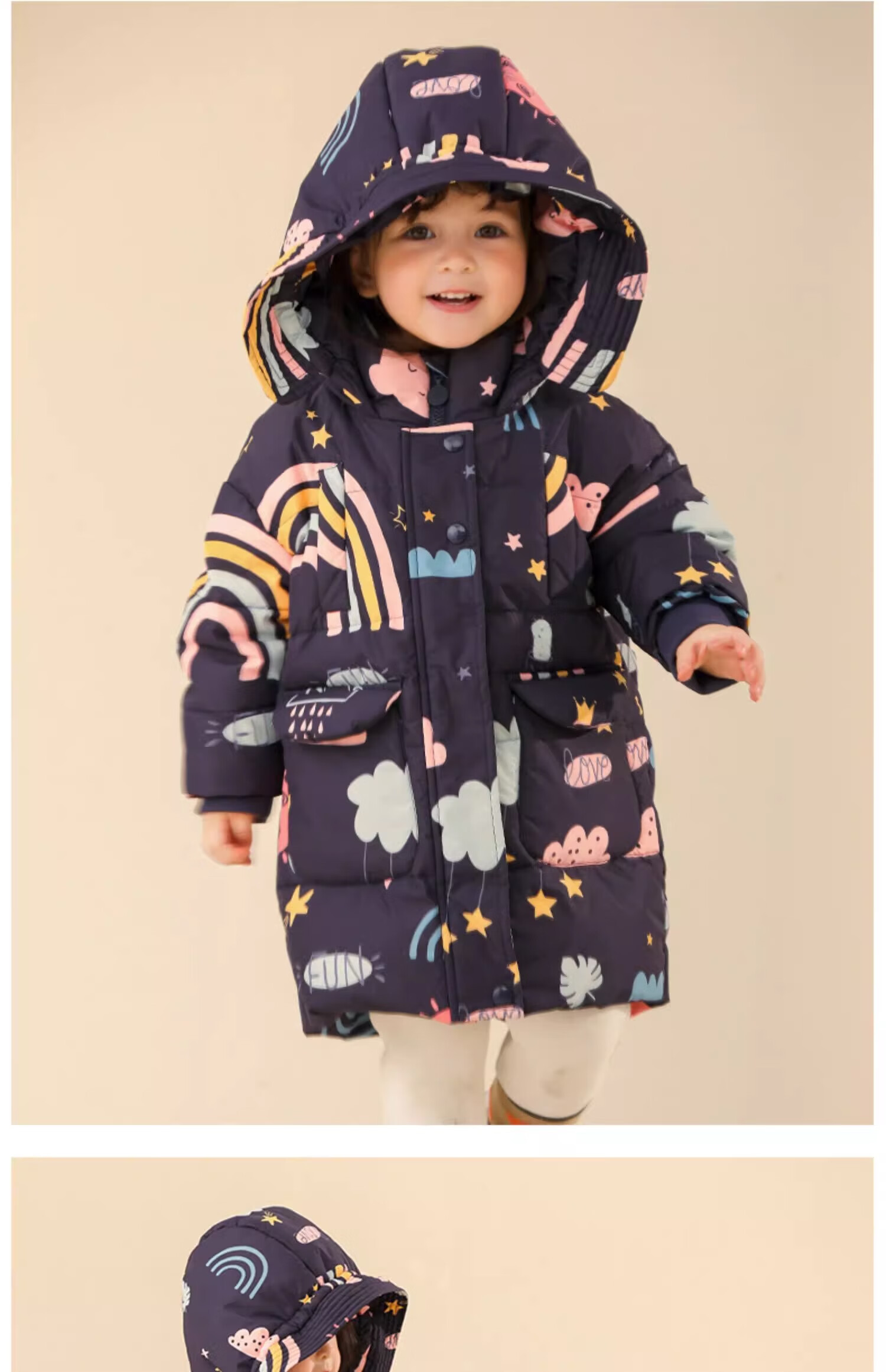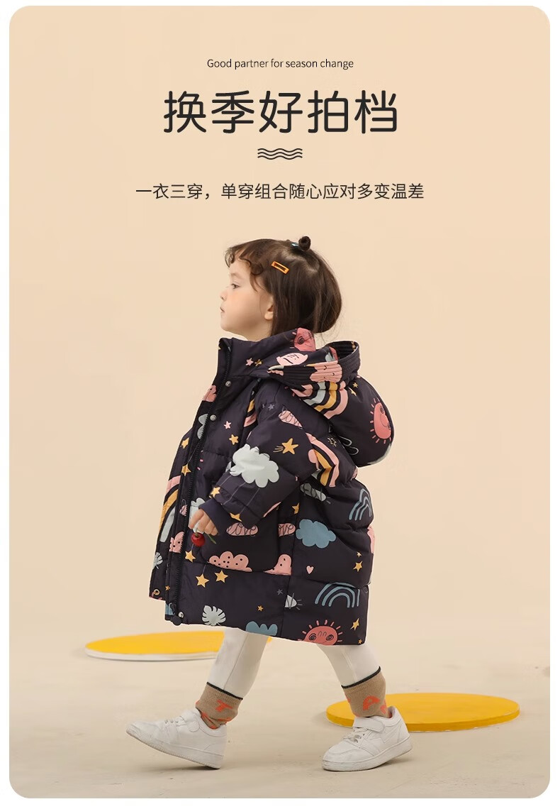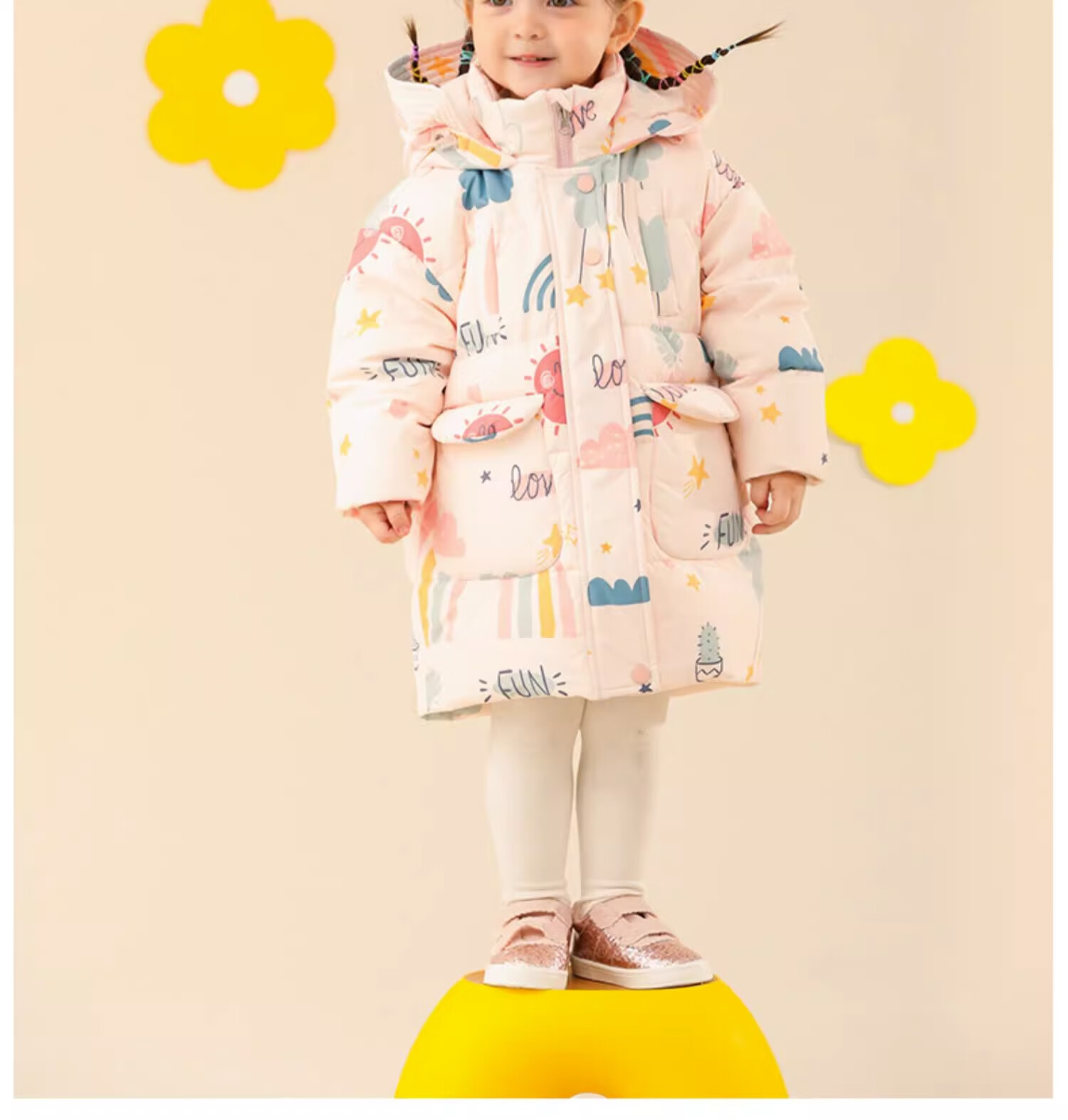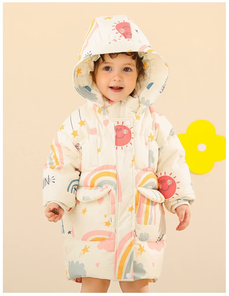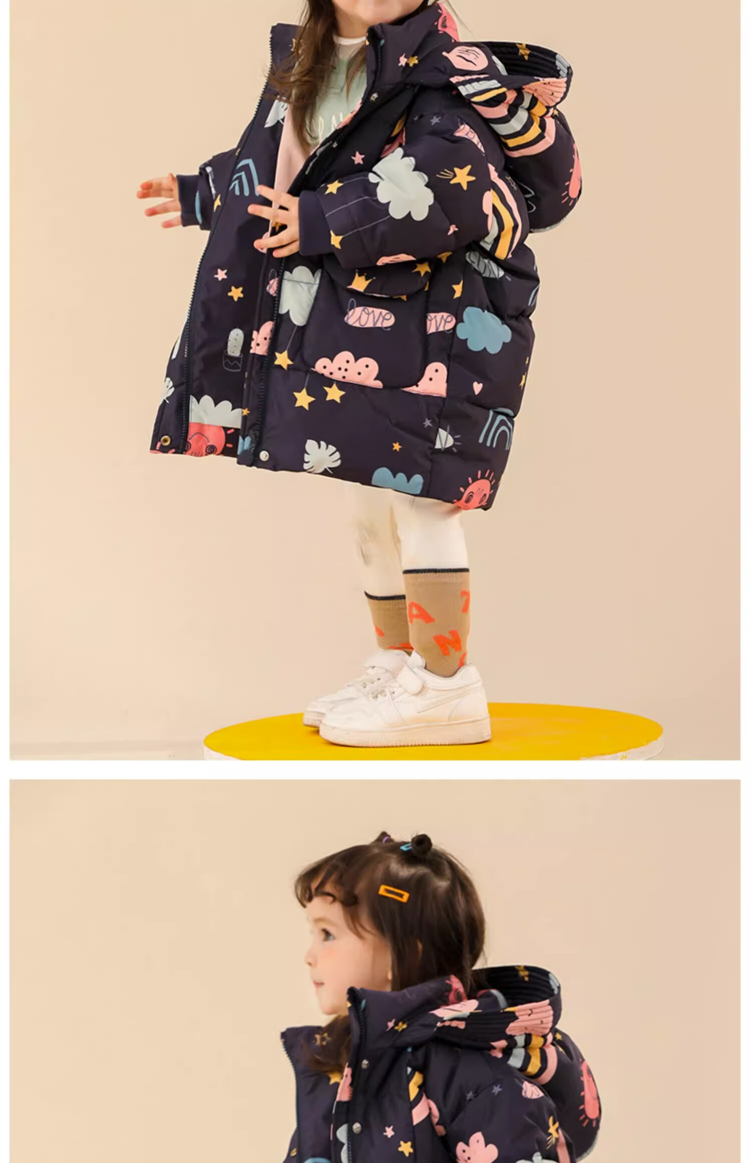 康博女童羽绒服中长款2024新款洋气韩版加厚冬季儿童女孩宝宝保暖外套 米白色 130