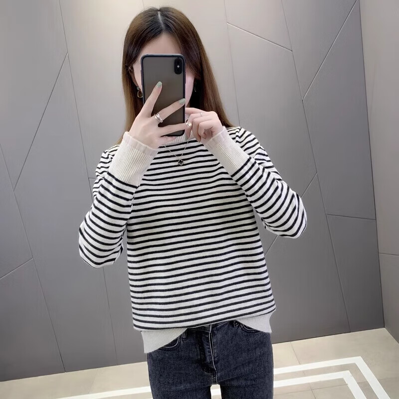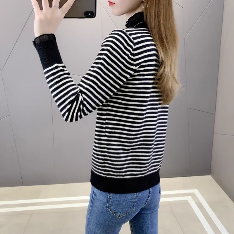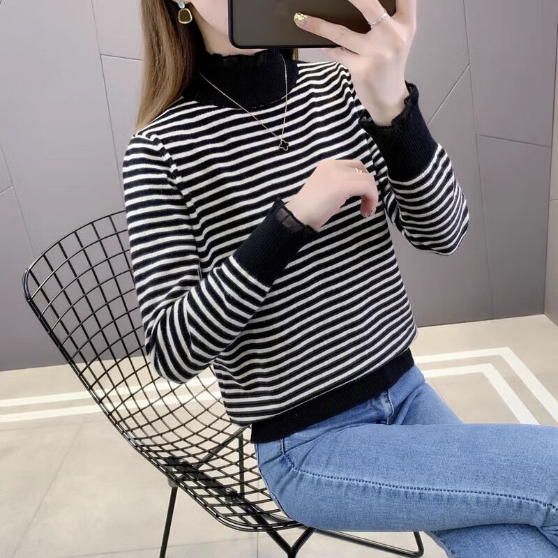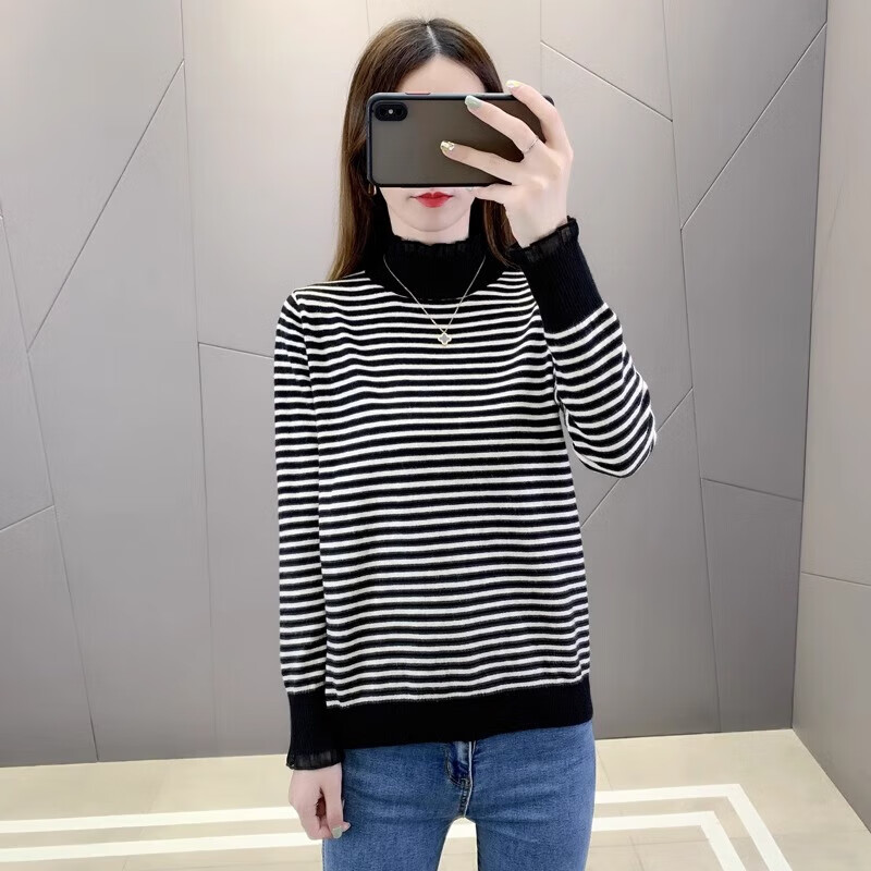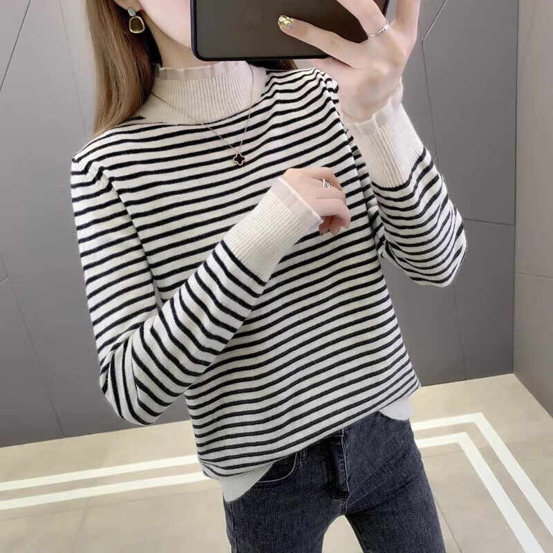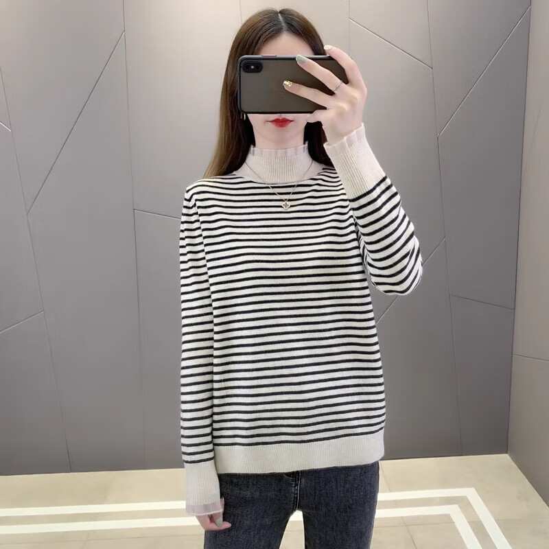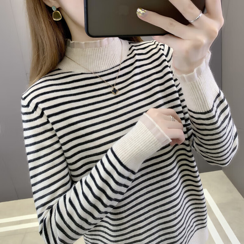 香影纯蕾丝半高领条纹针织打底衫女2025秋冬新款宽松显瘦毛衣女装内搭 杏色 L (建议105-115斤)