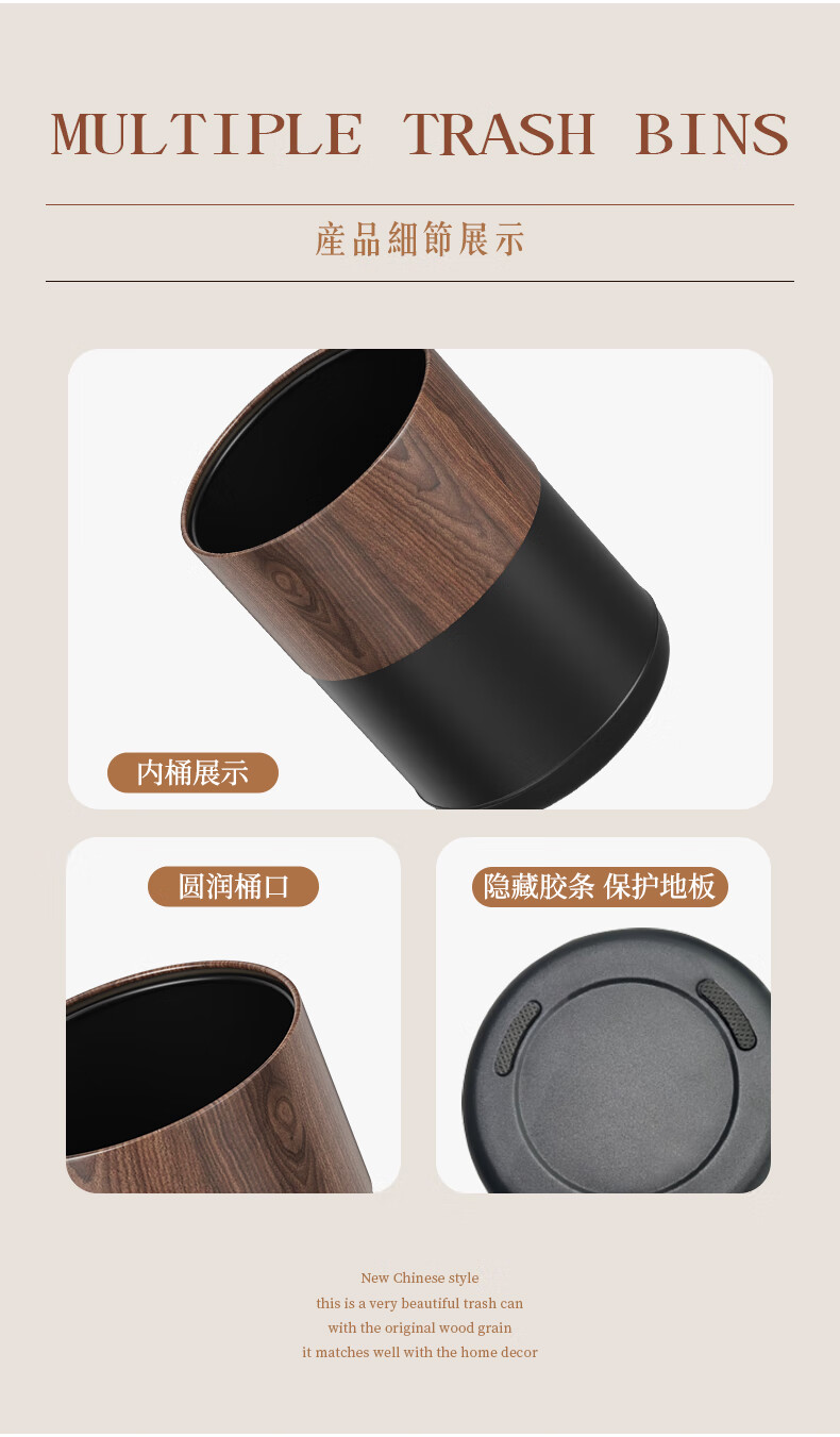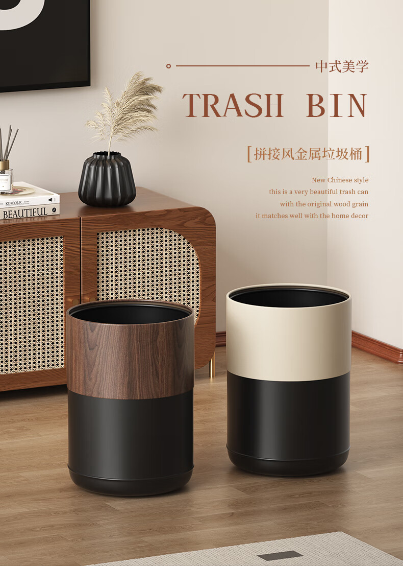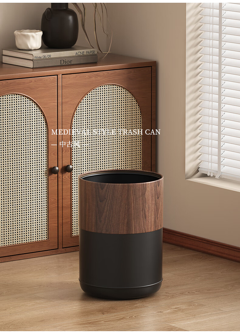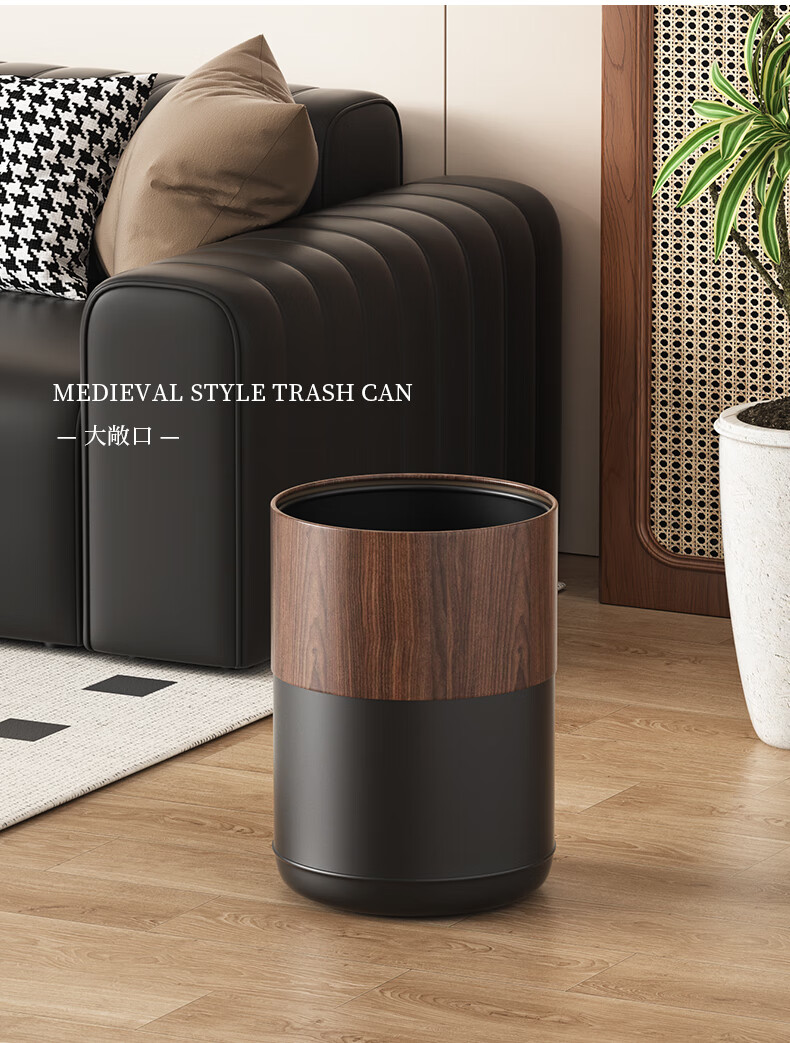 科灵胡桃木纹客厅垃圾桶家用卧室客厅办公室酒店双层2025新款轻奢高档 小苹果款/ 胡桃木纹- 8L