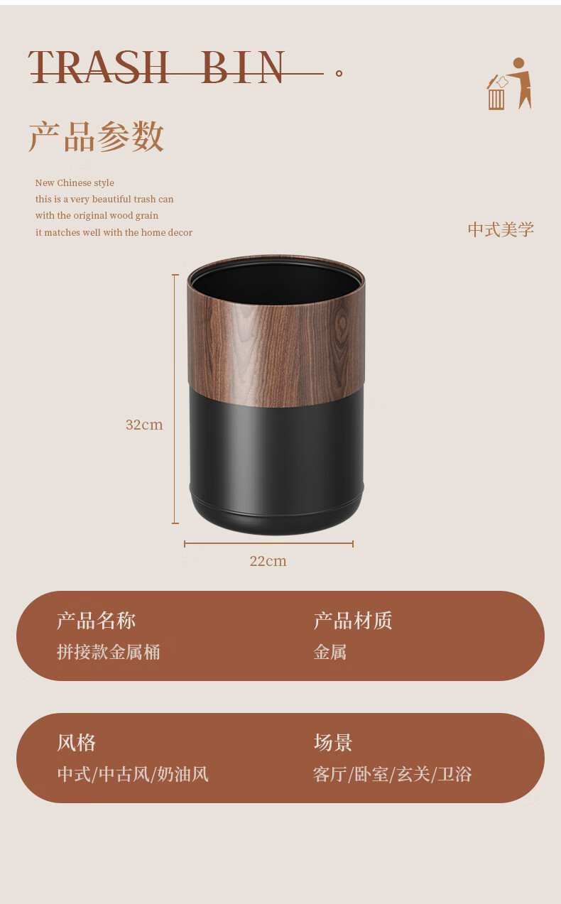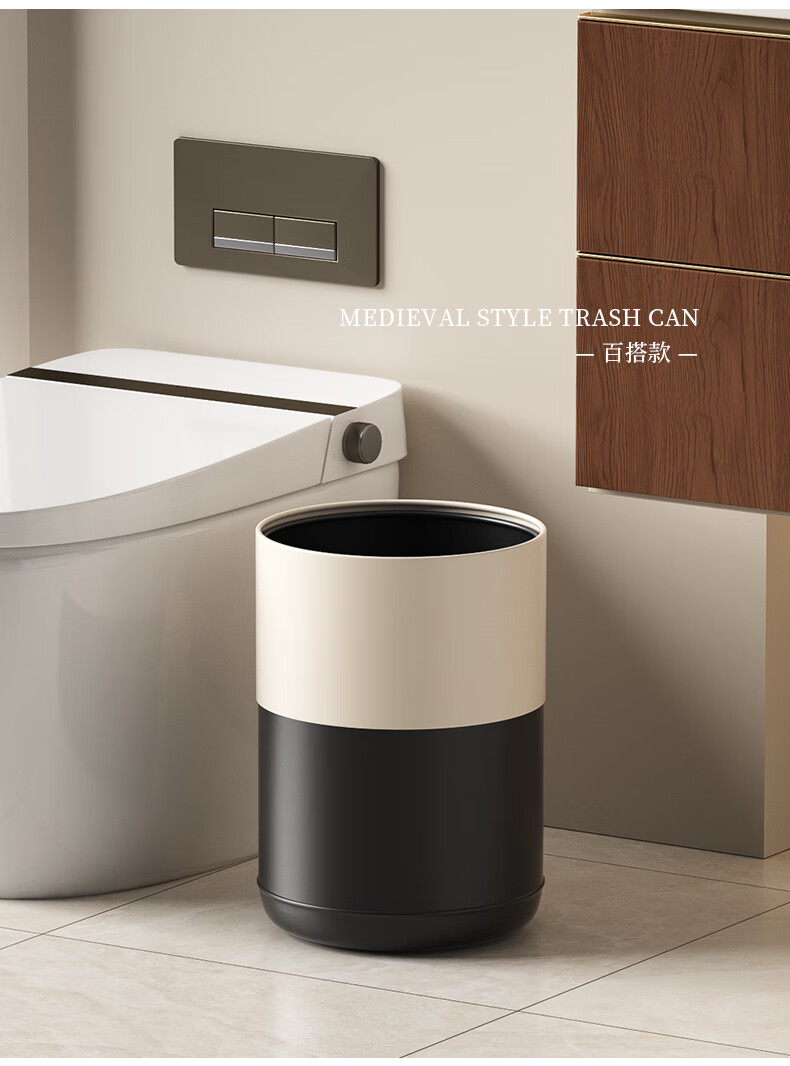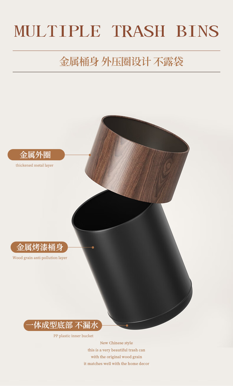 科灵胡桃木纹客厅垃圾桶家用卧室客厅办公室酒店双层2025新款轻奢高档 小苹果款/ 胡桃木纹- 8L