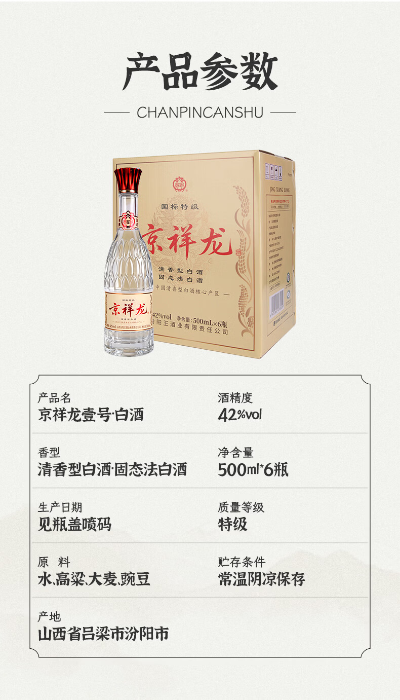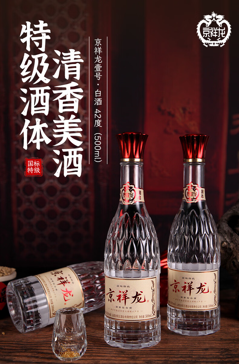 京祥龙 42度特级清香型白酒500ml 纯粮口粮酒送礼宴请整箱酒水 42度 500mL 6瓶 原箱装
