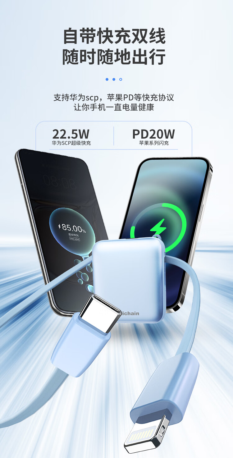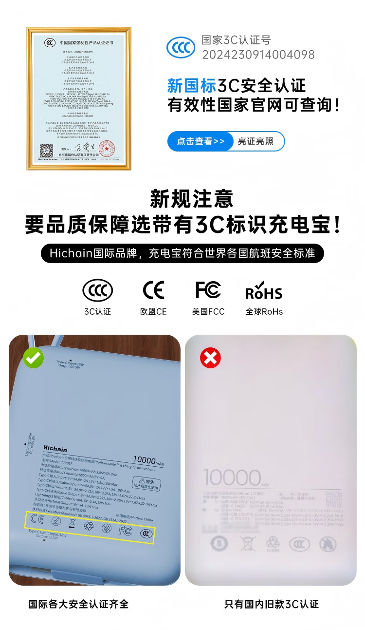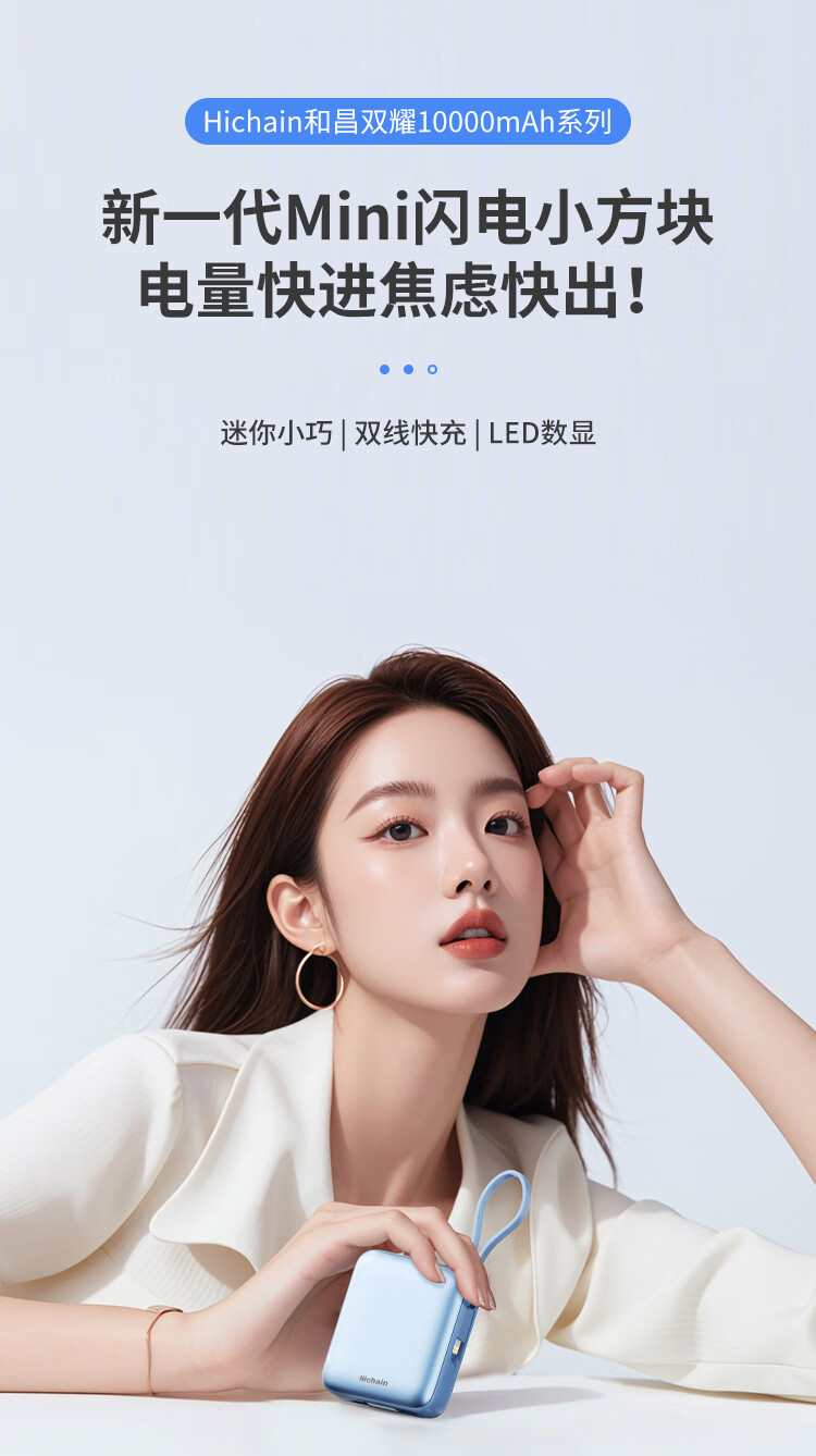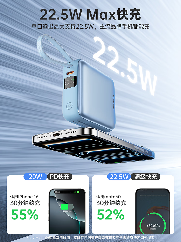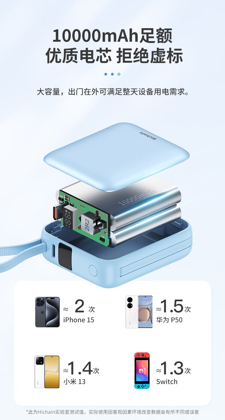 Hichain和昌【国标3C认证可上飞机】充电宝10000毫安22.5W自带双线迷你小巧快充移动电源适用苹果17华为