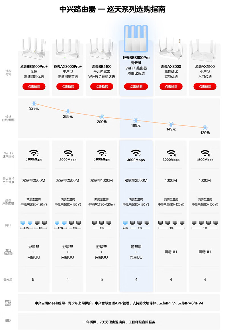 中兴(ZTE)巡天BE3600Pro青云版 2.5G网口千兆无线家用路由器 双频聚合WiFi7 智能游戏加速上网管理