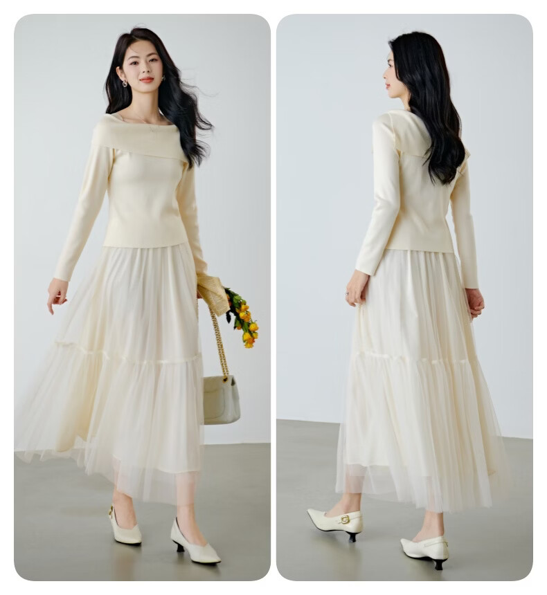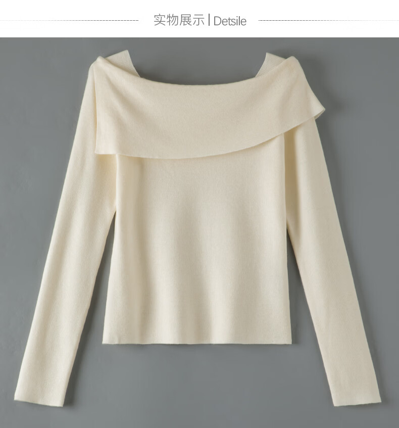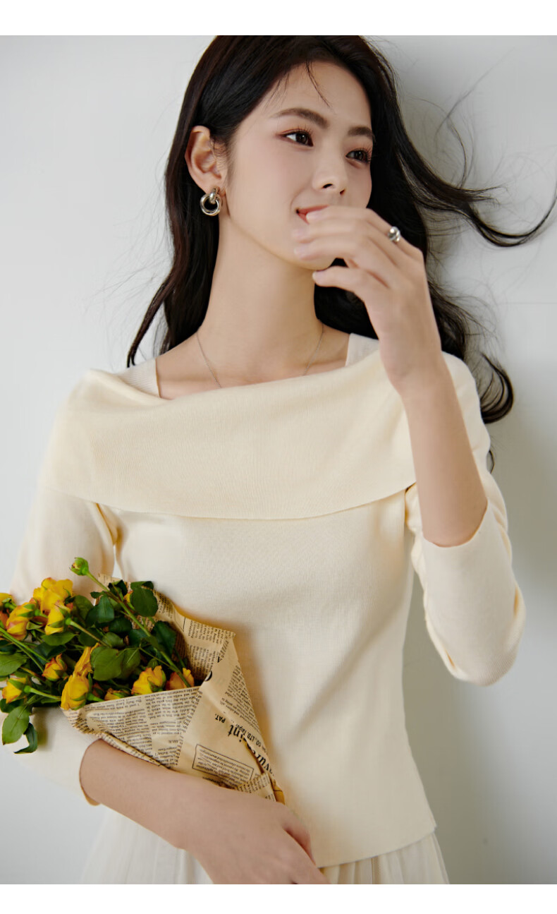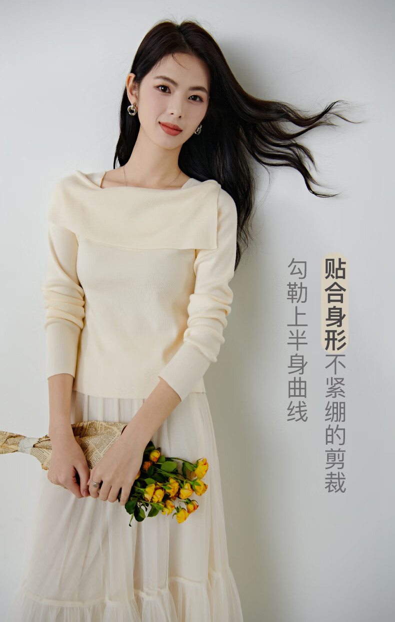 晚白2026春款时尚一字肩大翻领奶油风毛衣减龄显年轻舒适针织衫 米杏色 L