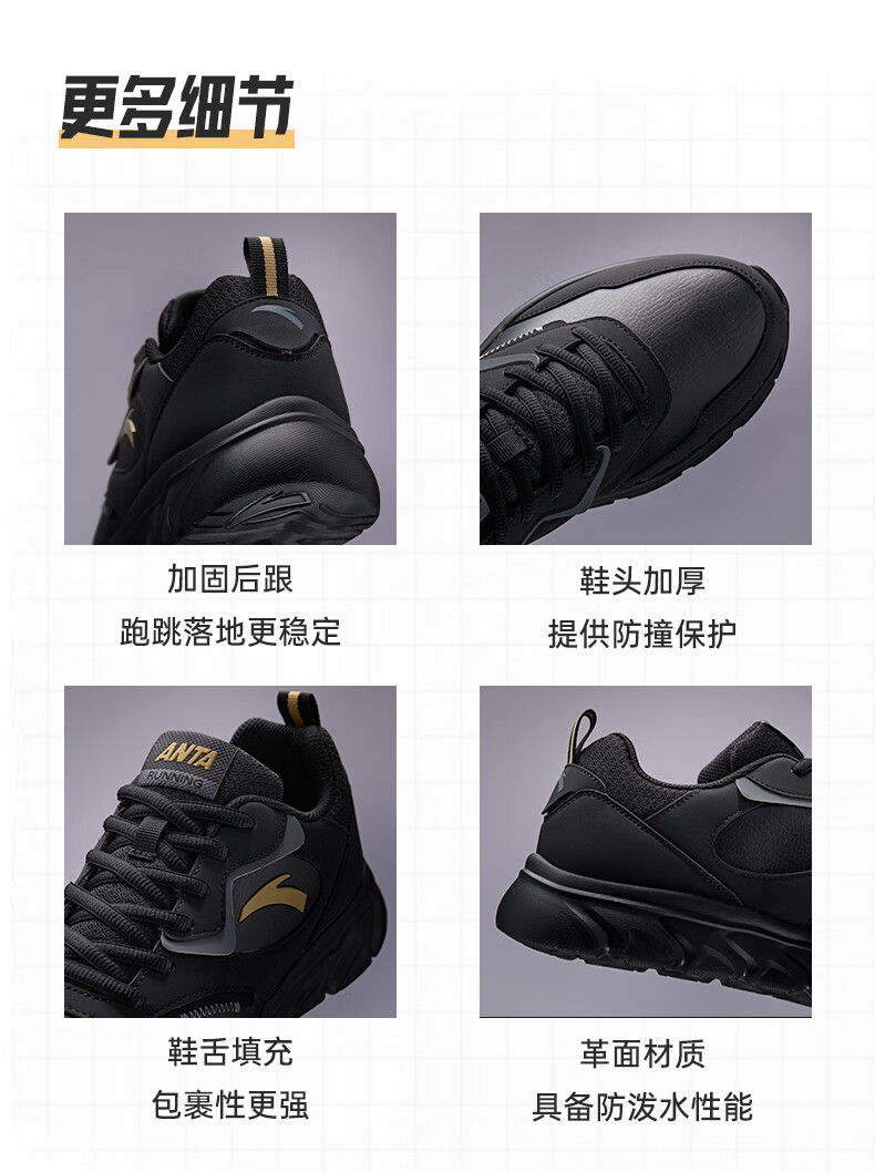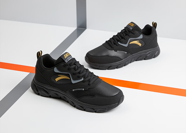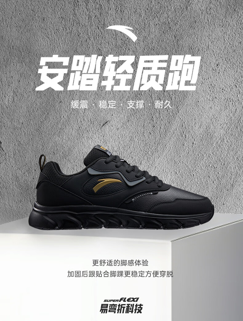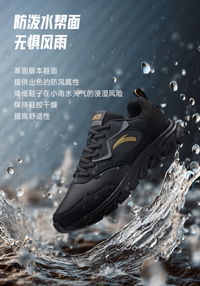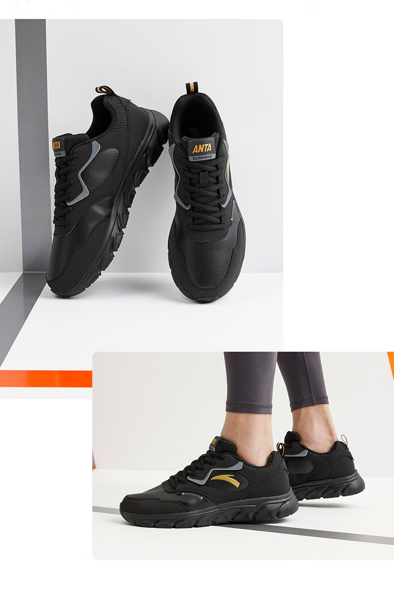 安踏男鞋革面防泼水跑步鞋男黑色轻便防滑休闲鞋运动鞋旅游鞋子男