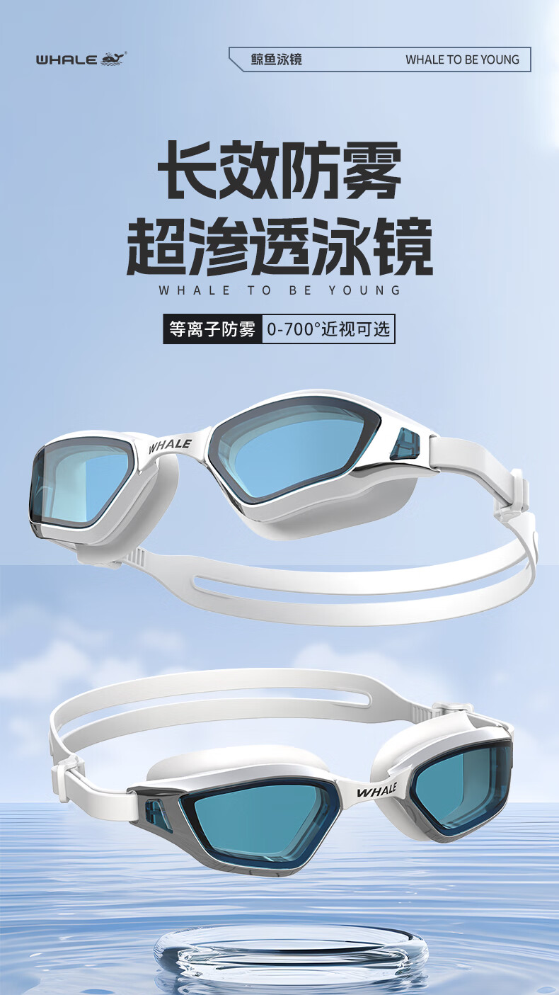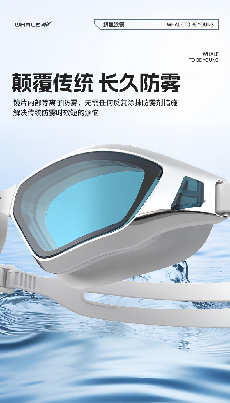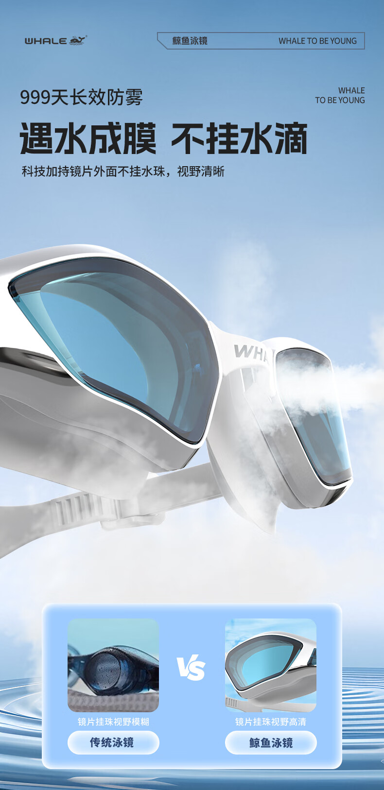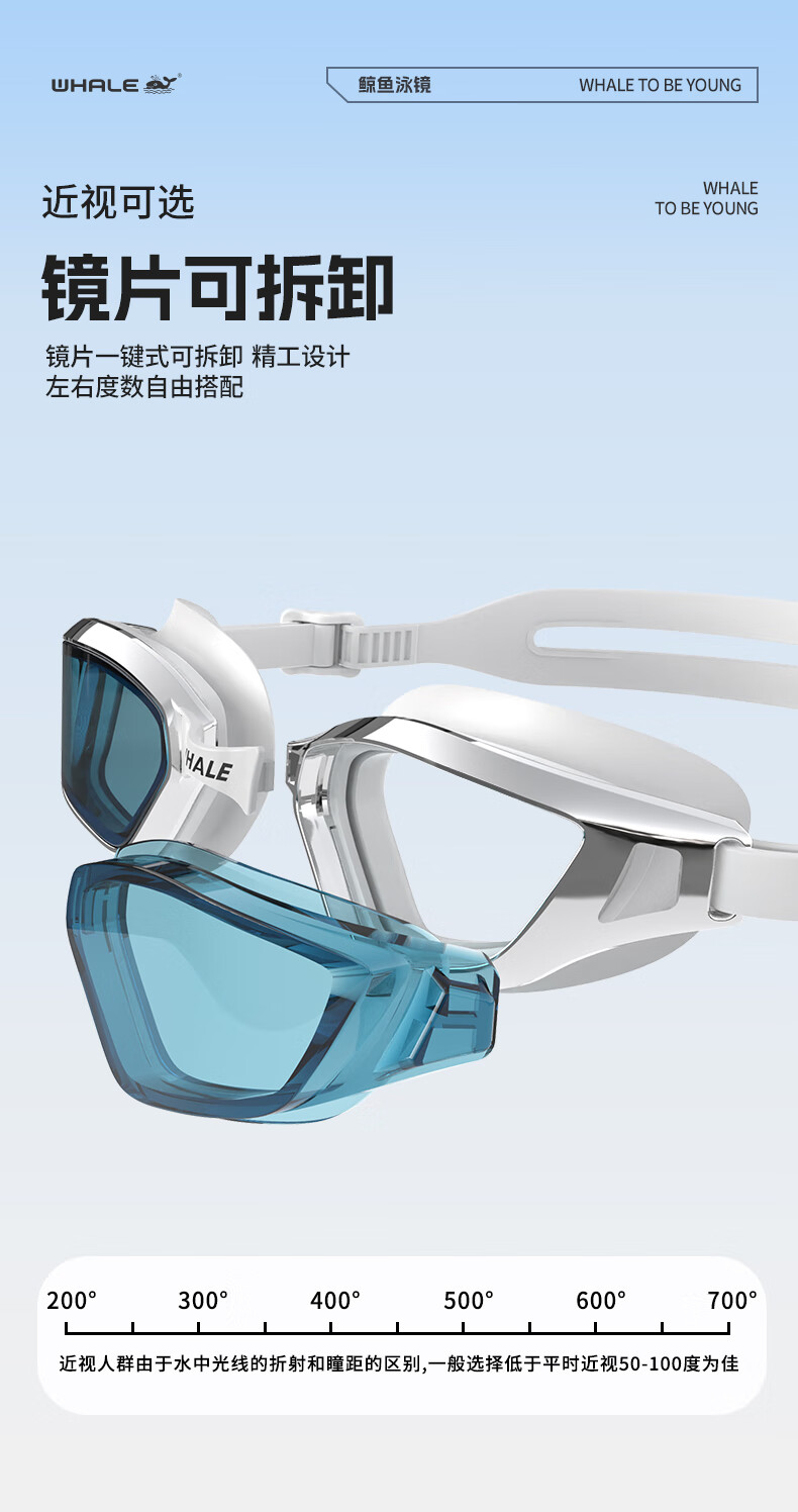 鲸鱼N1防雾泳镜可拆卸镜片999天起雾换新近视可选度数游泳眼镜男女 闪亮银【高清镜片】+赠泳帽