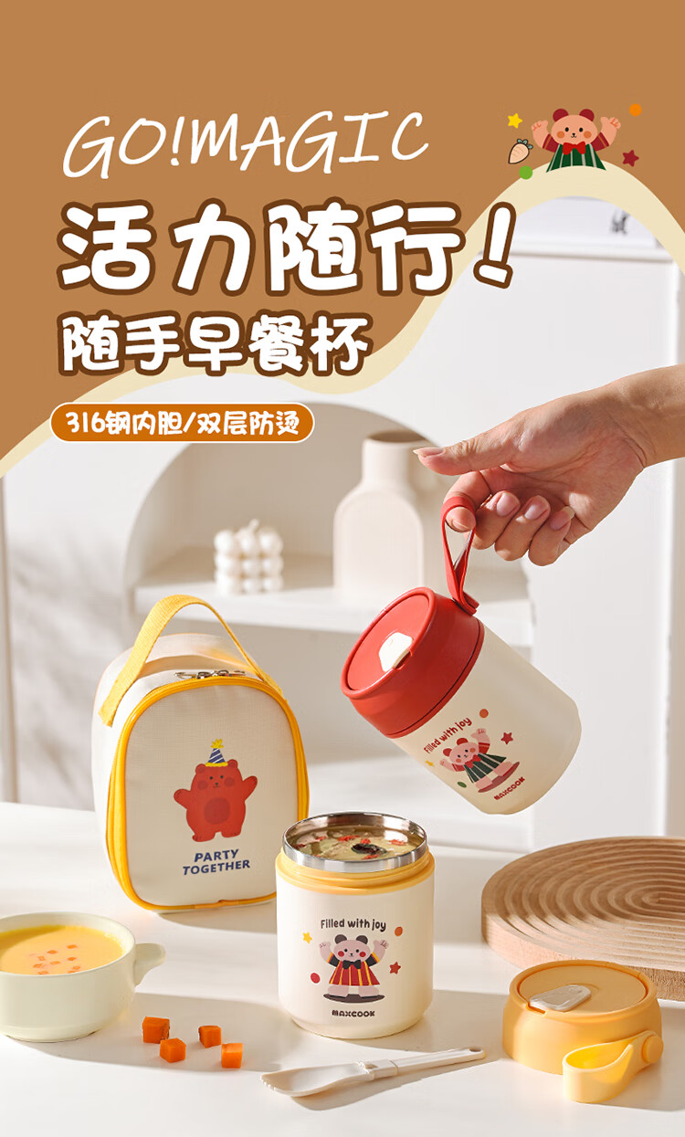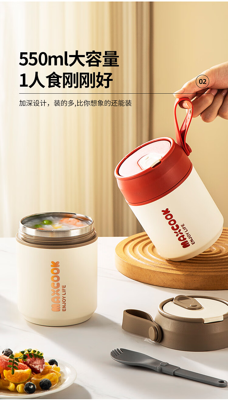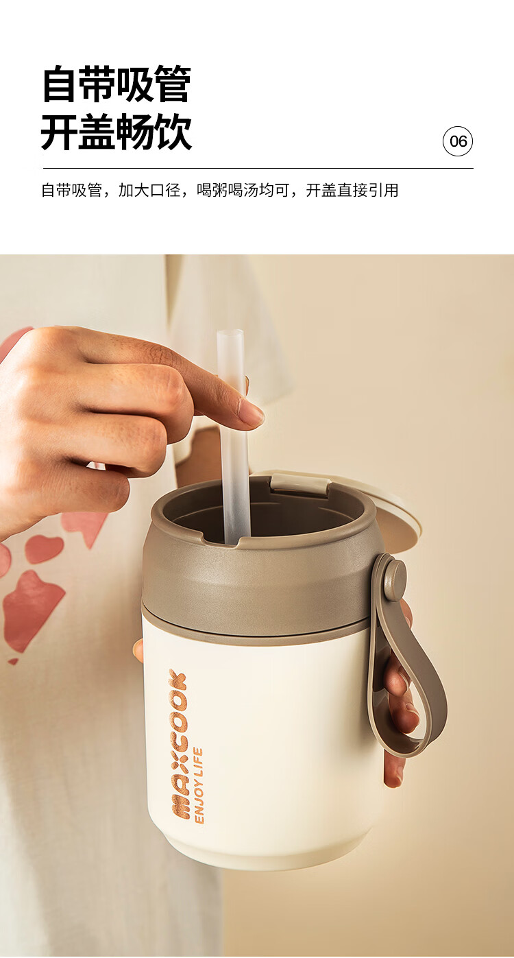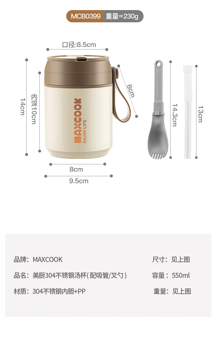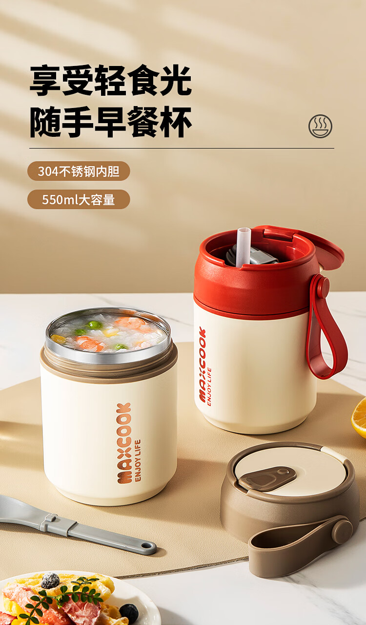 美厨(MAXCOOK)304不锈钢早餐杯豆浆燕麦片杯带盖勺外带便携不锈钢汤杯保温饭盒 高雅灰 杯+勺+吸管MCB0399550ml