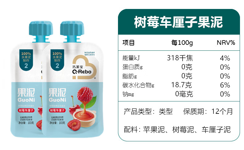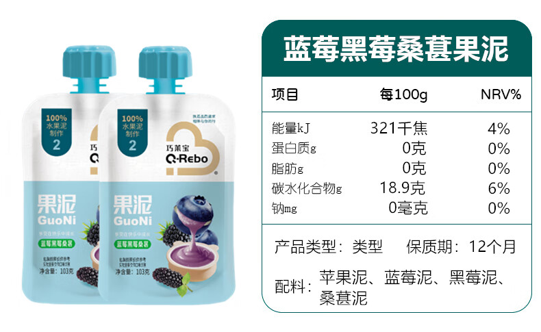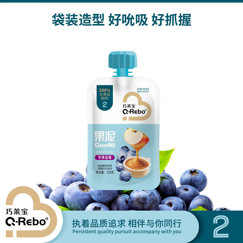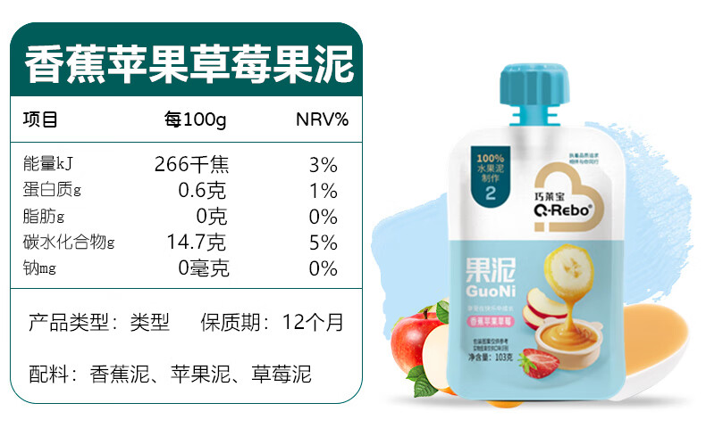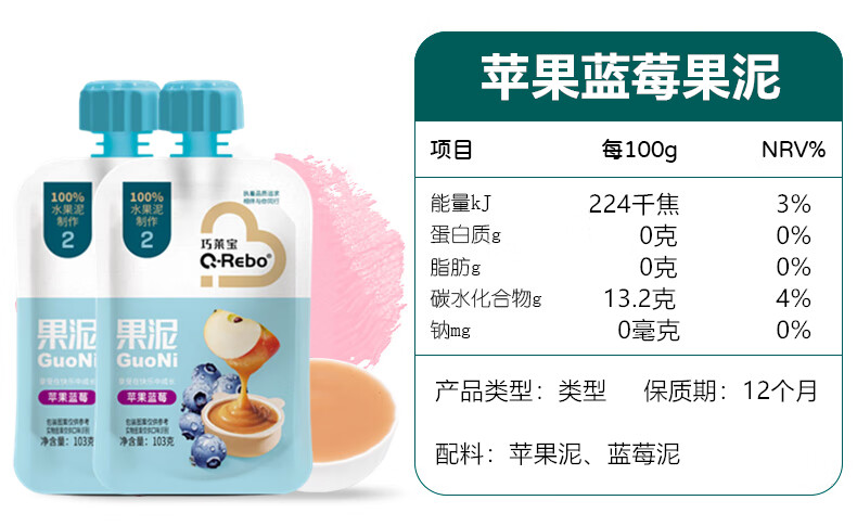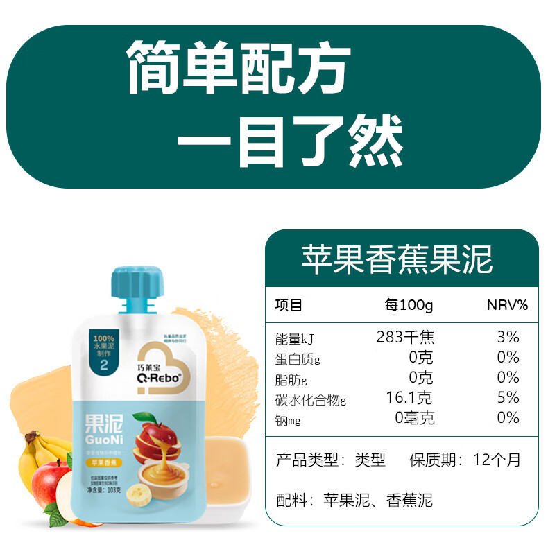 巧莱宝新升级果泥103g/袋 苹果香蕉多口味混合果泥 纯纯营养果泥 103g*1袋 五口味各1袋