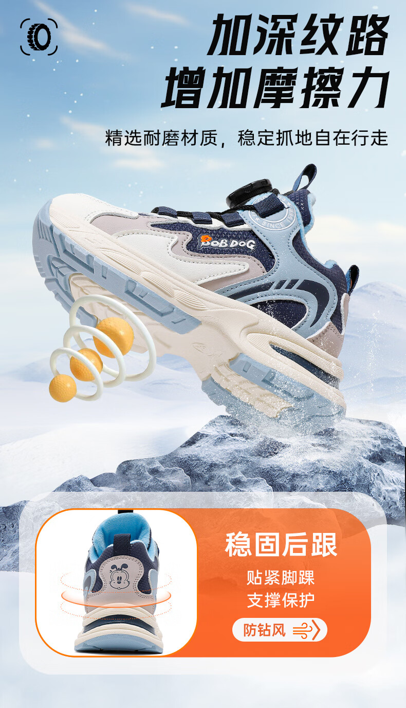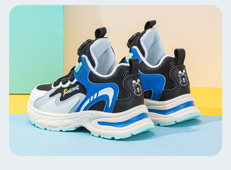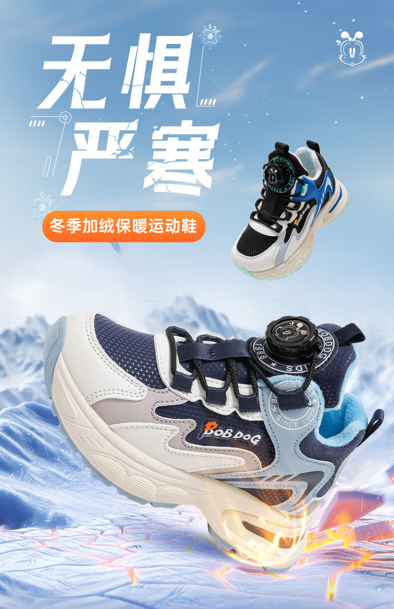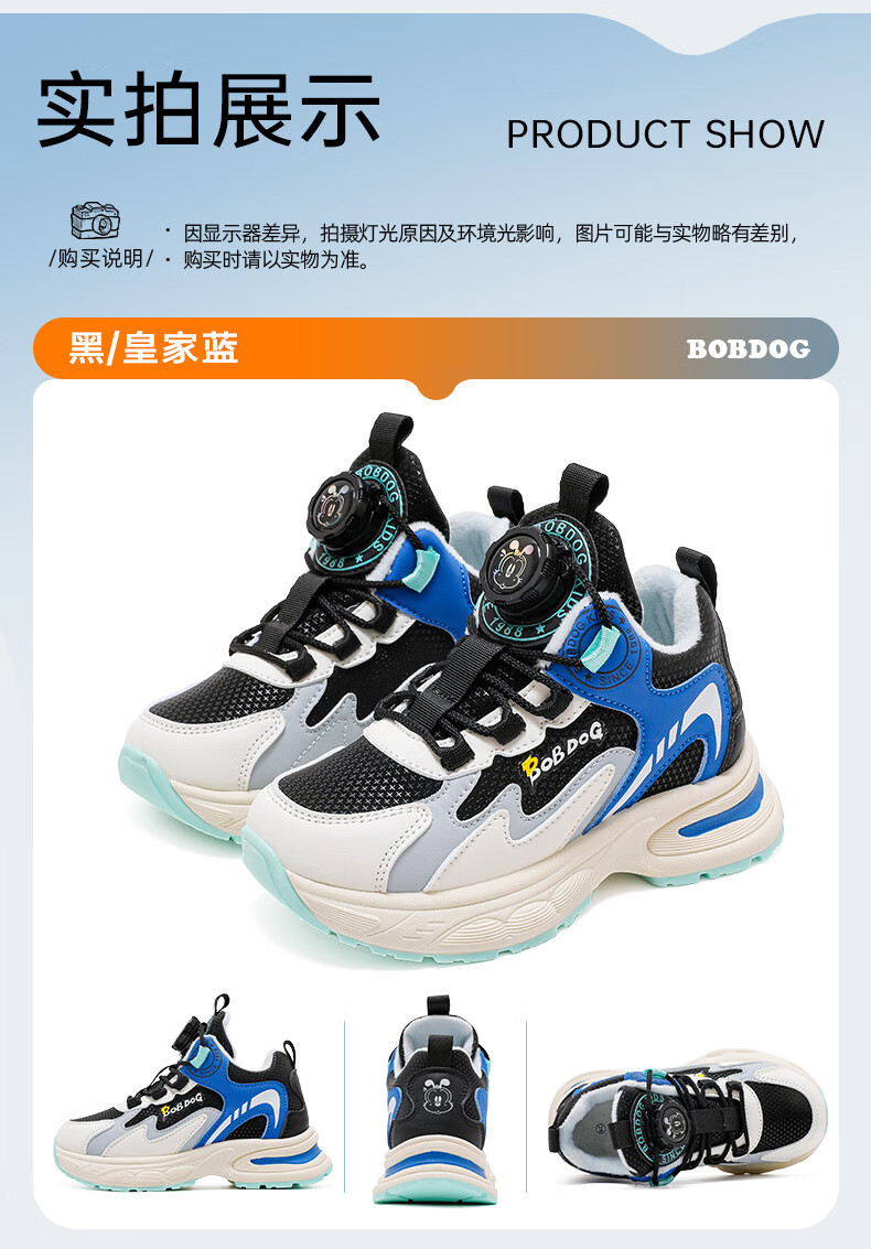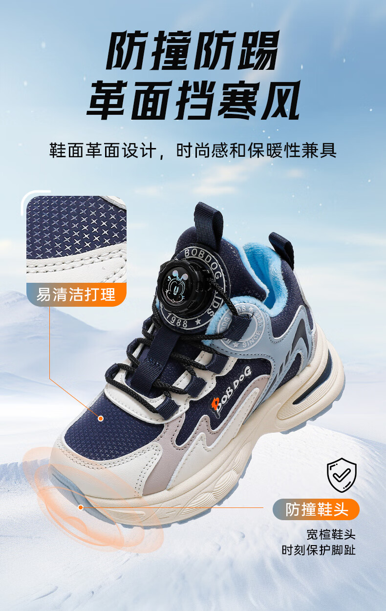 巴布豆童鞋男童冬季新款老爹鞋加绒保暖旋钮扣儿童运动鞋休闲百搭跑鞋 藏青蓝/米 32 适合脚长19.8cm