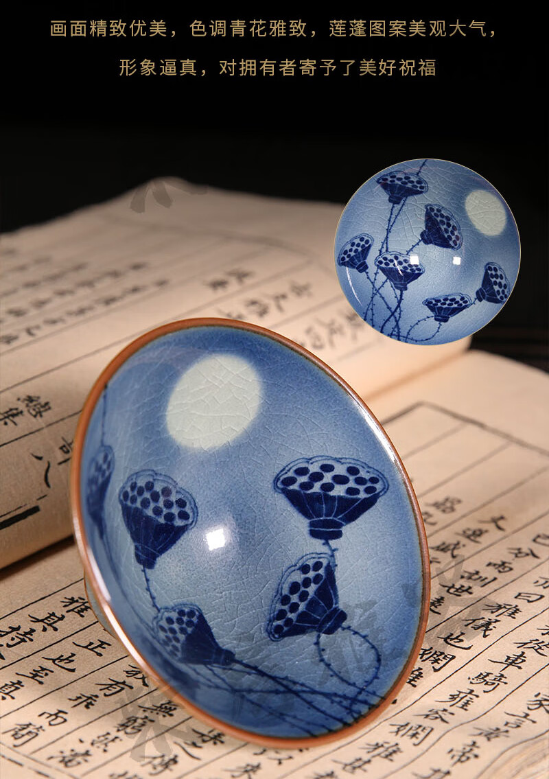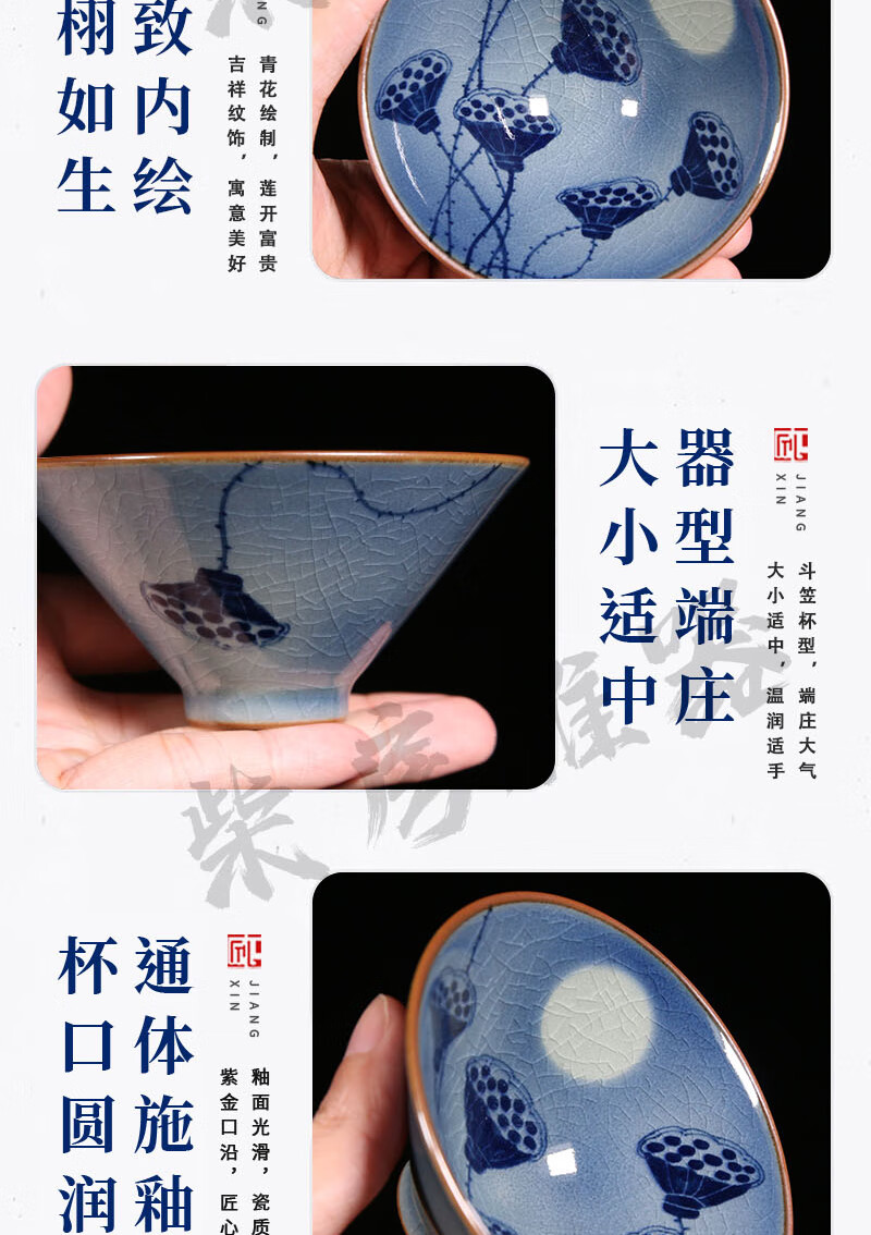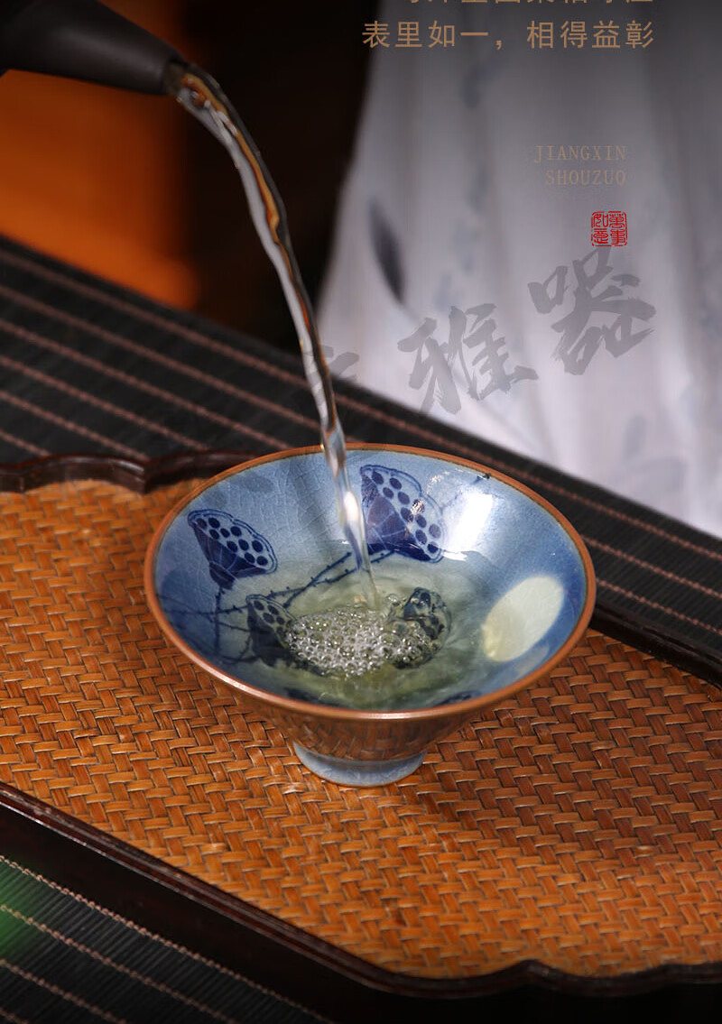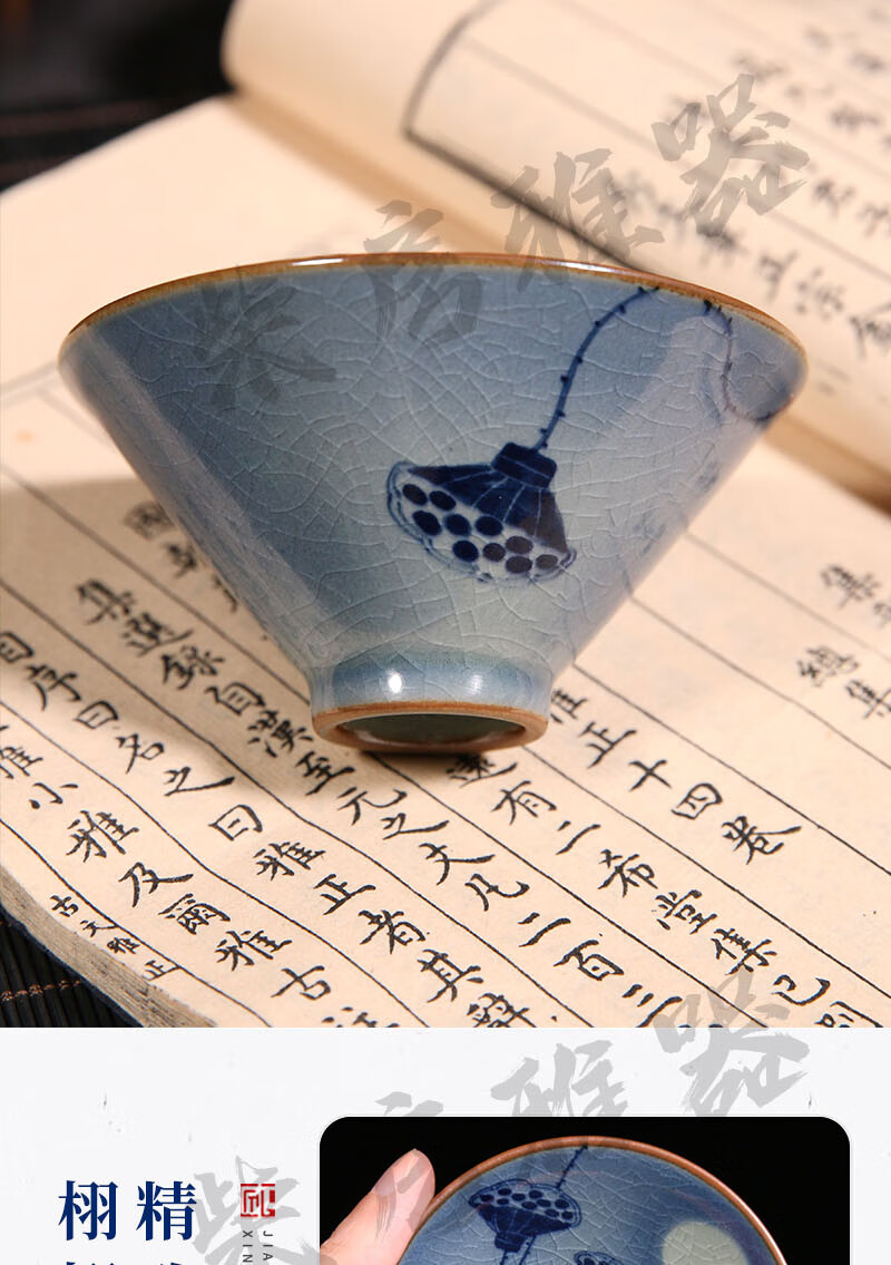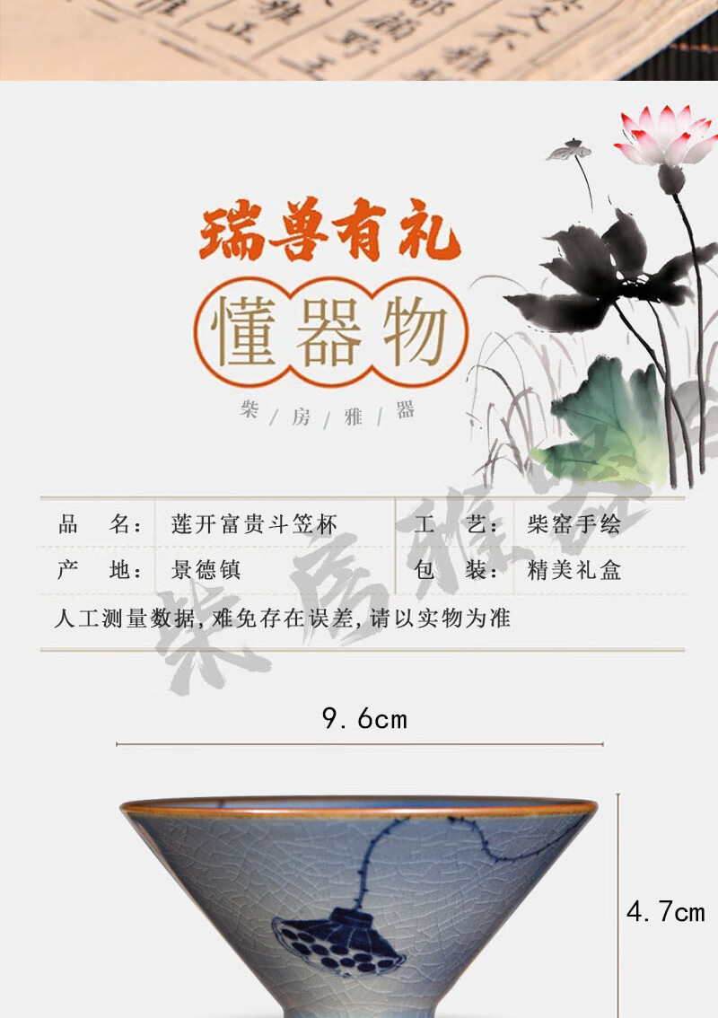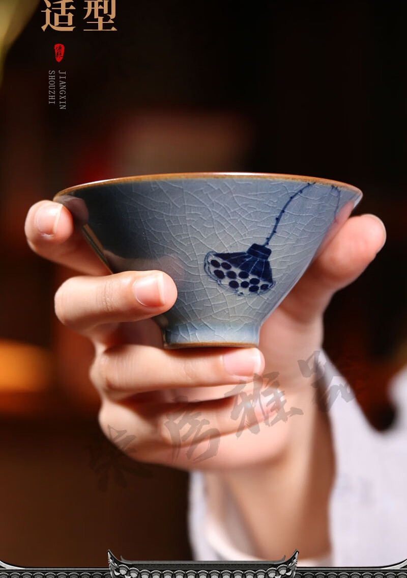 【柴房雅器】莲开富贵柴窑斗笠杯主人杯斗笠杯纯手工青花斗笠杯 莲开富贵斗笠杯