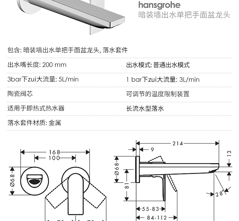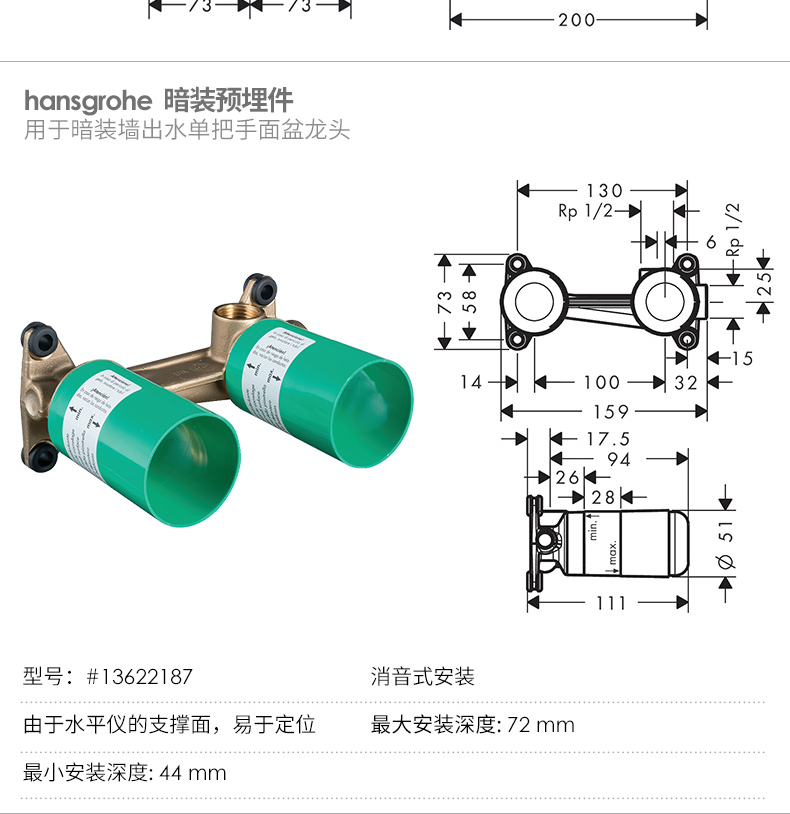 汉斯格雅(Hansgrohe)入墙式冷热水龙头芮碧偲E暗装洗脸盆单孔卫生间墙出水面盆龙头 芮碧E暗装龙头 (72568007龙头+13622187阀芯)