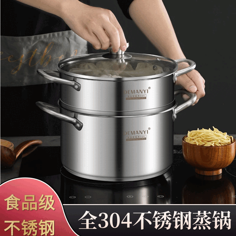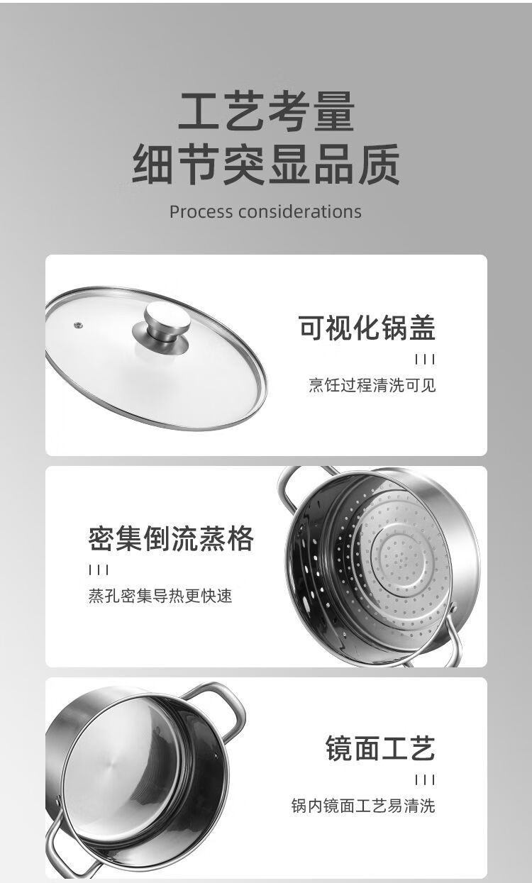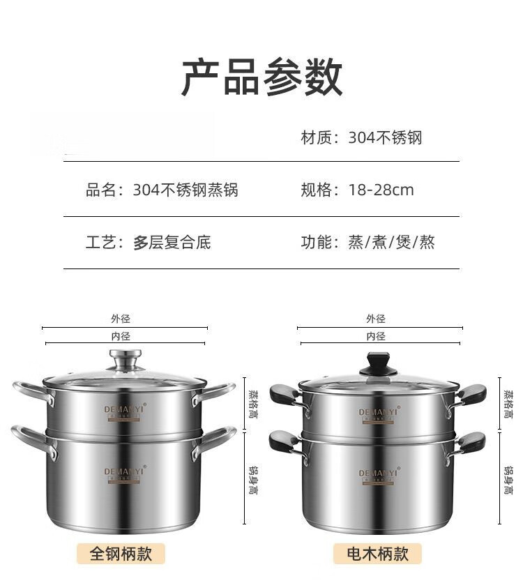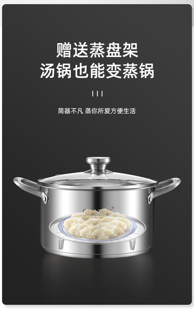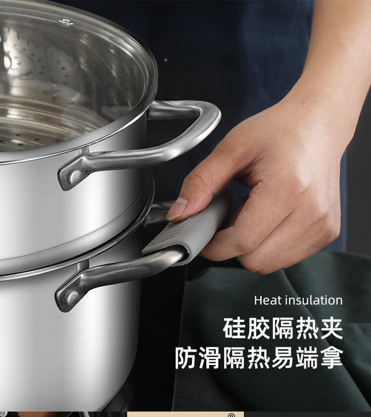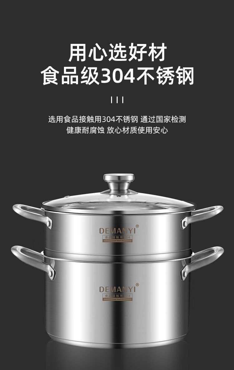 兰琦欧加厚304不锈钢小蒸锅双层家用汤锅蒸煮炖小型蒸笼电磁炉燃气灶用 26cm双层 1cm 全钢柄