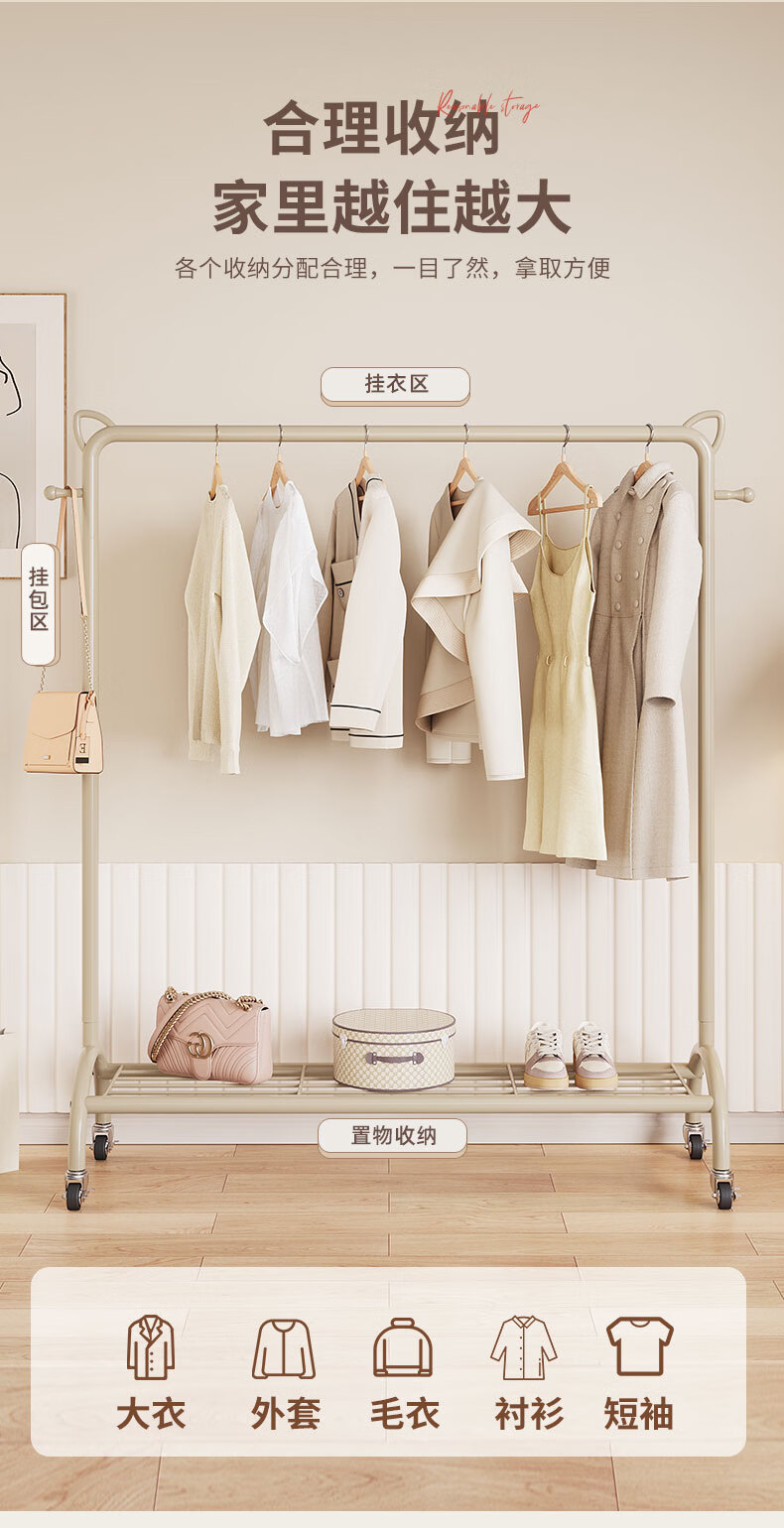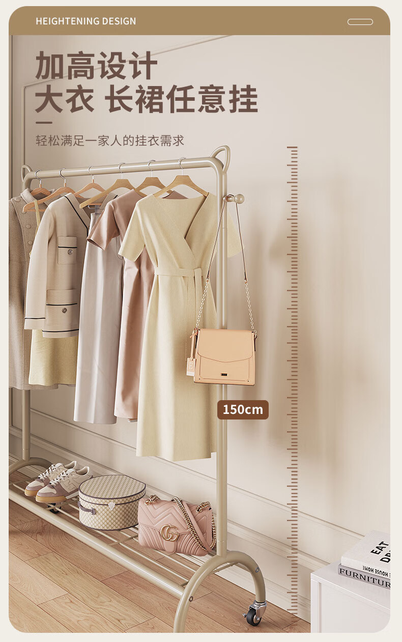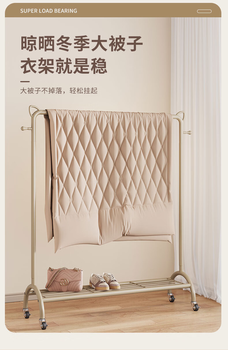 咏幻加粗晾衣架移动挂衣架杆落地卧室内家用儿童房间衣服收纳置物架子 轻奢金6 0【22加粗管/可挂冬衣】