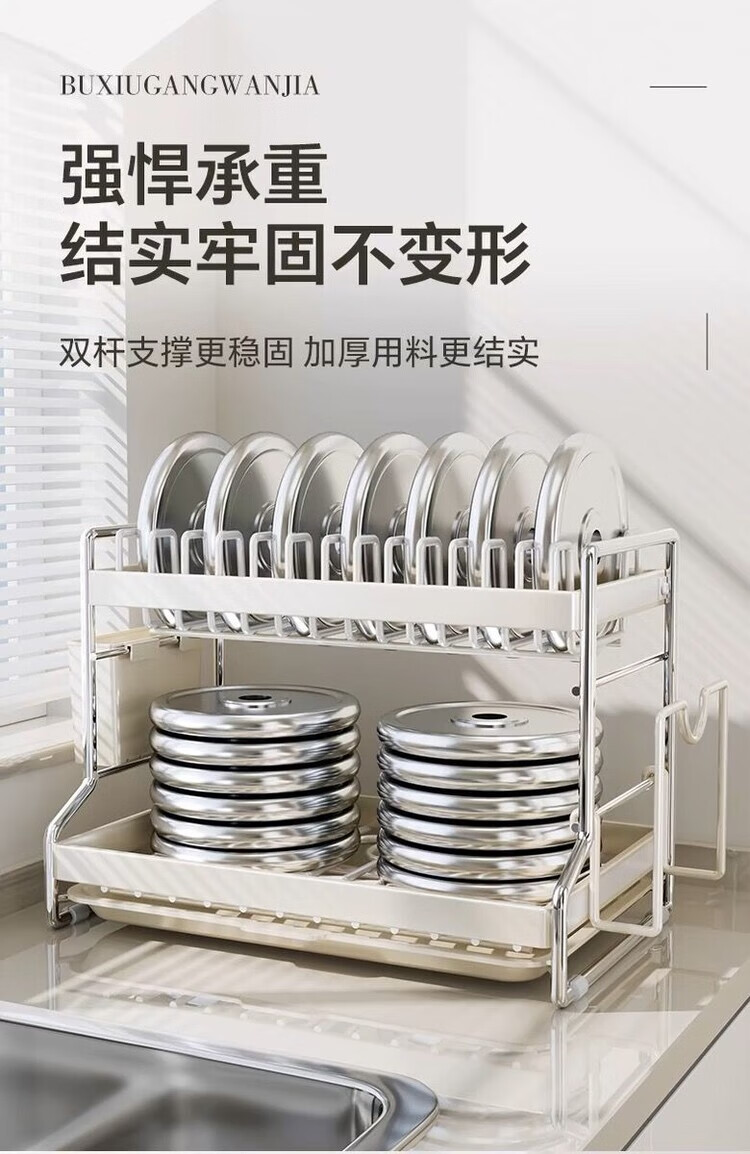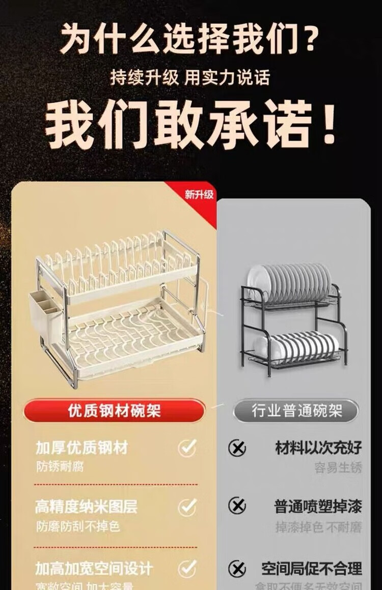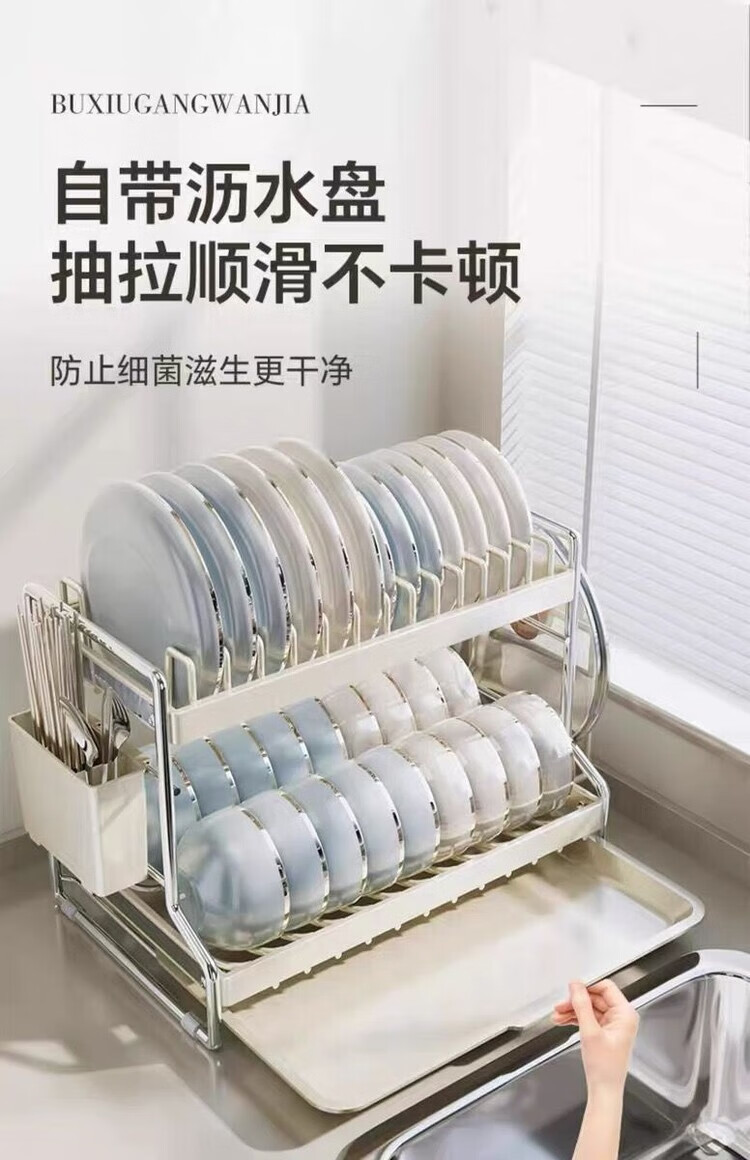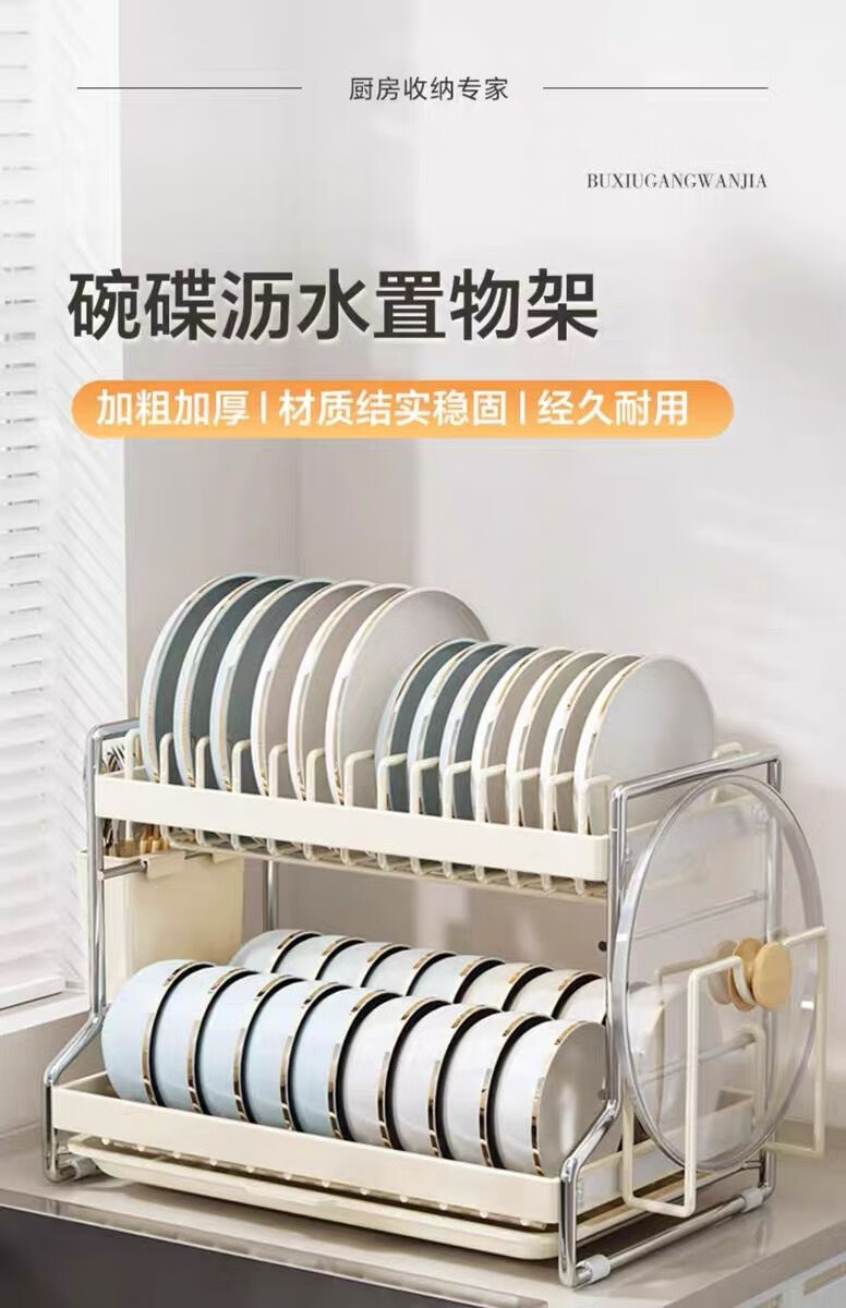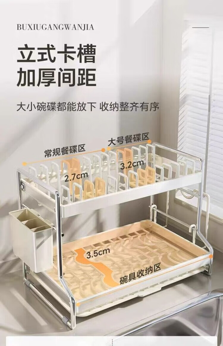 简漾厨房碗架沥水架碗柜置物架家用台面多功能放碗盘碗筷碗碟收纳架盒 双层+防滑脚垫*4 防锈工艺