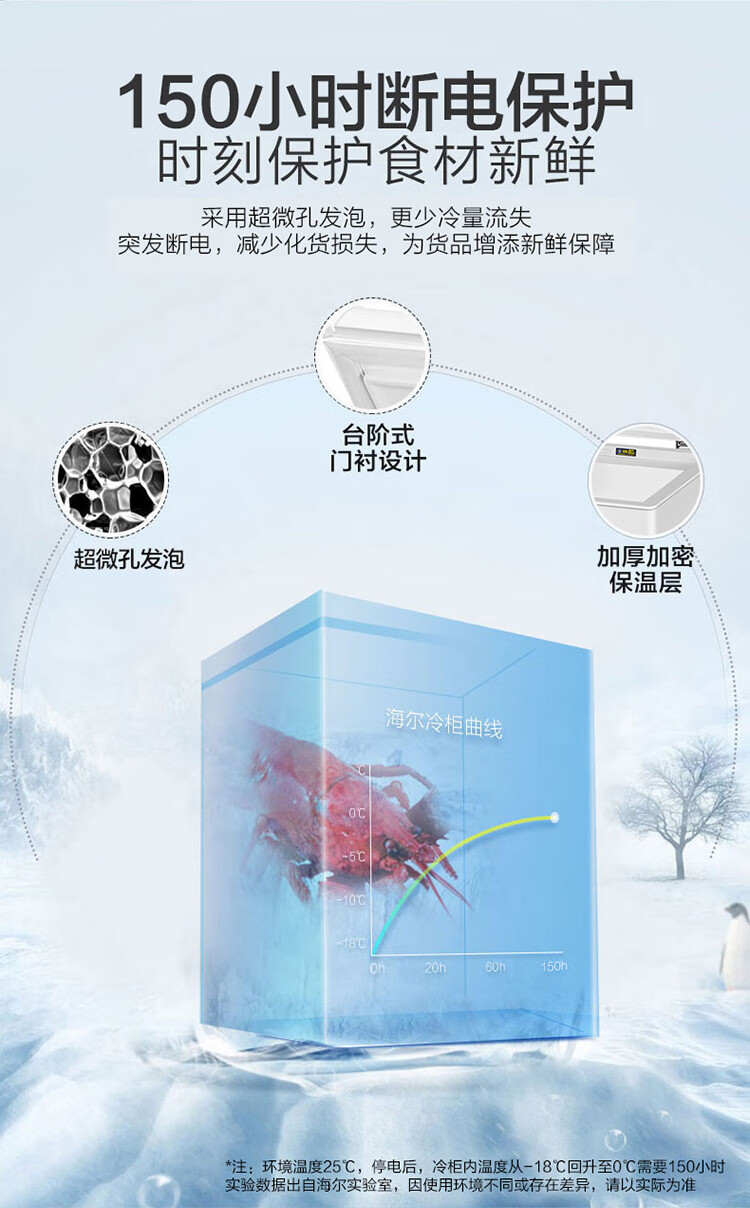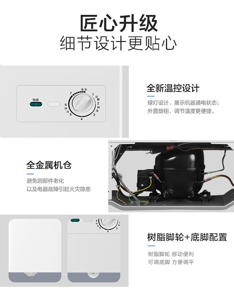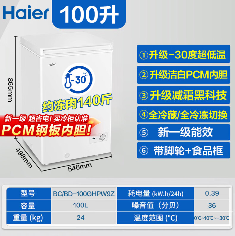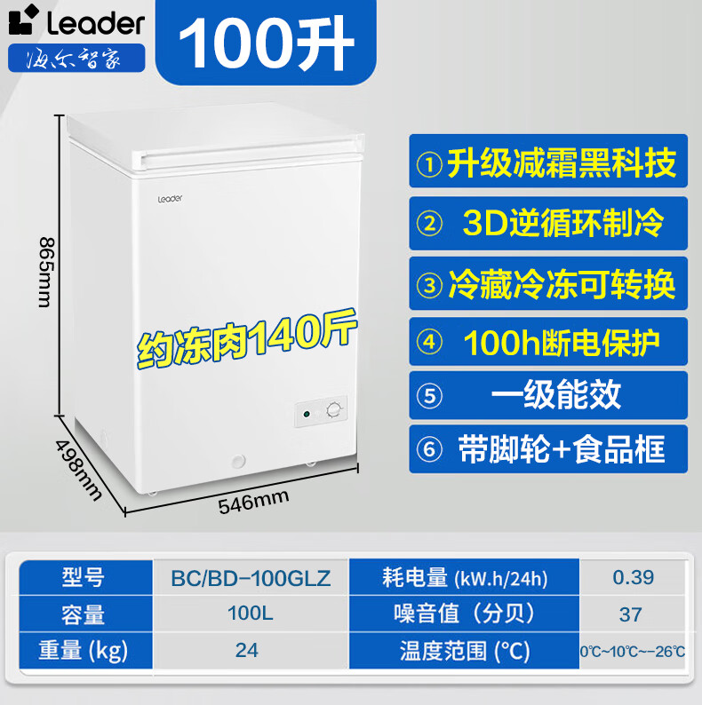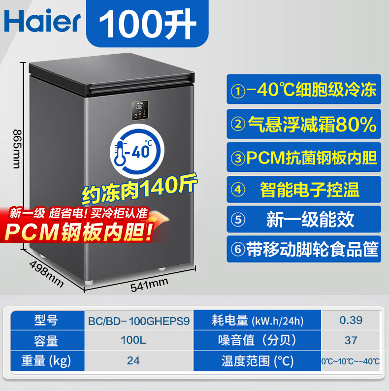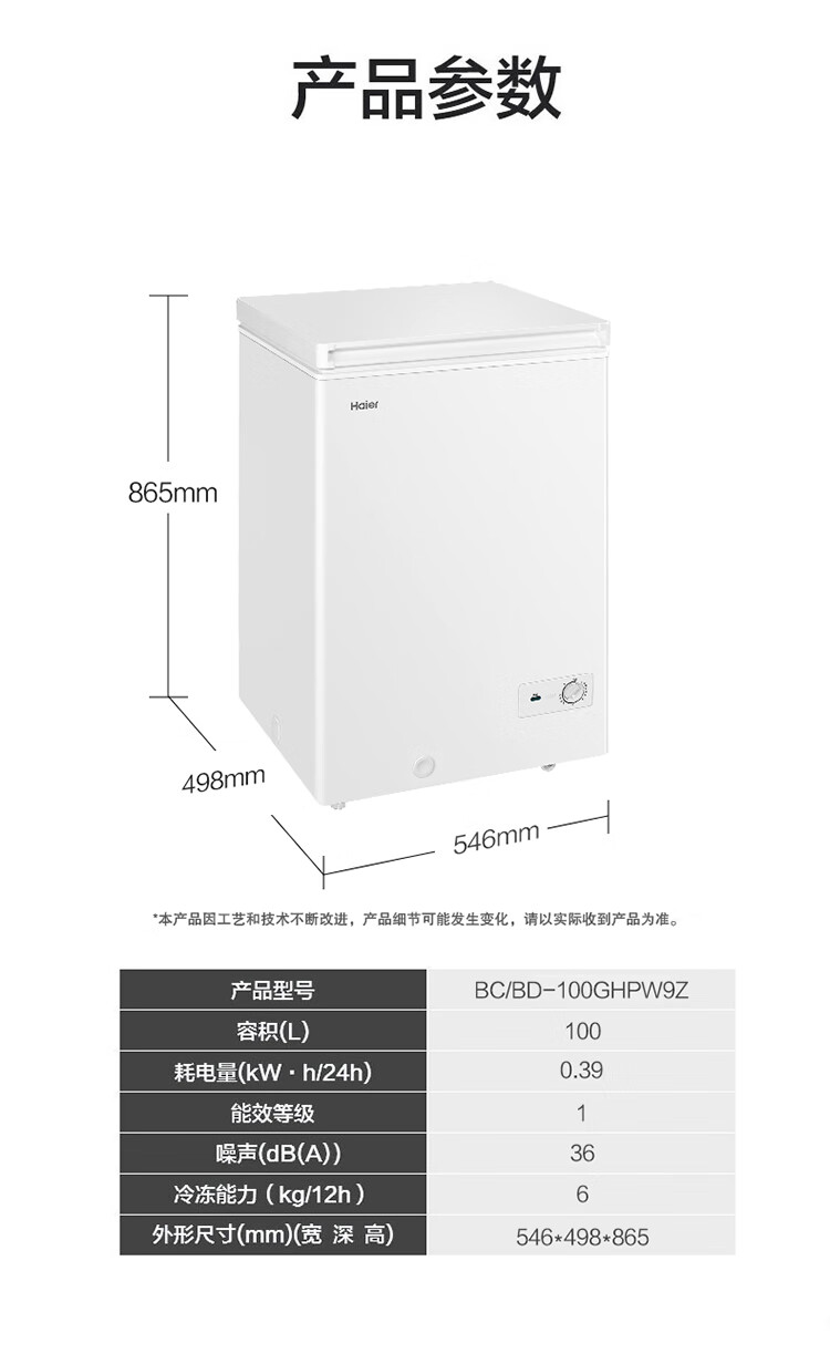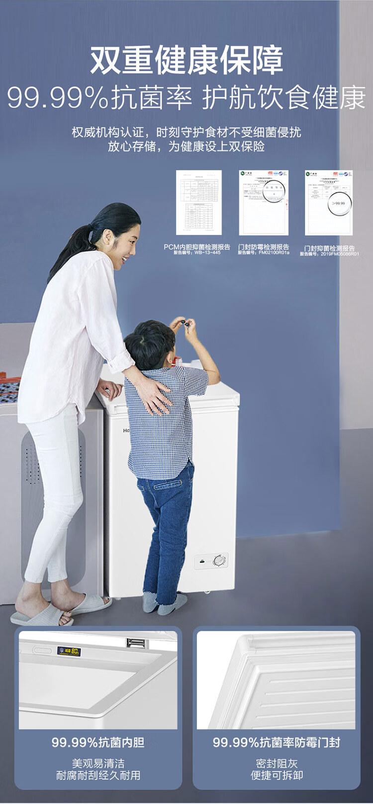 海尔(Haier)出品单温冰柜家用无需频繁除霜一级能效卧式冷藏柜冷冻柜小型迷你冰箱 100升 带脚轮食品筐丨约冻140斤肉Leader