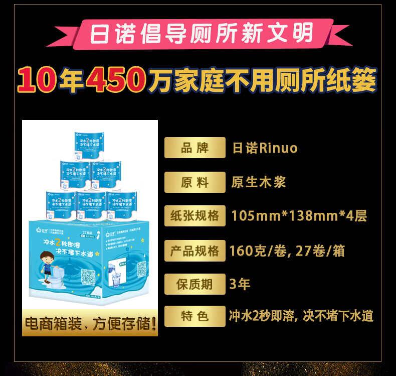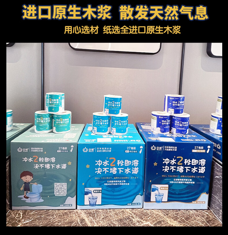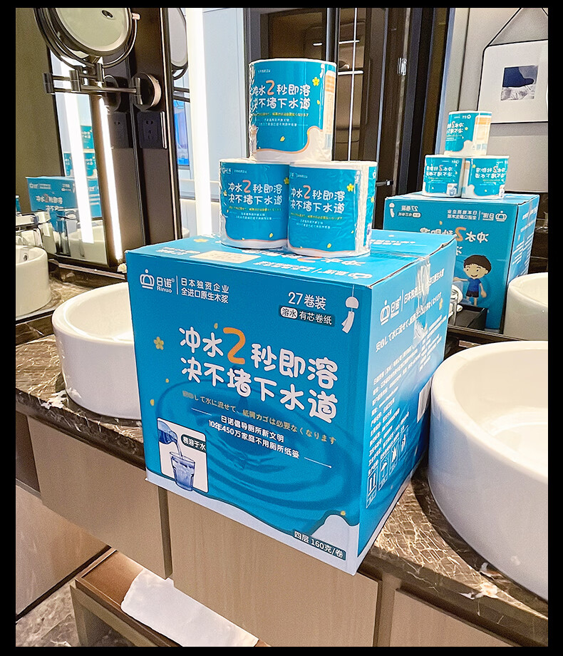 日诺(Rinuo)水溶厕纸溶水卫生纸巾卷筒纸有芯4层 160g*27卷整箱