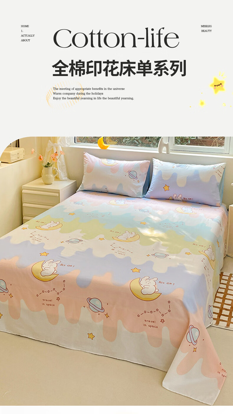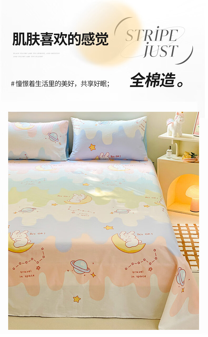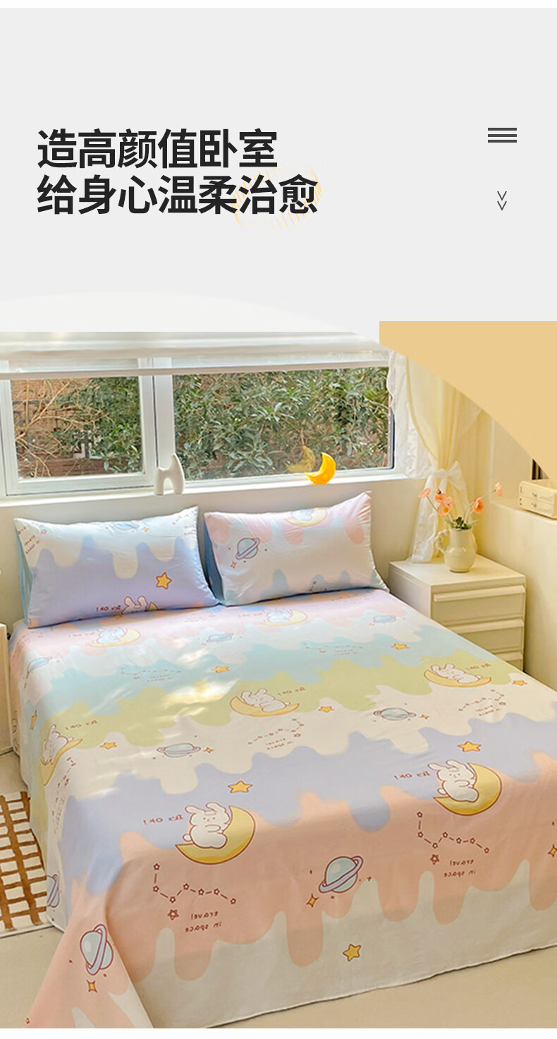 无印良品100%纯棉床单单件全棉宿舍单人床盖被单家用双人裸睡床罩床上用品 月亮兔 【100%全棉 适合裸睡】 160x230cm单床单【适用1.2m床】