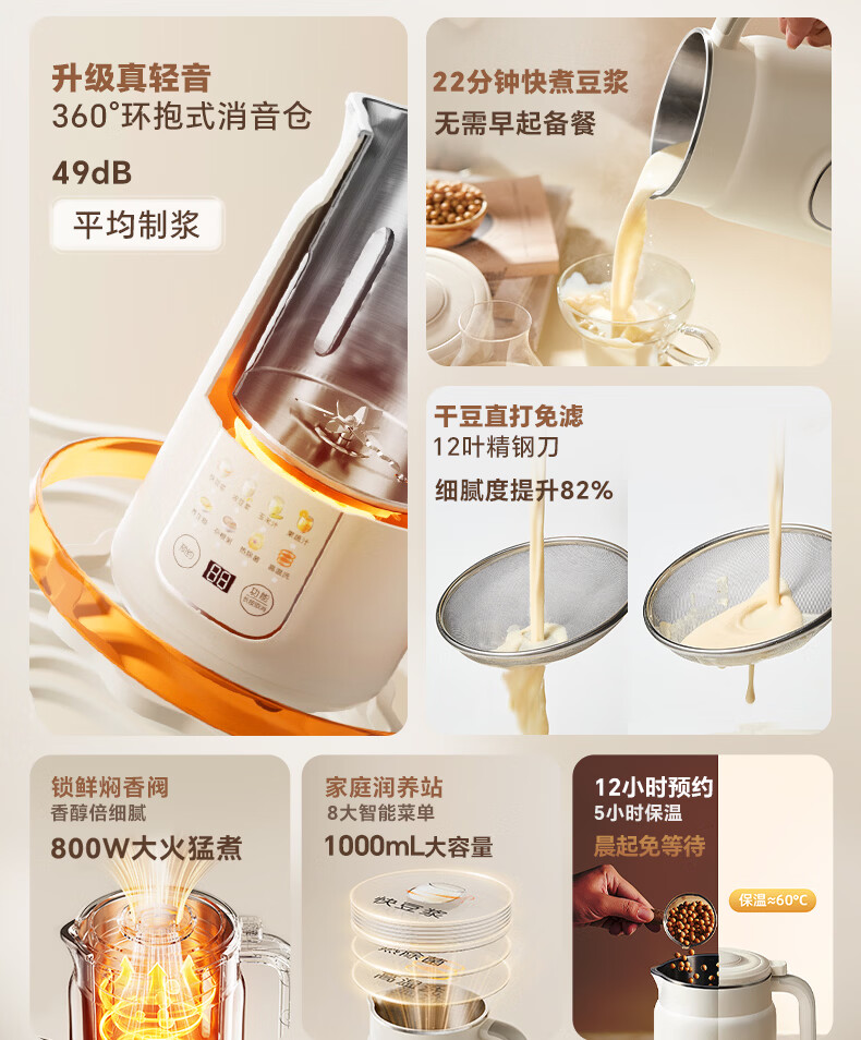 小熊(Bear)白月光豆浆机破壁机家用1L快豆浆大容量3-4人用全自动免煮多功能料理机榨汁机DJJ-H08C1
