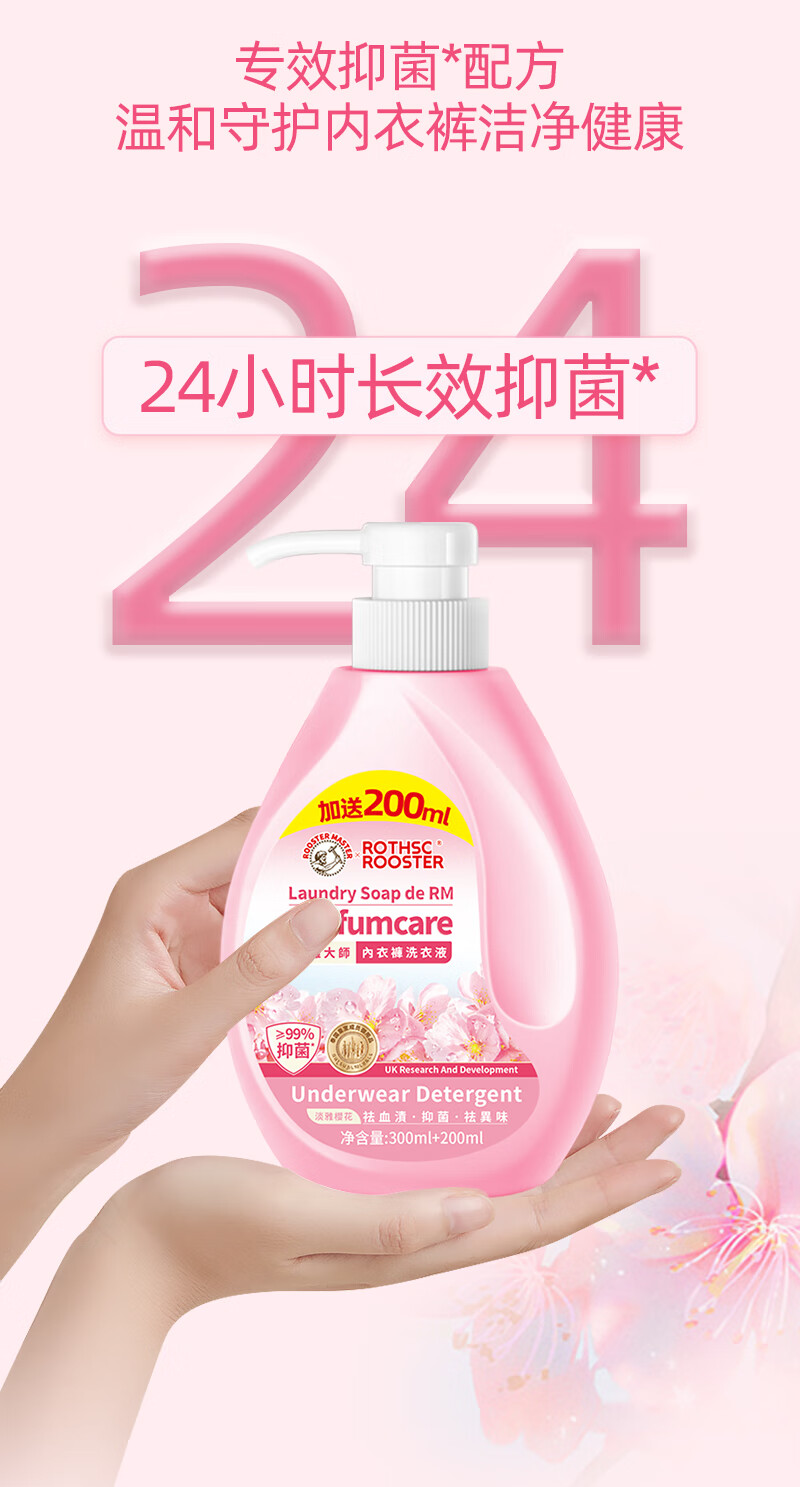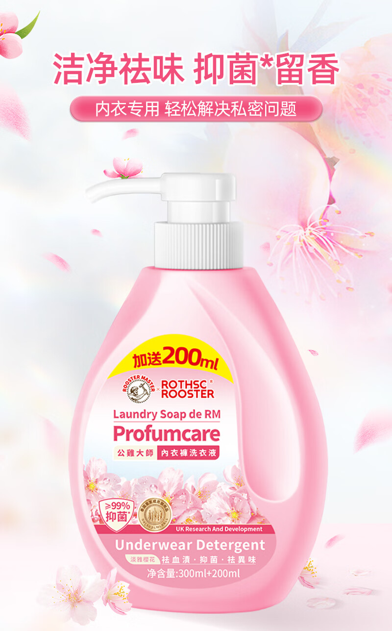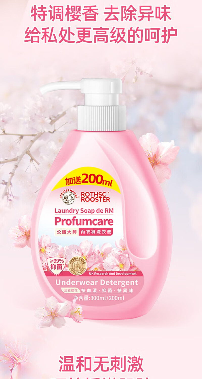 公鸡大师内衣内裤洗衣液手洗去血渍黄污渍除味除螨抑菌樱花香氛500ml 樱花香氛【到手两瓶】 500ml 2瓶