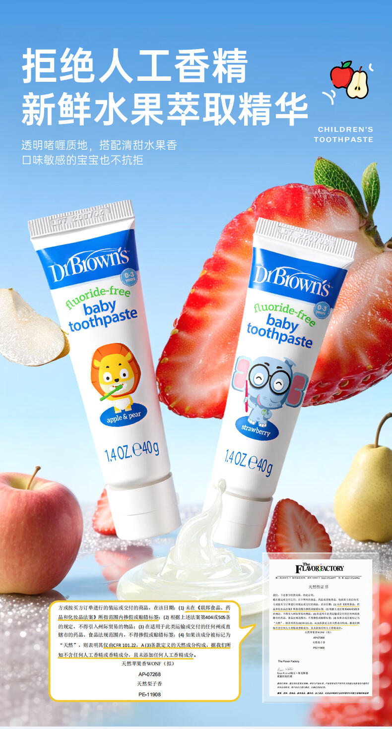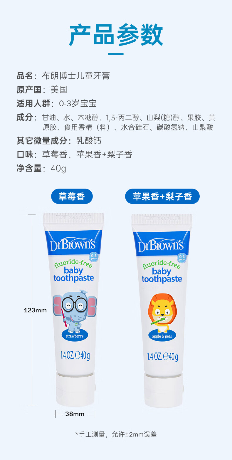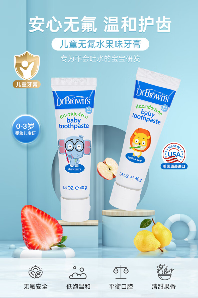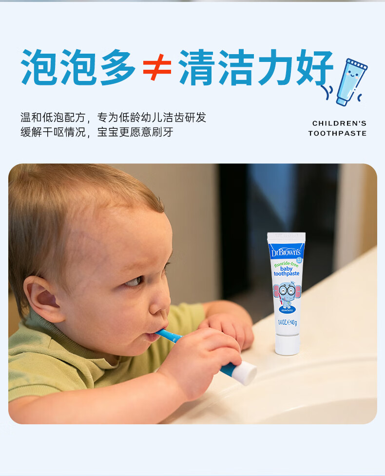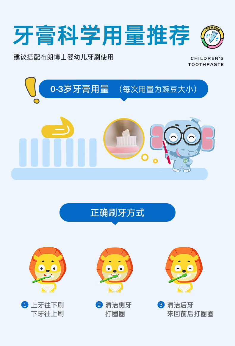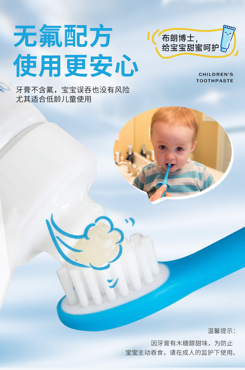 布朗博士儿童牙膏 无氟木糖醇配方防龋齿 0-3岁宝宝婴儿 双口味 牙刷组合 护齿组合1-小象牙膏+小象牙刷