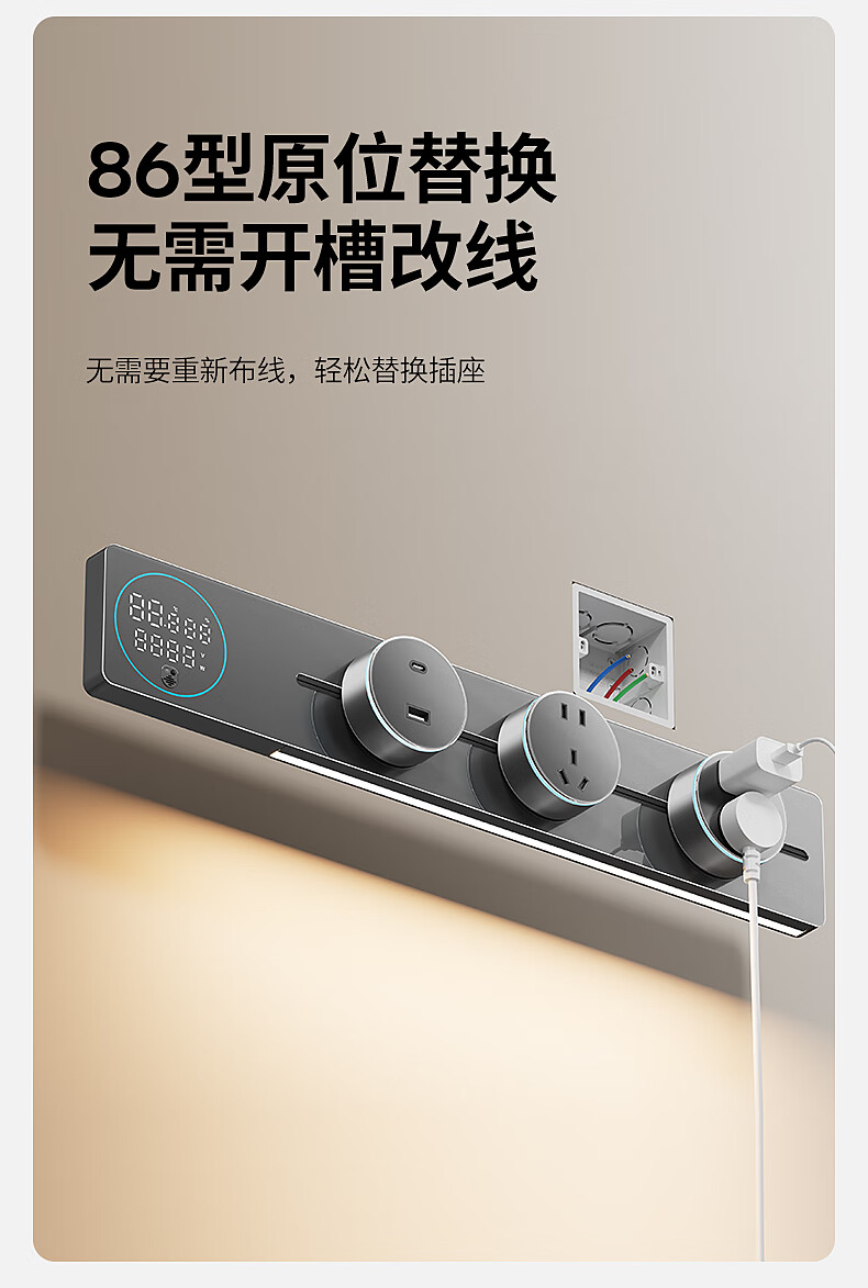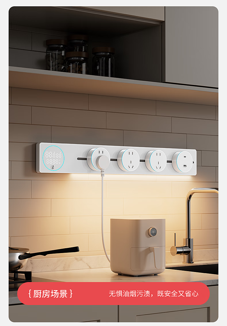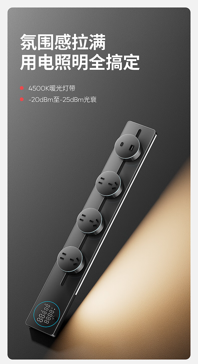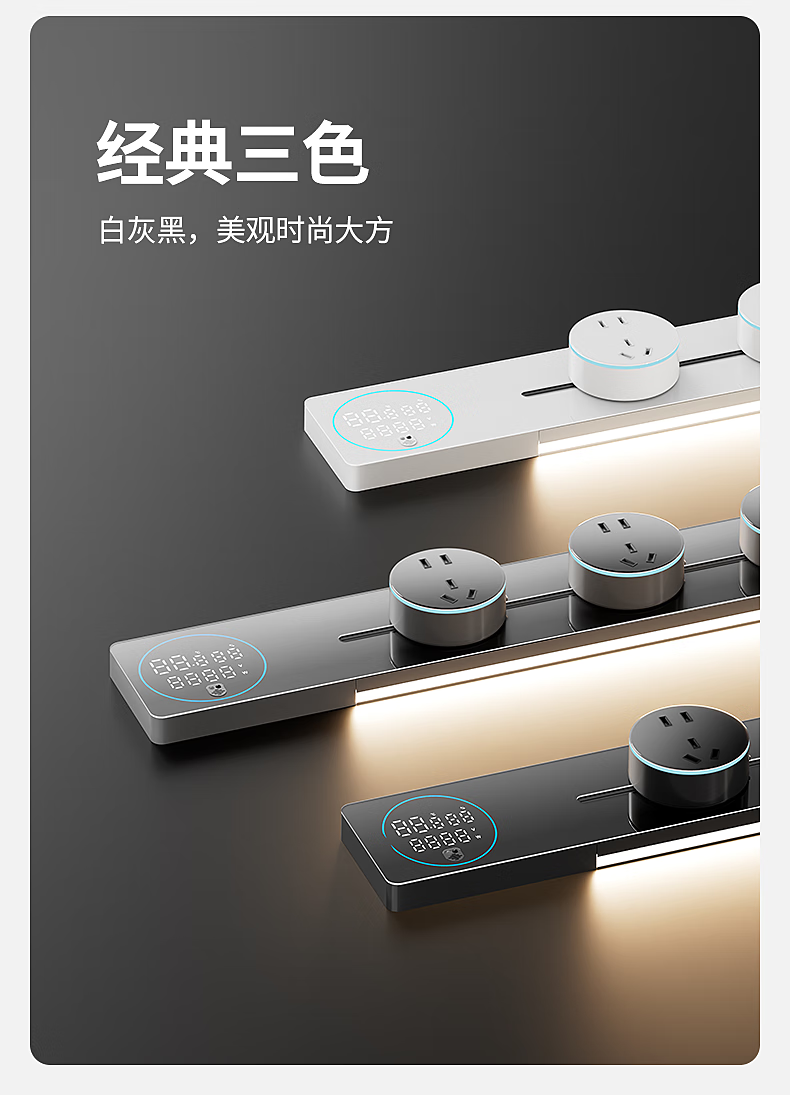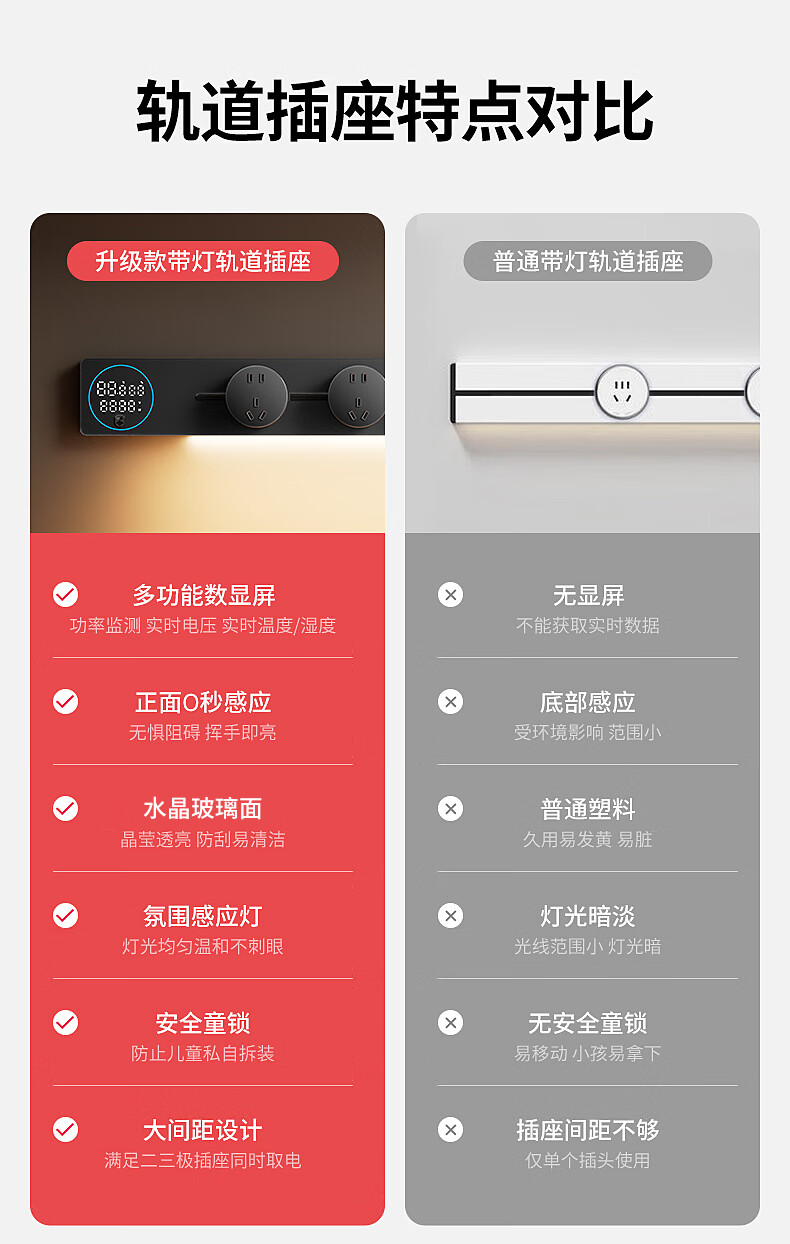 国际电工智能数显屏轨道插座带感应灯明装导轨左右接线家用厨房餐边柜滑轨 灰色 (亚克力感应灯数显轨道)60厘米+5个大五孔
