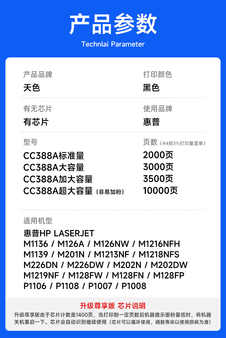 天色CC388A适用惠普m1136硒鼓m126a/nw p1007/1008/1106/1108 m1218nfs m128fn/fp/fw打印机粉盒墨盒