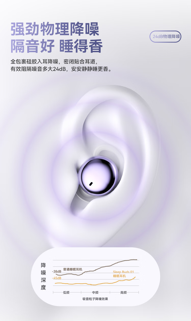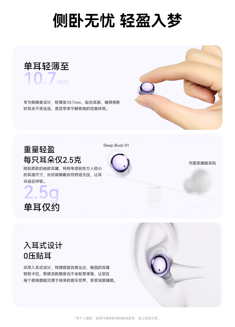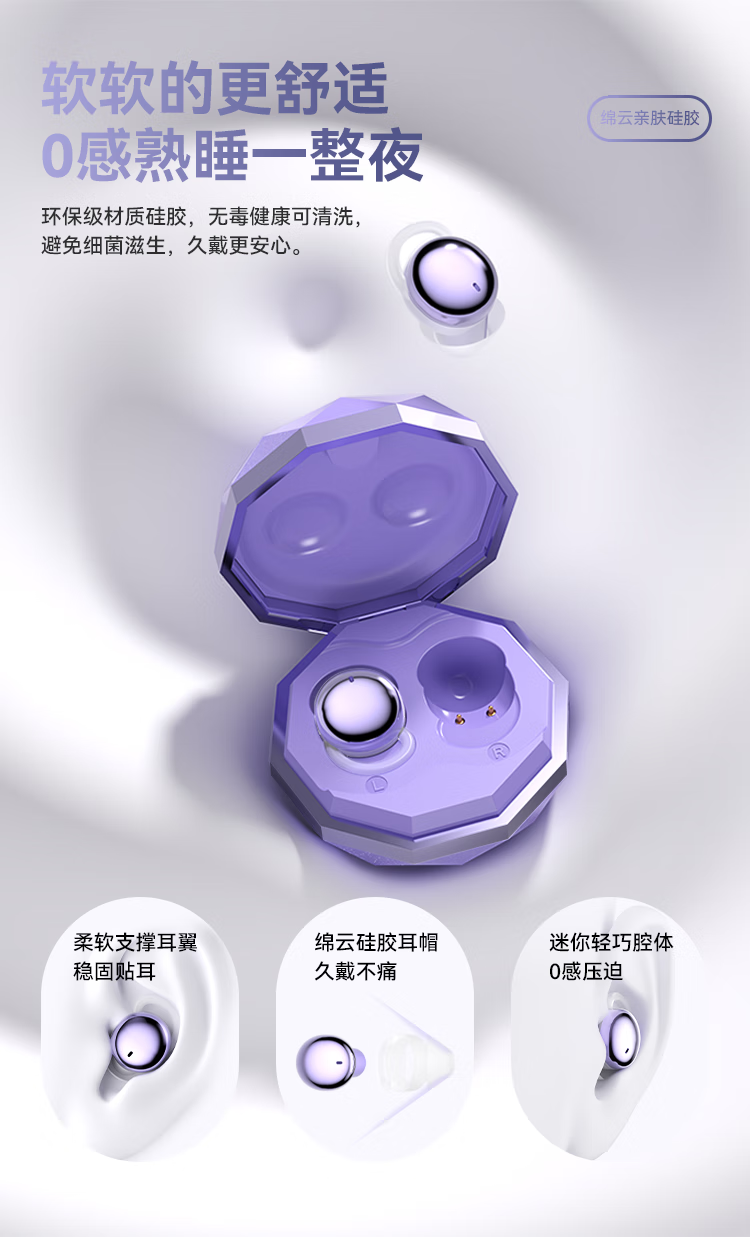 SLUB【2025新款】睡眠蓝牙耳机无线入耳式主动降噪睡觉专用侧睡不压耳asmr迷你耳塞隐形手机通用 梦幻紫【主动降噪|ACS全景音效】