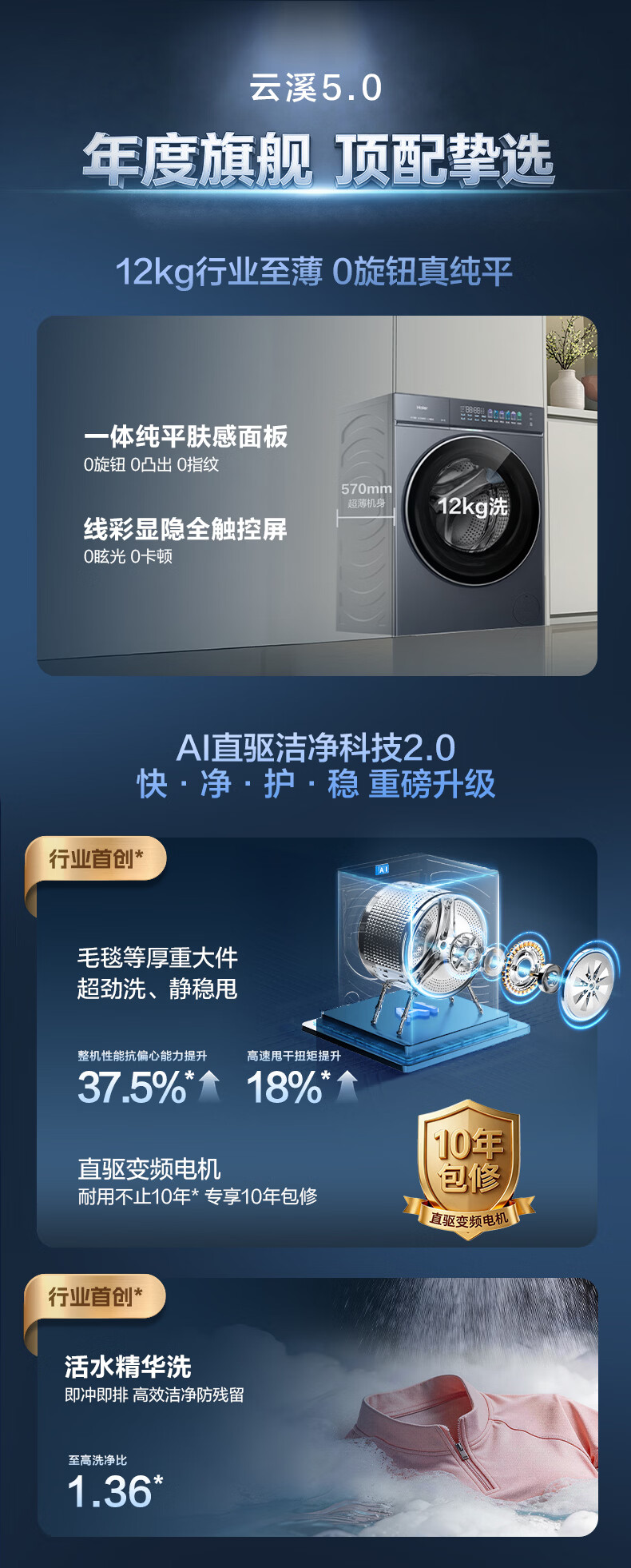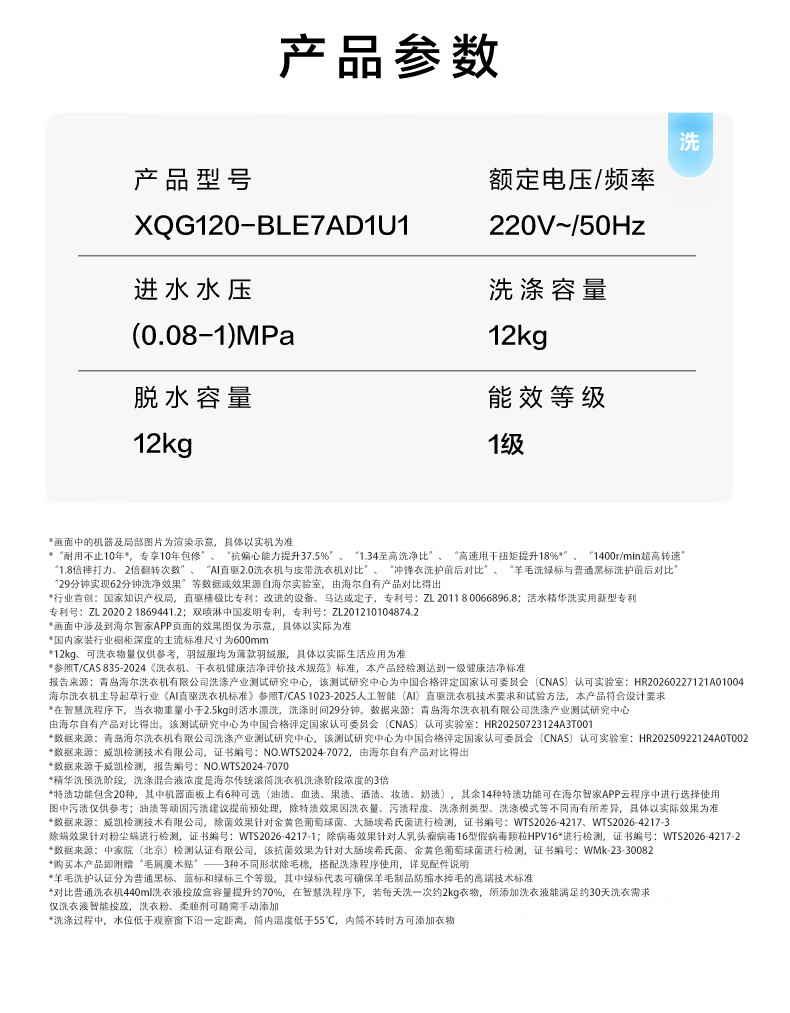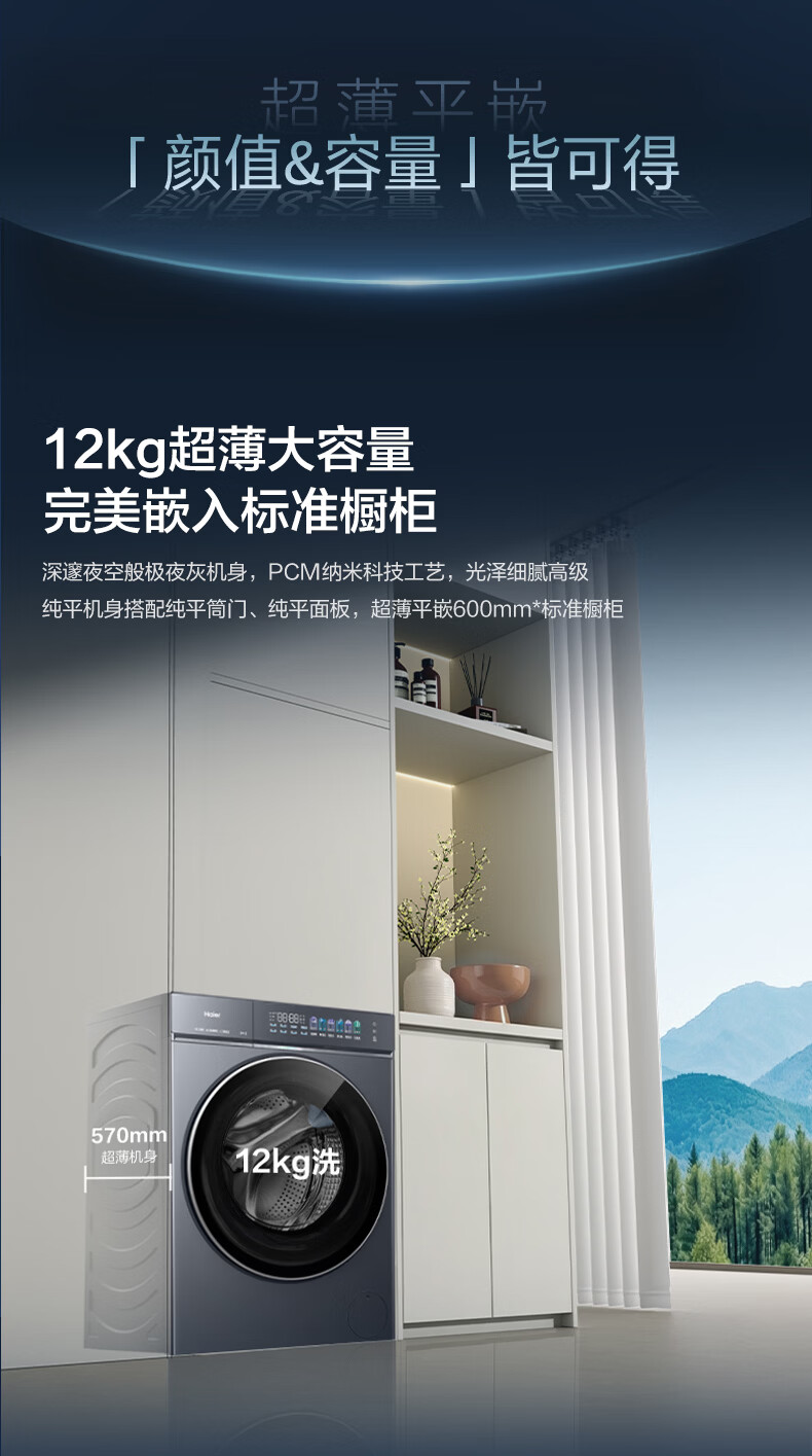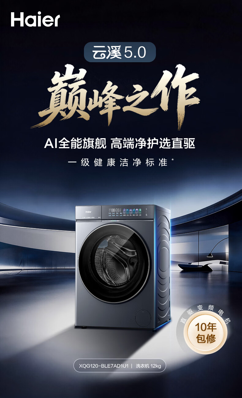 海尔(Haier)云溪5.0 D1 全自动滚筒洗衣机12KG 家用大容量全家筒 AI直驱洁净双效除菌 BLE7AD1U1 全家筒12KG滚筒 单洗